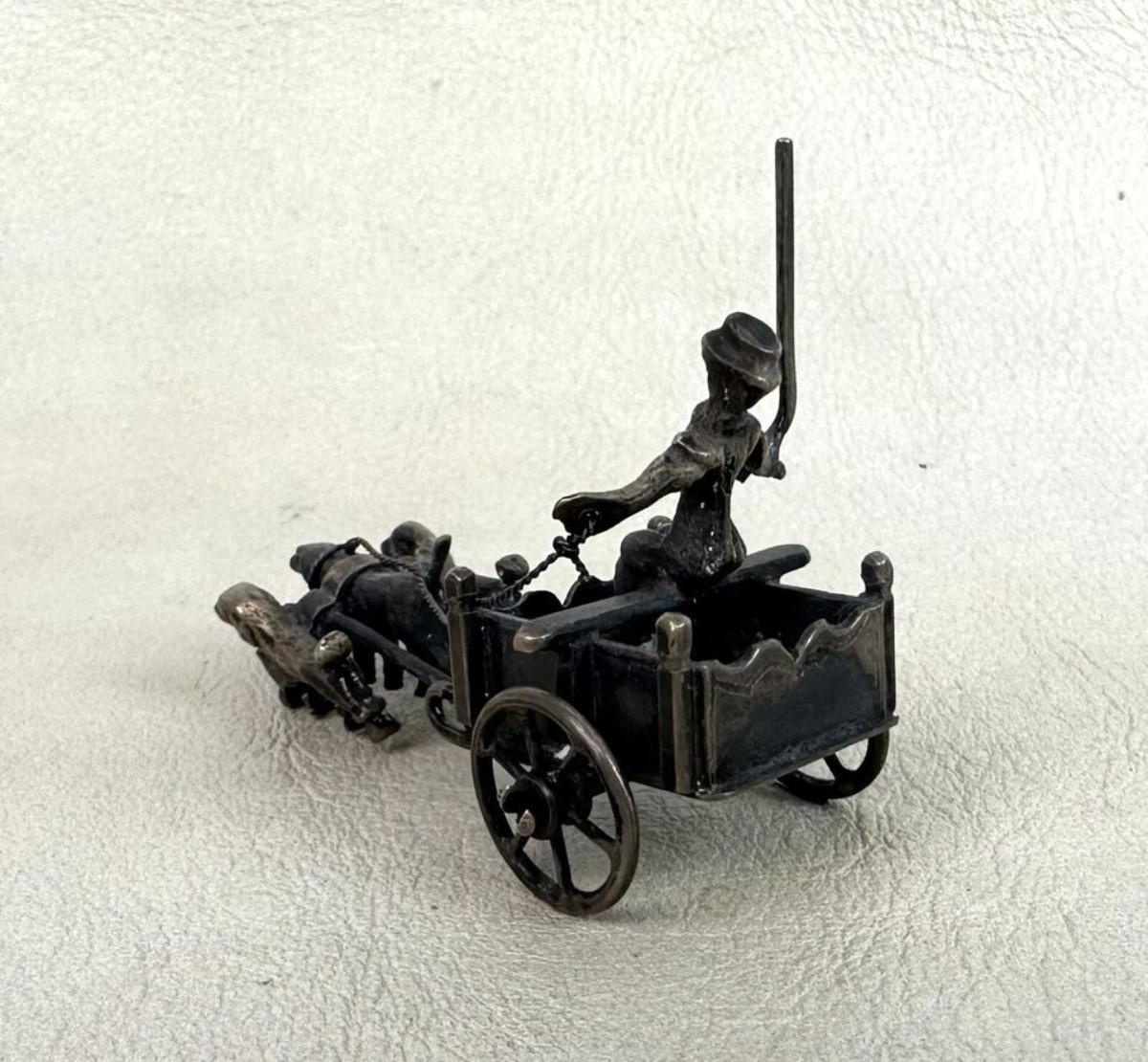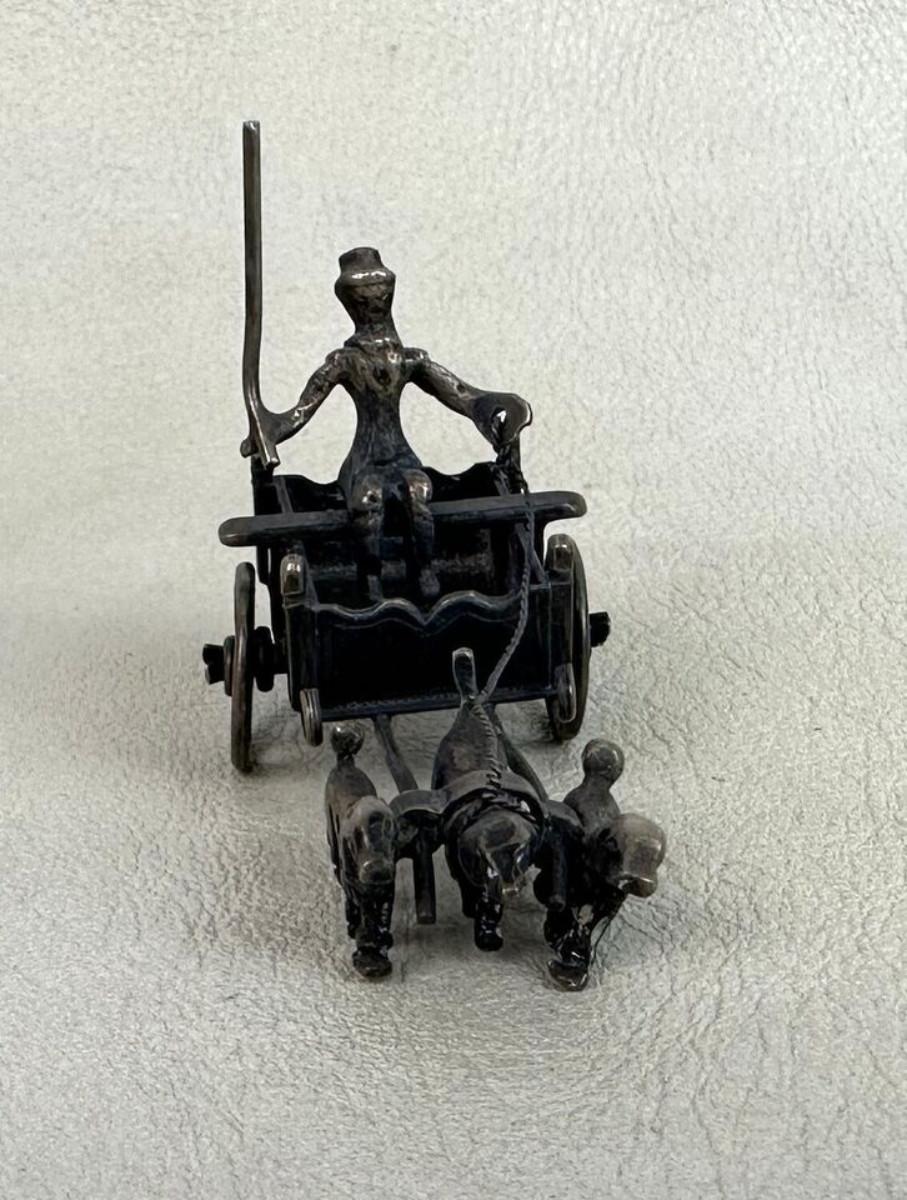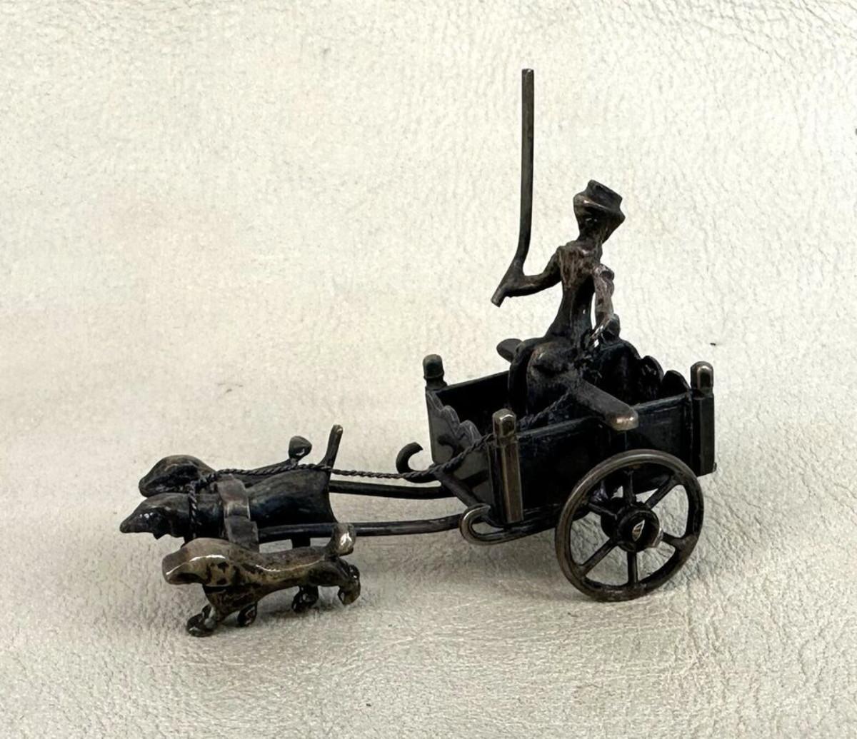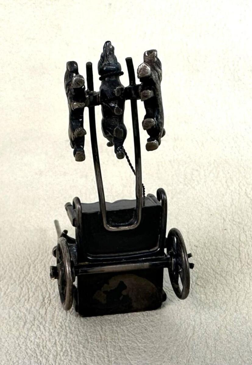 a marvelous antique Dutch silver miniature that we came across at a recent estate with many items from the 19th century...This Dog Cart made in the Netherlands bears the older sword hallmark used on smaller pieces (1814-1904)*..we have left the age patina as is...you will note that one of the dogs is out of alignment..a bend not a break..easily straightened by any jeweler or silversmith..Unusual in that there are three dogs...Measures 48mm x 38mm...1 7/8" x 1 1/2"h..