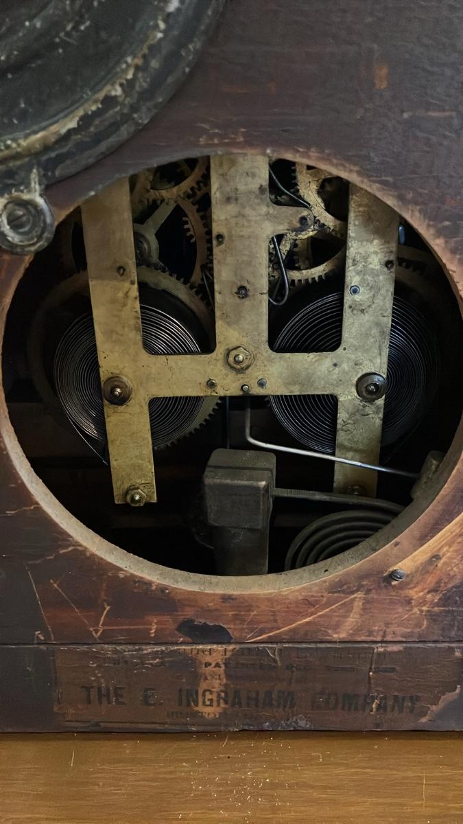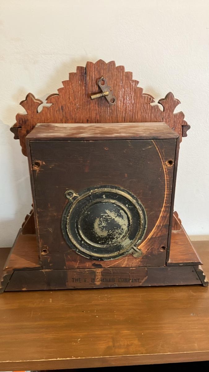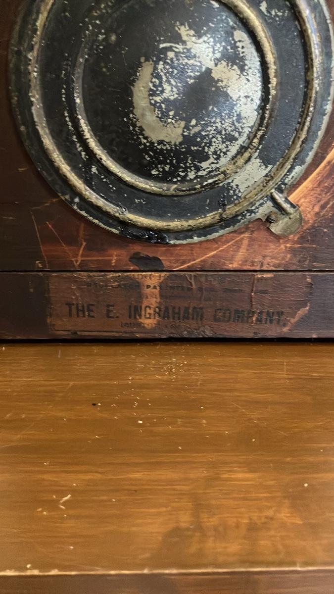 The clock boasts a classic brass dial with crisp Roman numerals, ornate gold bezel, and visible escapement for that authentic mechanical charm. Inside, it's powered by Ingraham's signature 8-day time-and-strike movement, complete with all original components, including the decorative brass pendulum and brass winding key. It currently winds smoothly and runs briefly (ticks and chimes softly), but stops after a short time—likely just needs a professional cleaning and oiling (a quick $50–$100 fix for full reliability). No major damage, cracks, or missing parts; the glass is intact, and the case shows honest patina from age, with minor wear to edges that adds to its character.
