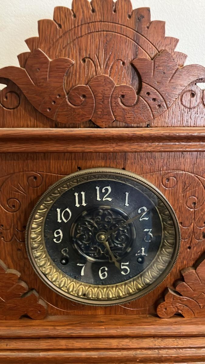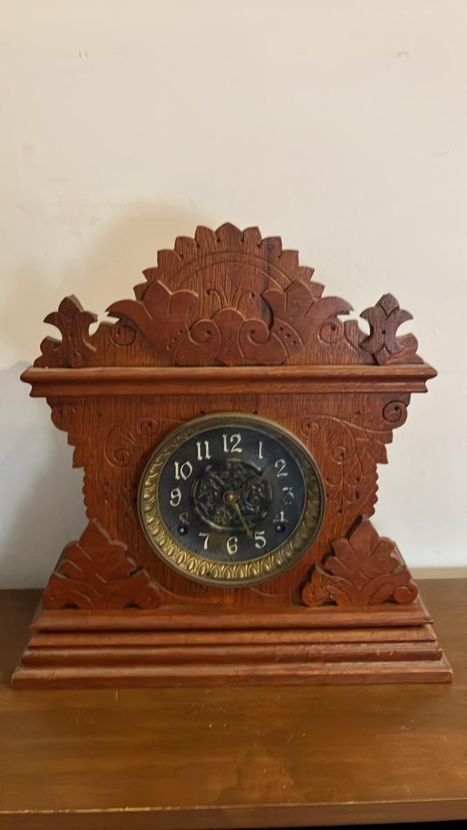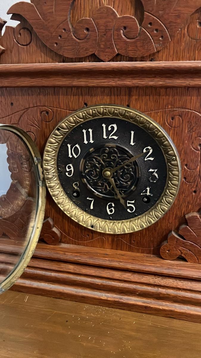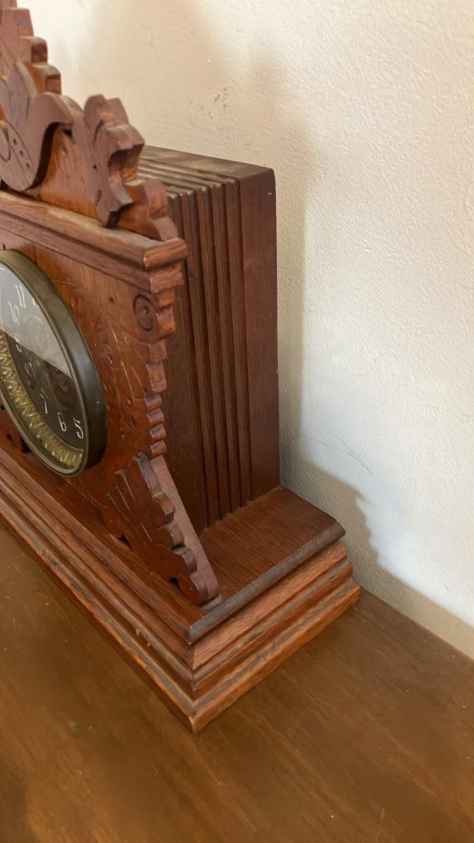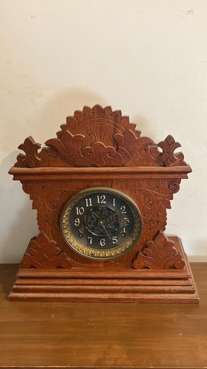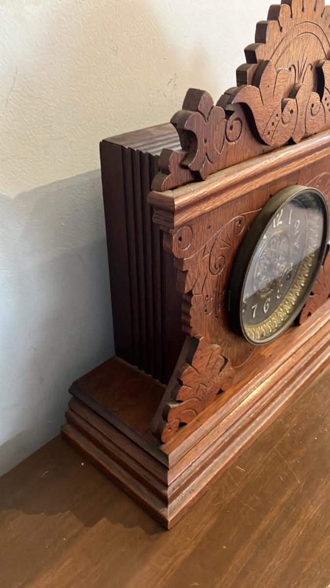 Antique E. Ingraham Eastlake Carved Oak Mantle Clock - 1880s, Original Works, Pendulum & Key, 14x14"