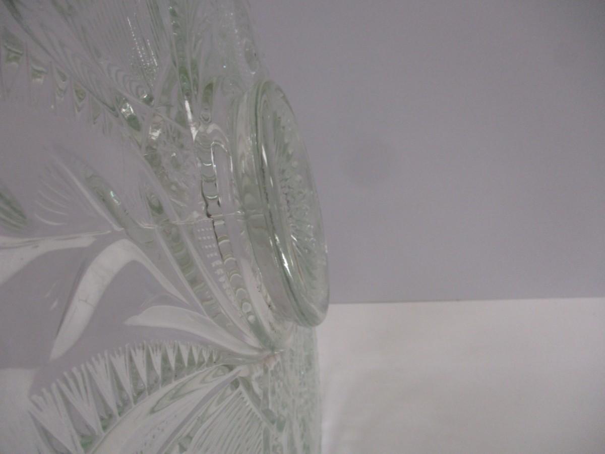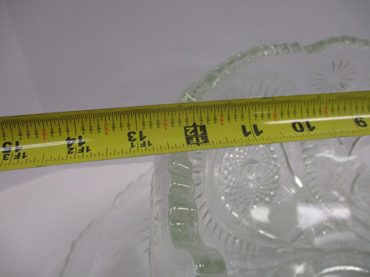 The product is an antique EAPG (Early American Pattern Glass) punch bowl and underplate made by the U.S. Glass Co. The intricate design features a slanted horseshoe and radial daisy pattern, adding a touch of elegance to any dining or kitchen decor. The glass material gives a classic and timeless look to this decorative cookware piece, making it a unique and stylish addition to any collection of pottery and glass items.