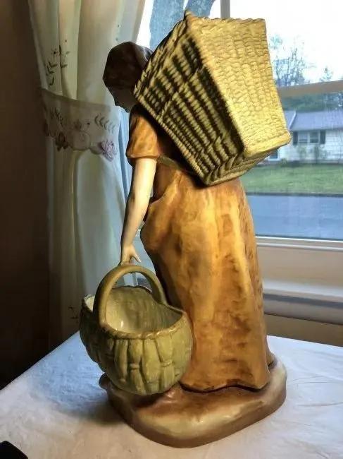 Antique Early 1900's Scarce Austrian Turn-Teplitz Amphora Porcelain Lady with Basket Statue 16.5" Tall #4623 in VG Condition as Pictured.