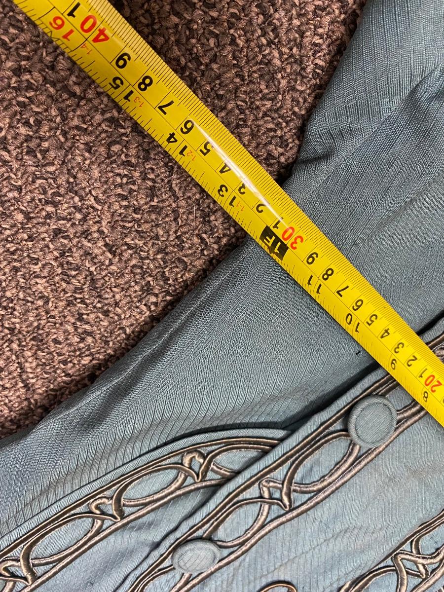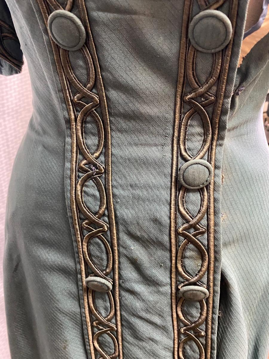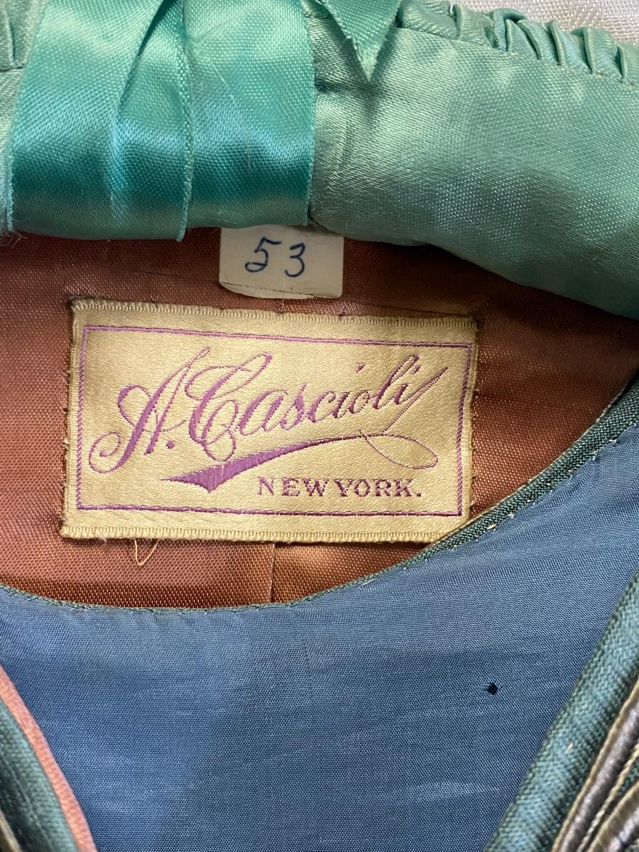 Antique Early 1900s Two Piece Dress and Overcoat Teal Blue A. Cascioli New York. In good antique condition. Light discolor from age. No serious damage. Hook and eye closure. Nicely fitted set. Has the original maker tag inside. Small size 8, measurements in photos. There is one large button missing on the dress at the waist, could probably move a lower button to fix. Part of a Victorian clothing consignment we are currently auctioning.