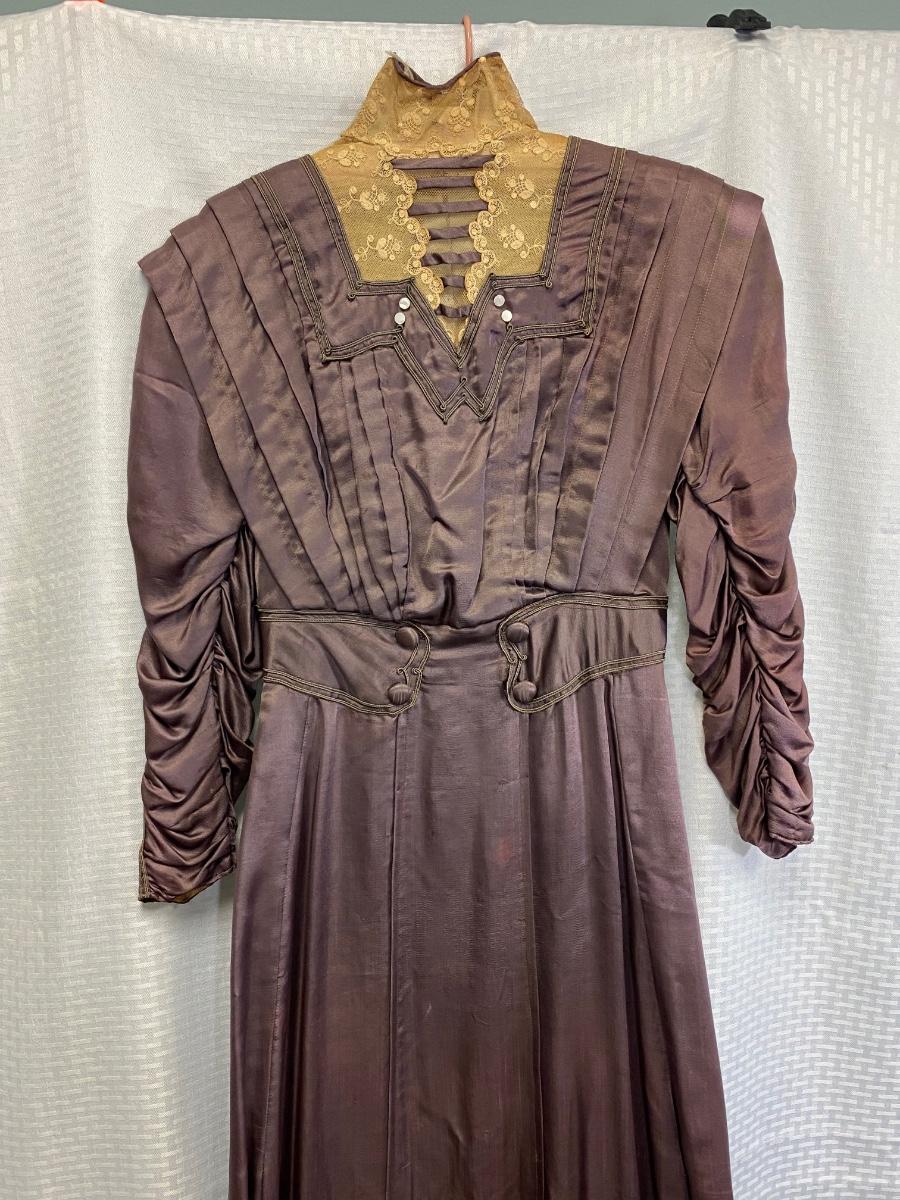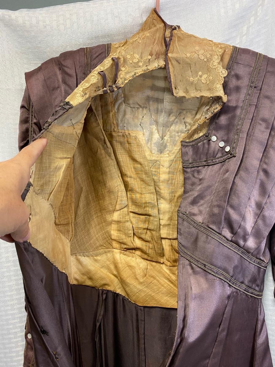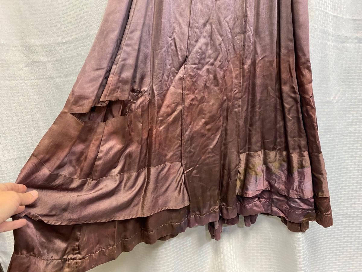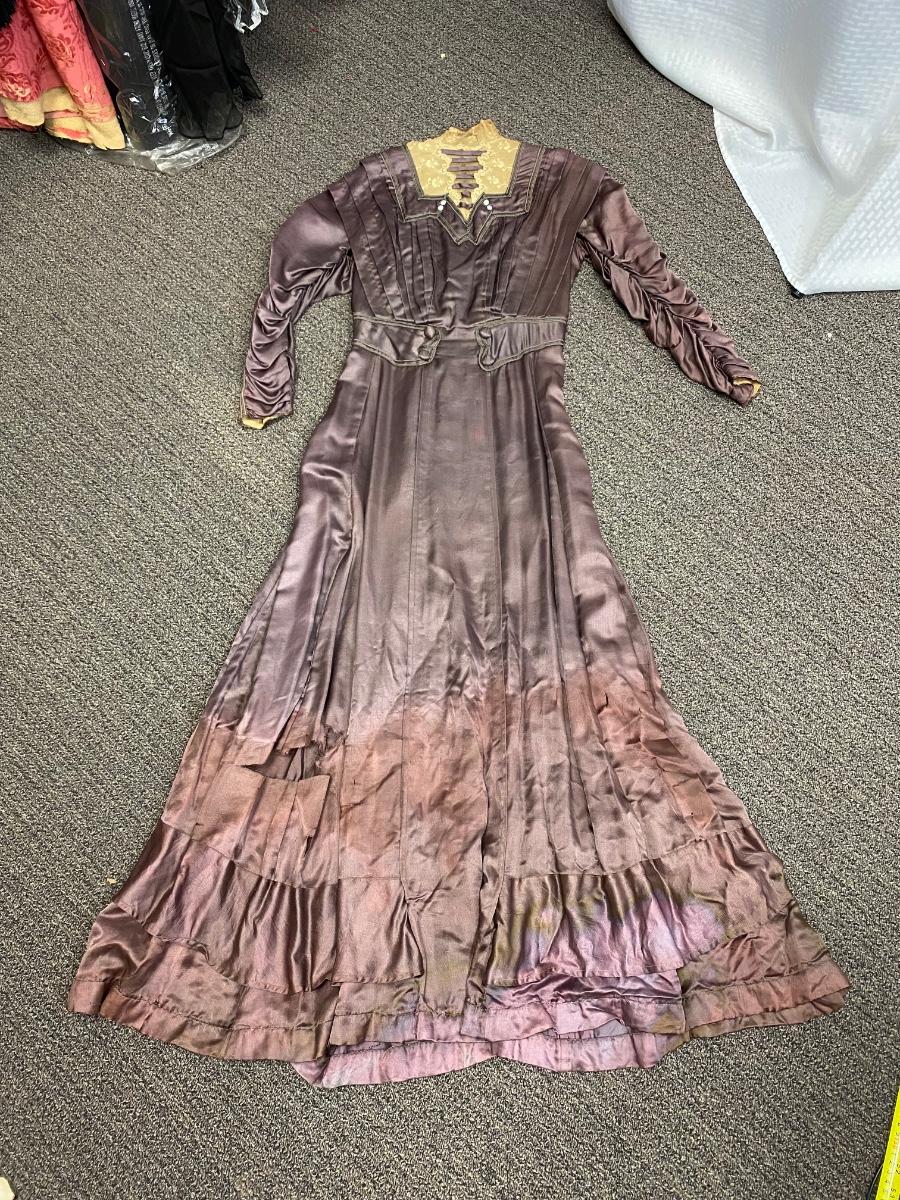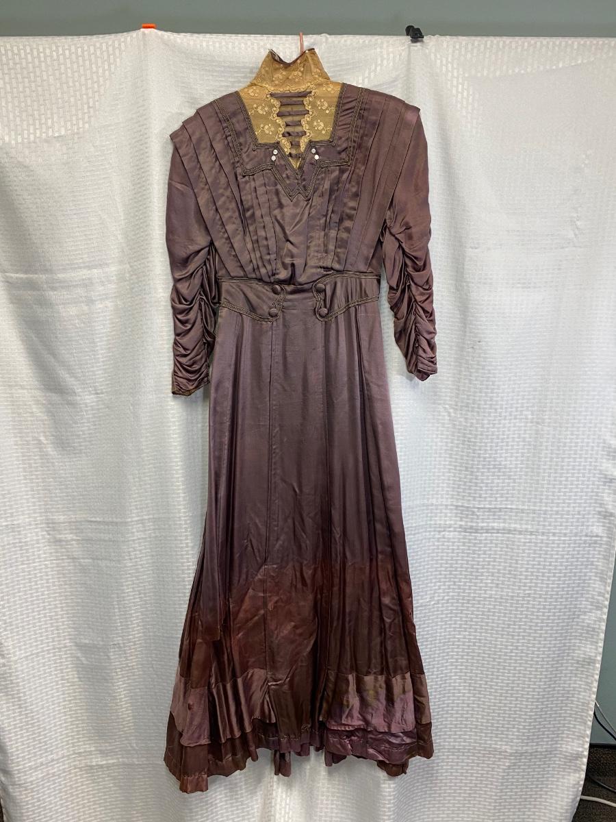 Antique Early 1900s Victorian Violet Silk Long Sleeve Dress. Fragile material from age. The lower half of the dress looks to have water or sun damage. May be able to alter but silk feels aged. Great for reproduction pattern. See Photos. Time era original, part of a large collection recently consigned.