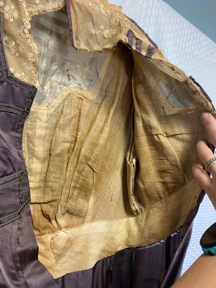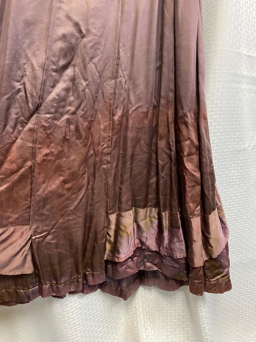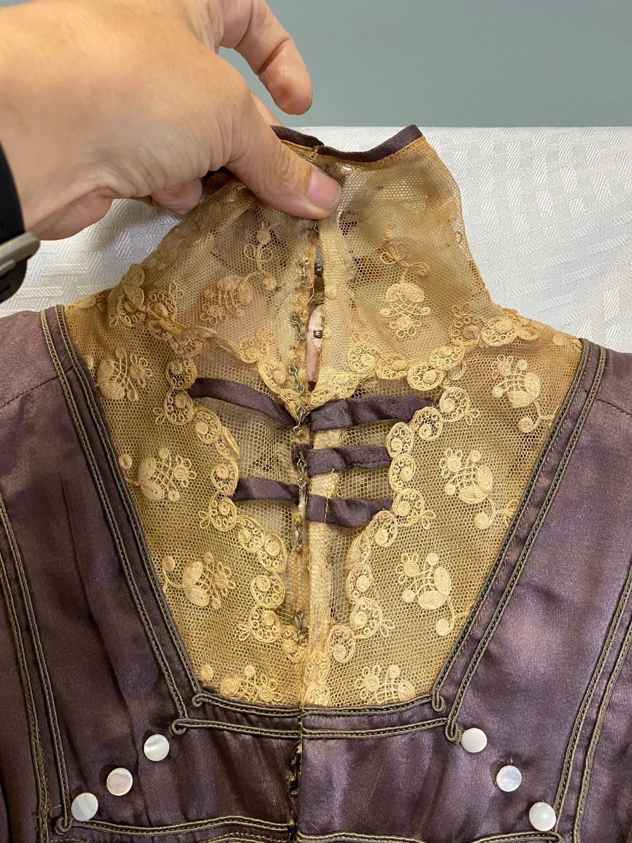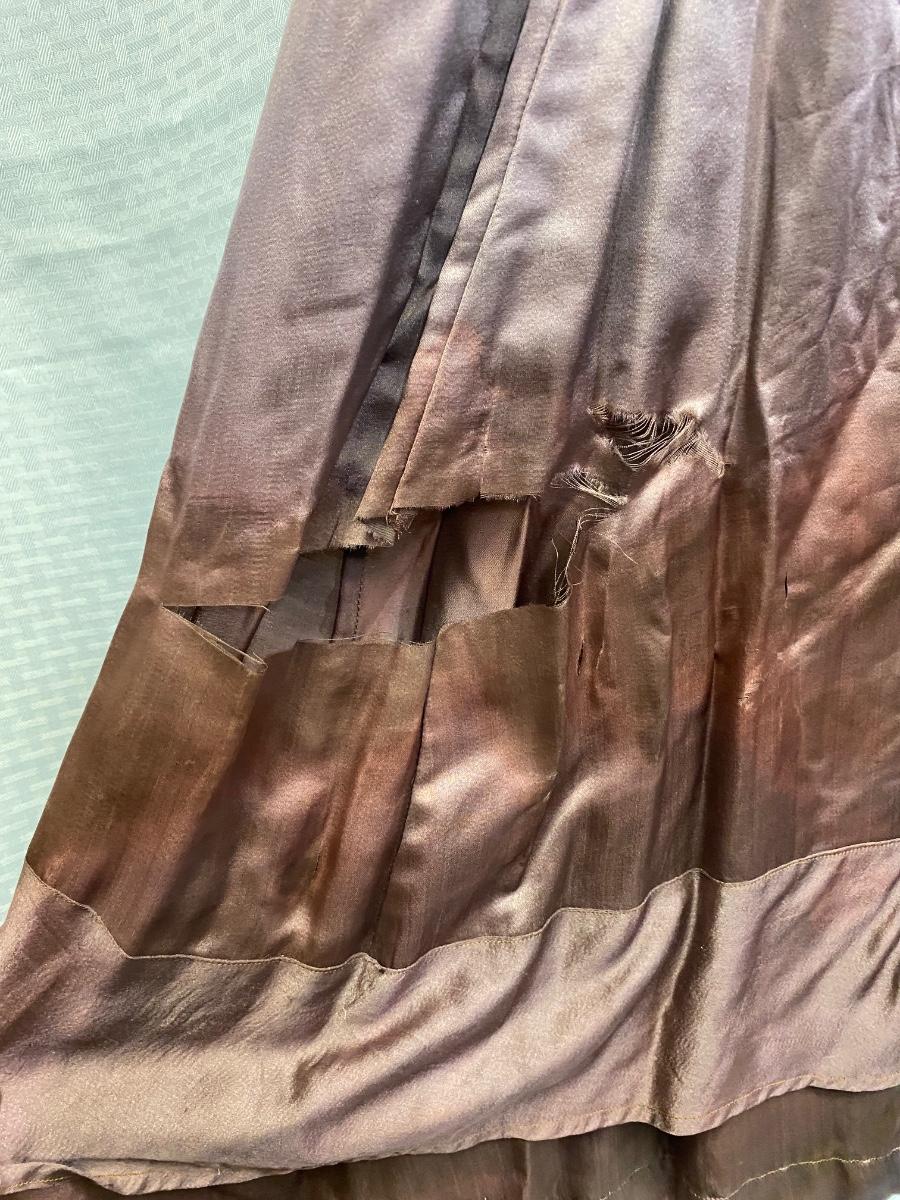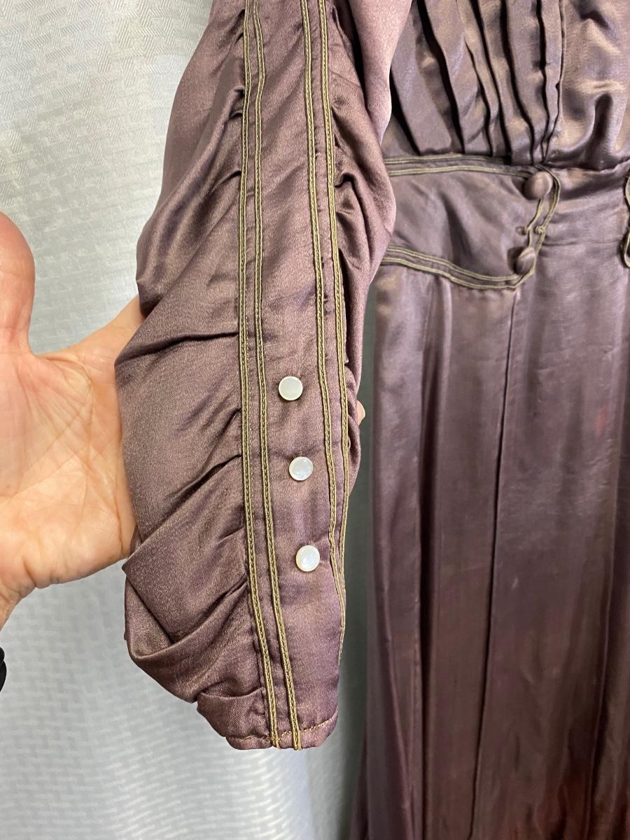 Antique Early 1900s Victorian Violet Silk Long Sleeve Dress. Fragile material from age. The lower half of the dress looks to have water or sun damage. May be able to alter but silk feels aged. Great for reproduction pattern. See Photos. Time era original, part of a large collection recently consigned.
