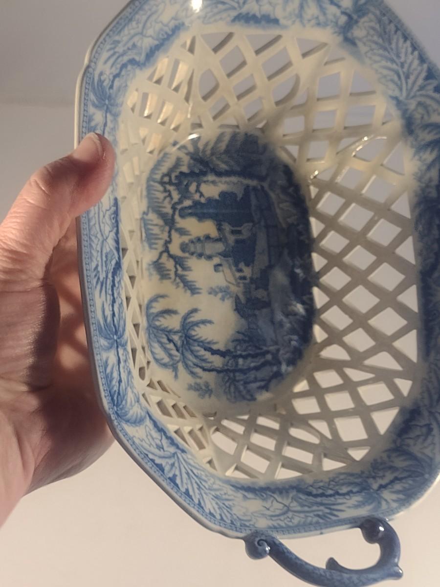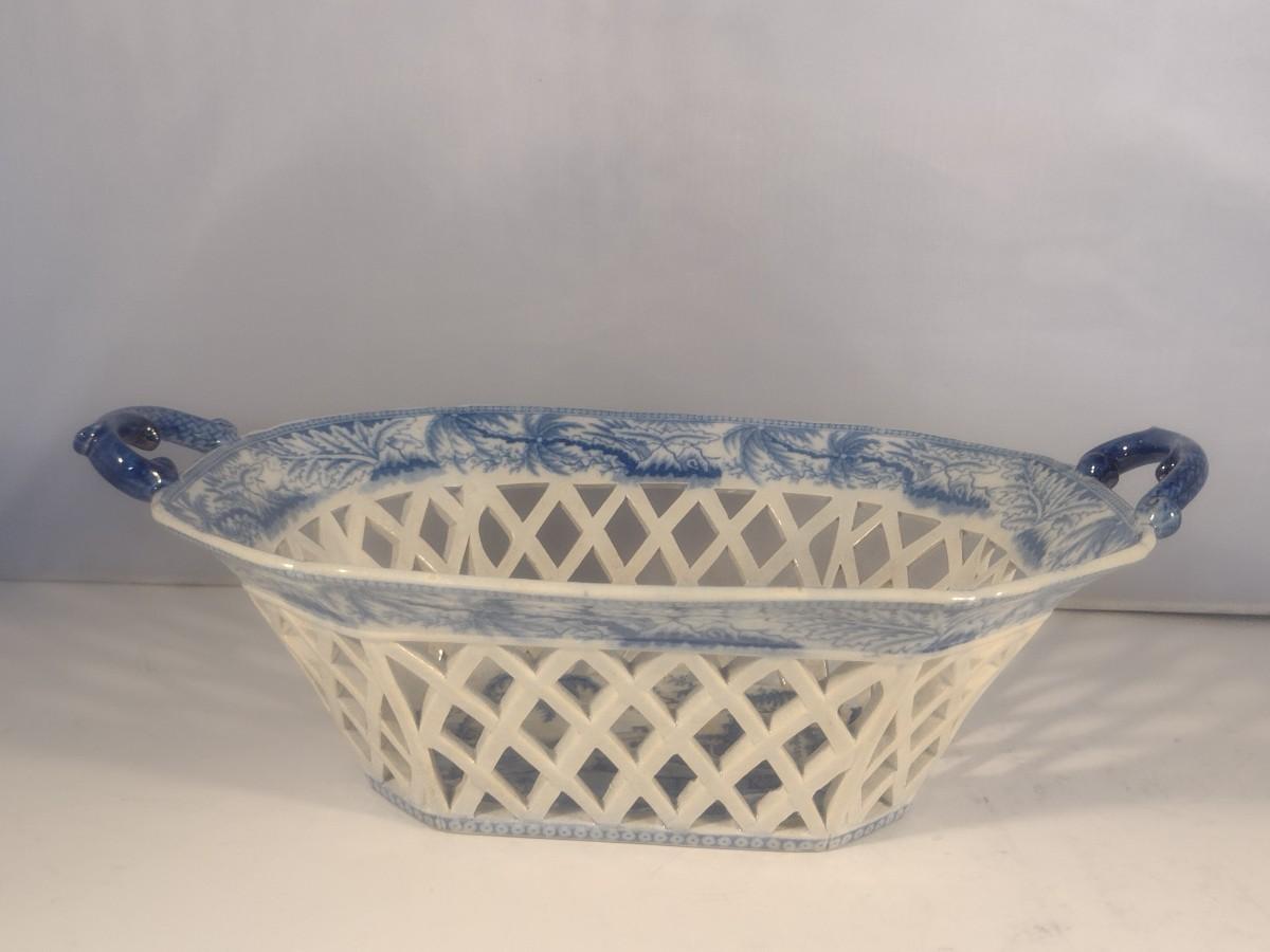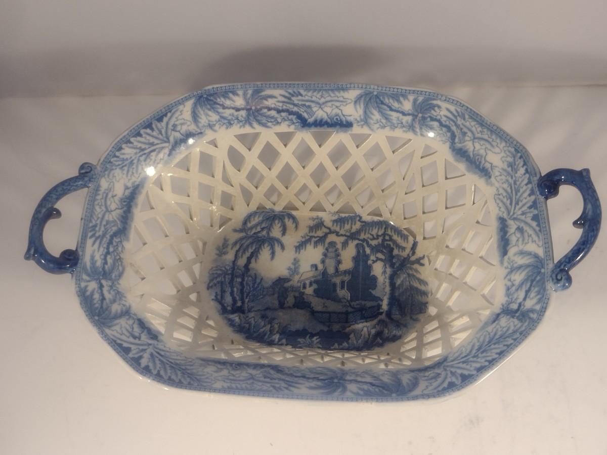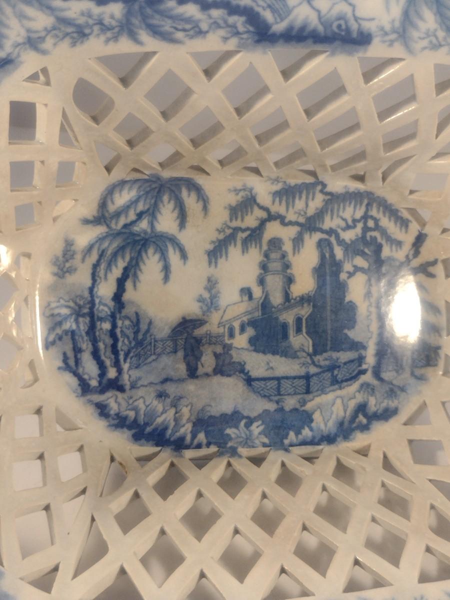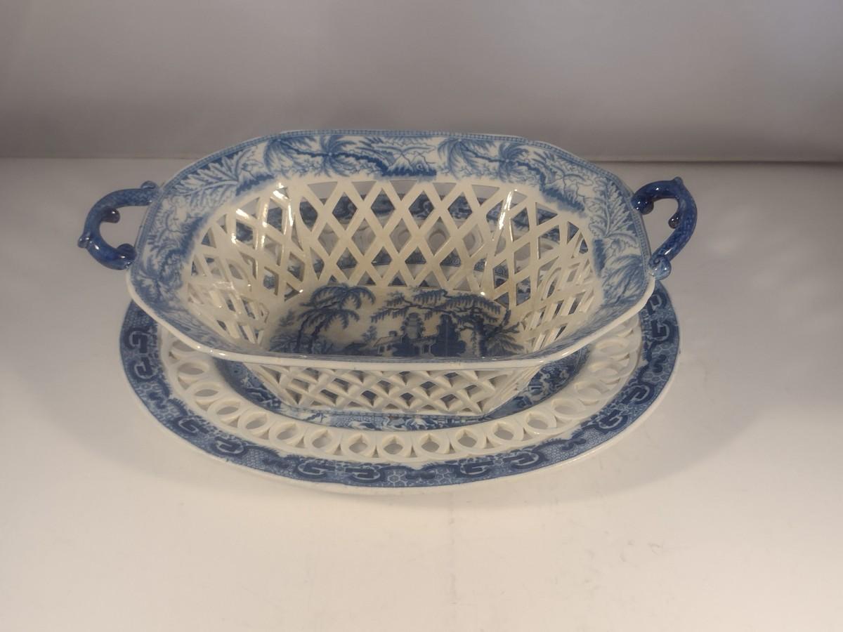 Antique Early 19th Century Blue and White Davenport Ceramic Pierced Chestnut Basket and Underplate