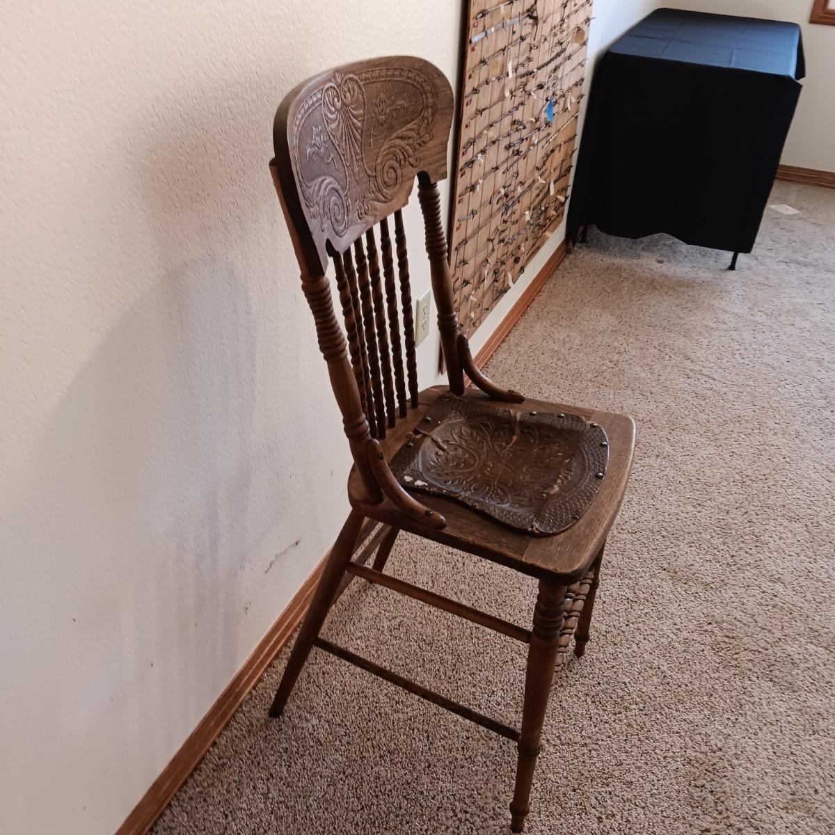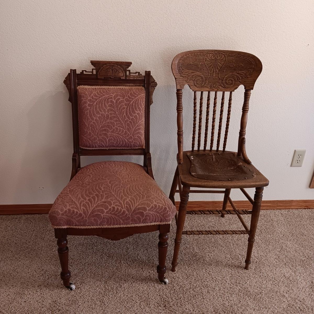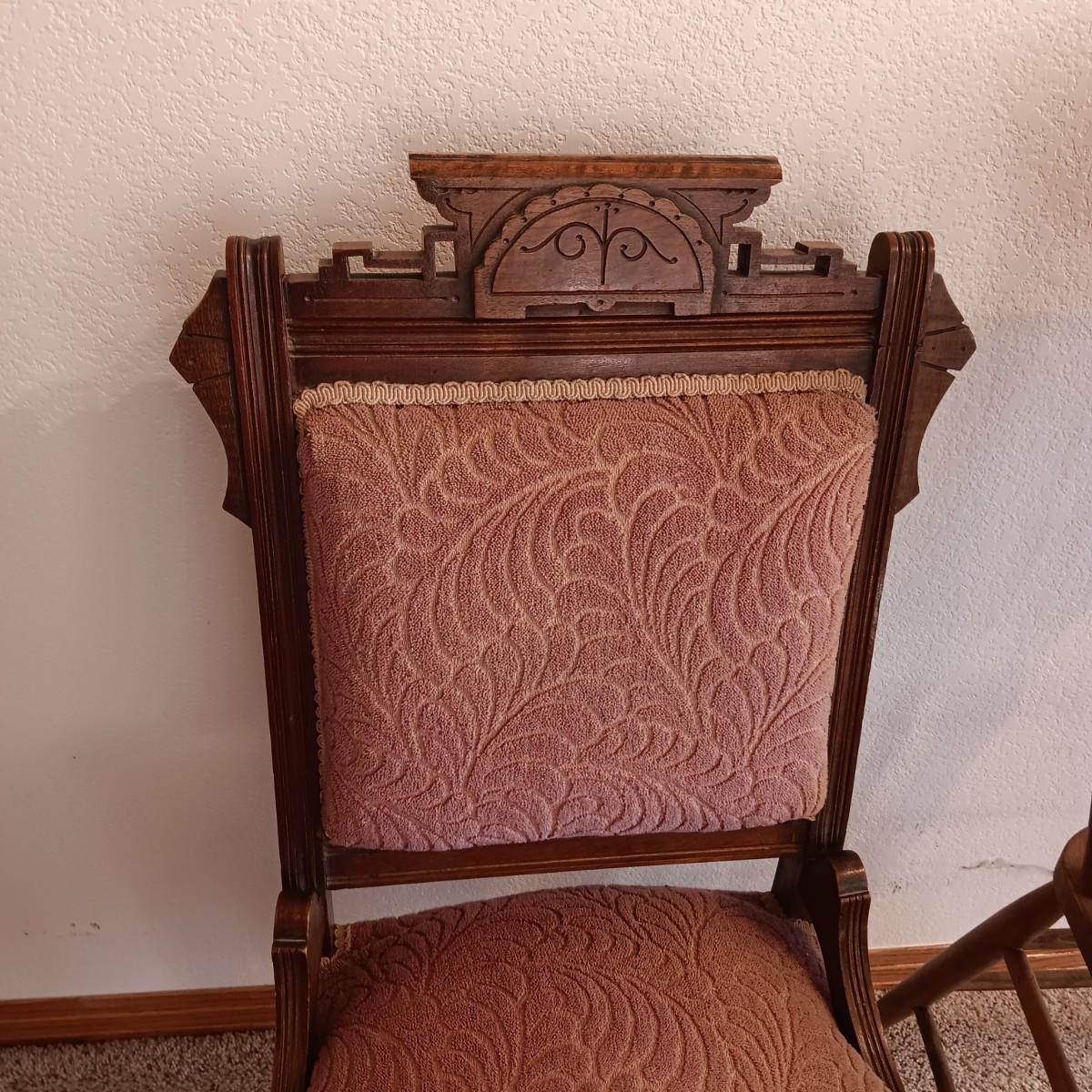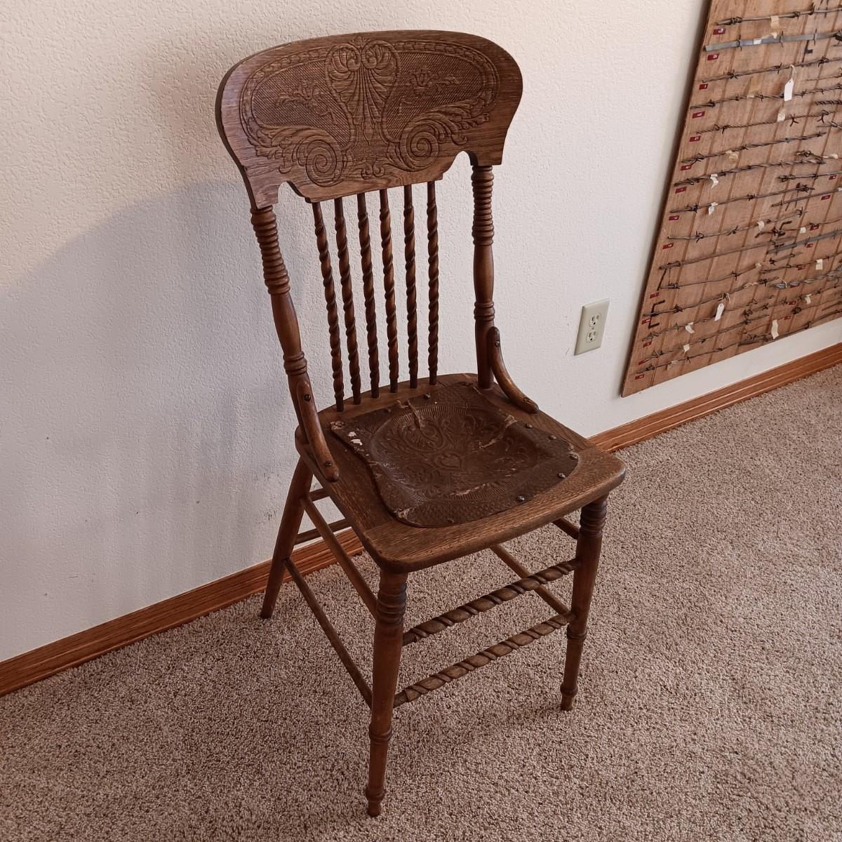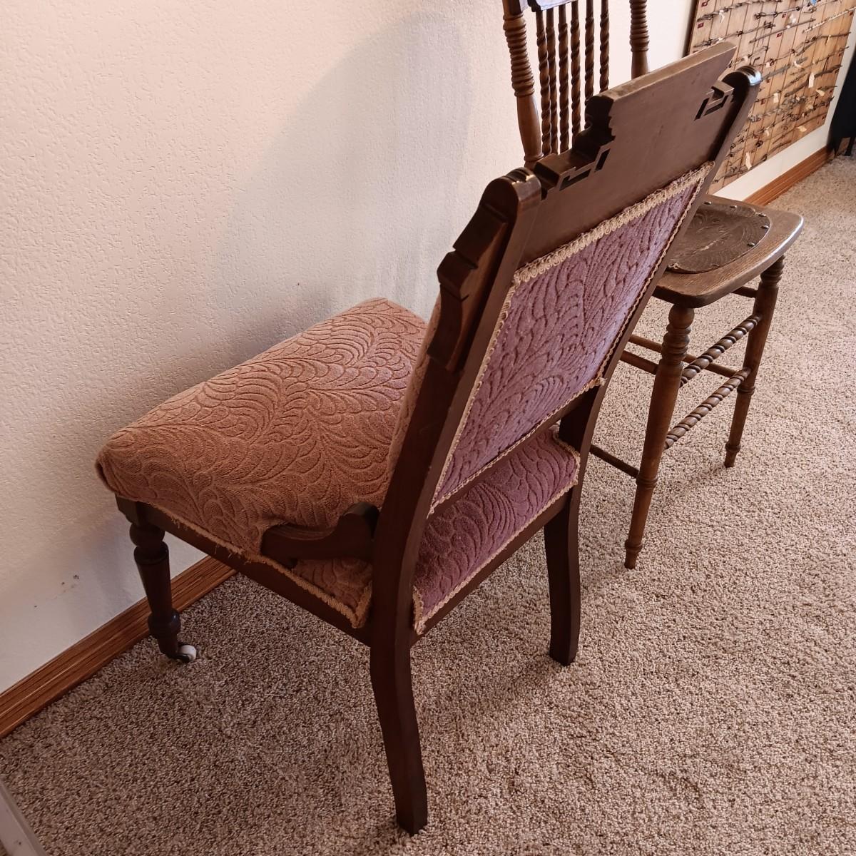 ANTIQUE EAST LAKE CARVED CHAIR WITH UPHOLSTERED BACK AND SEAT PLUS LEATHER SEAT ANTIQUE STOOL