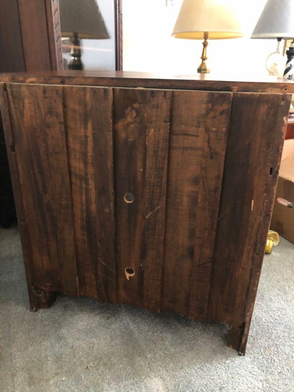 Eastlake style small wood bookshelf with drawer. This antique bookshelf features a simple design. Brass pull knobs on the drawer. Does have a keyhole lock but is missing the key. Does have signs of wear and use, someone cut holes in the back panel for electrical cord access.