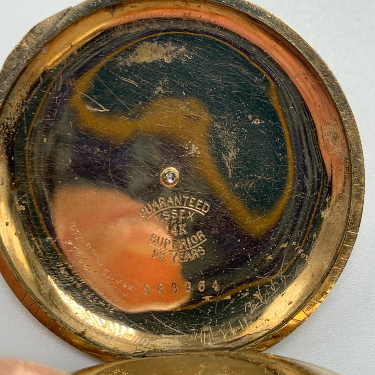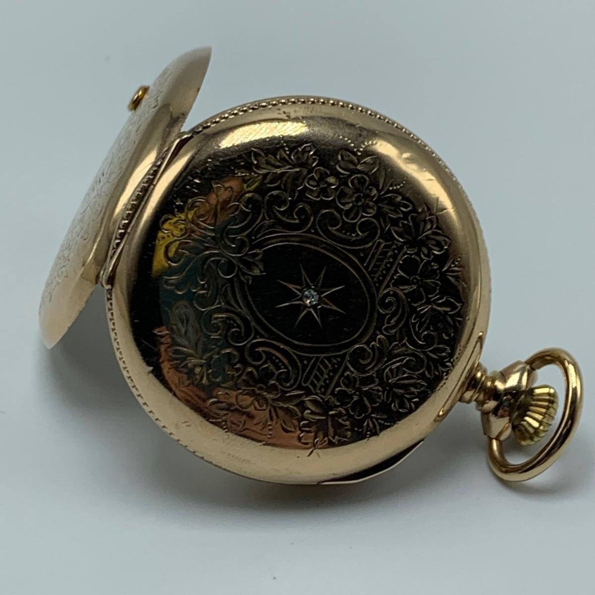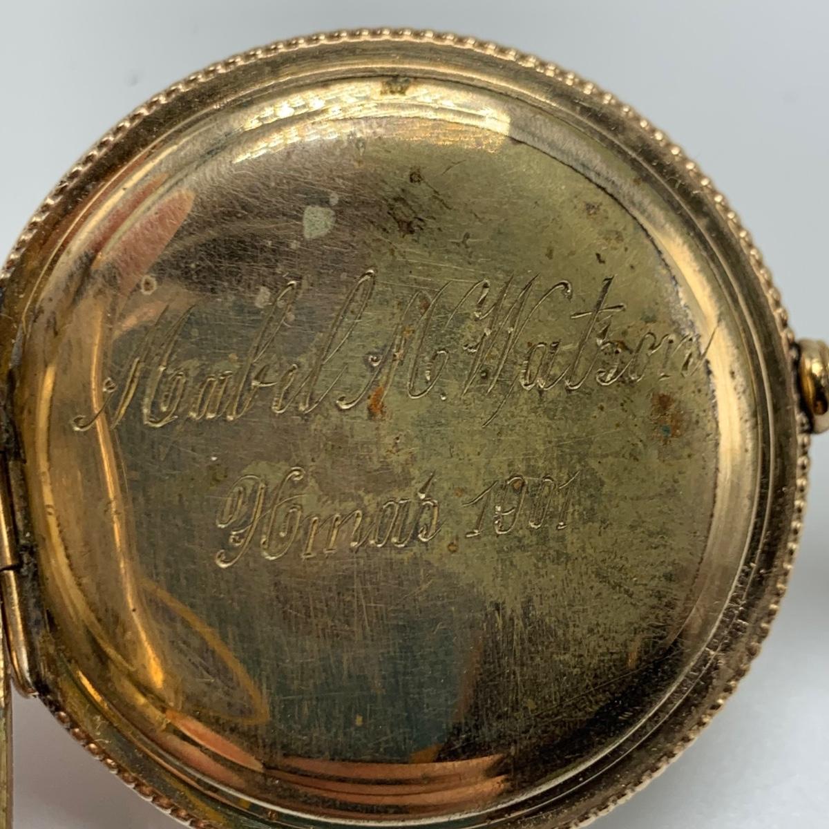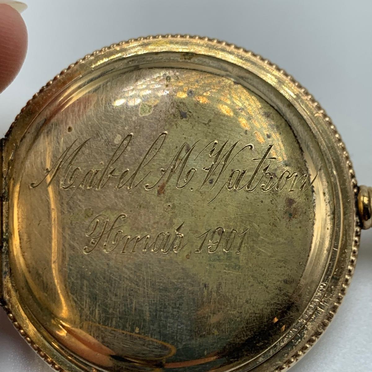 E.B. Woodard & Co. Pocket watch, marked 14K and with a gemstone that our Diamond tester indicated is a Diamond. The outside is monogrammed “˜MMW’ and the inside is inscribed “˜Mabel M. Watson Xmas 1901’. It is not currently functioning. All sales are final. No returns or refunds. Please bid accordingly.