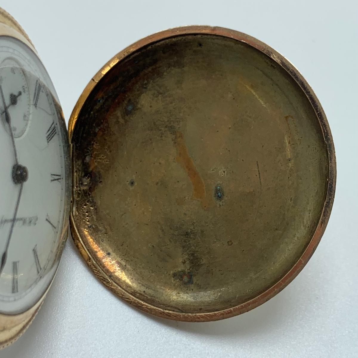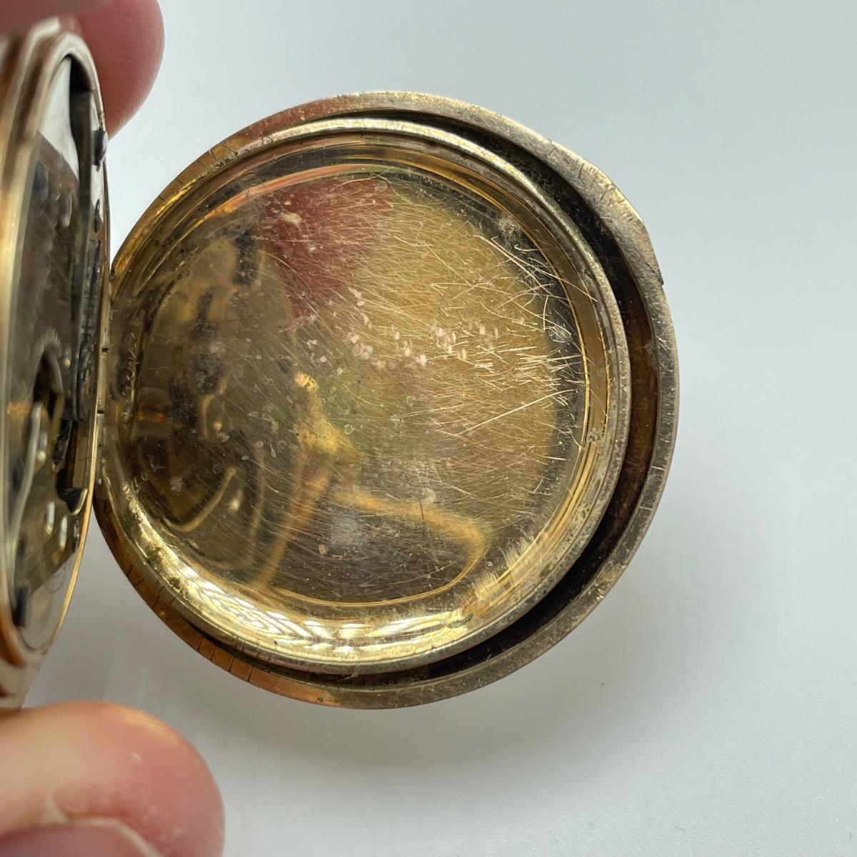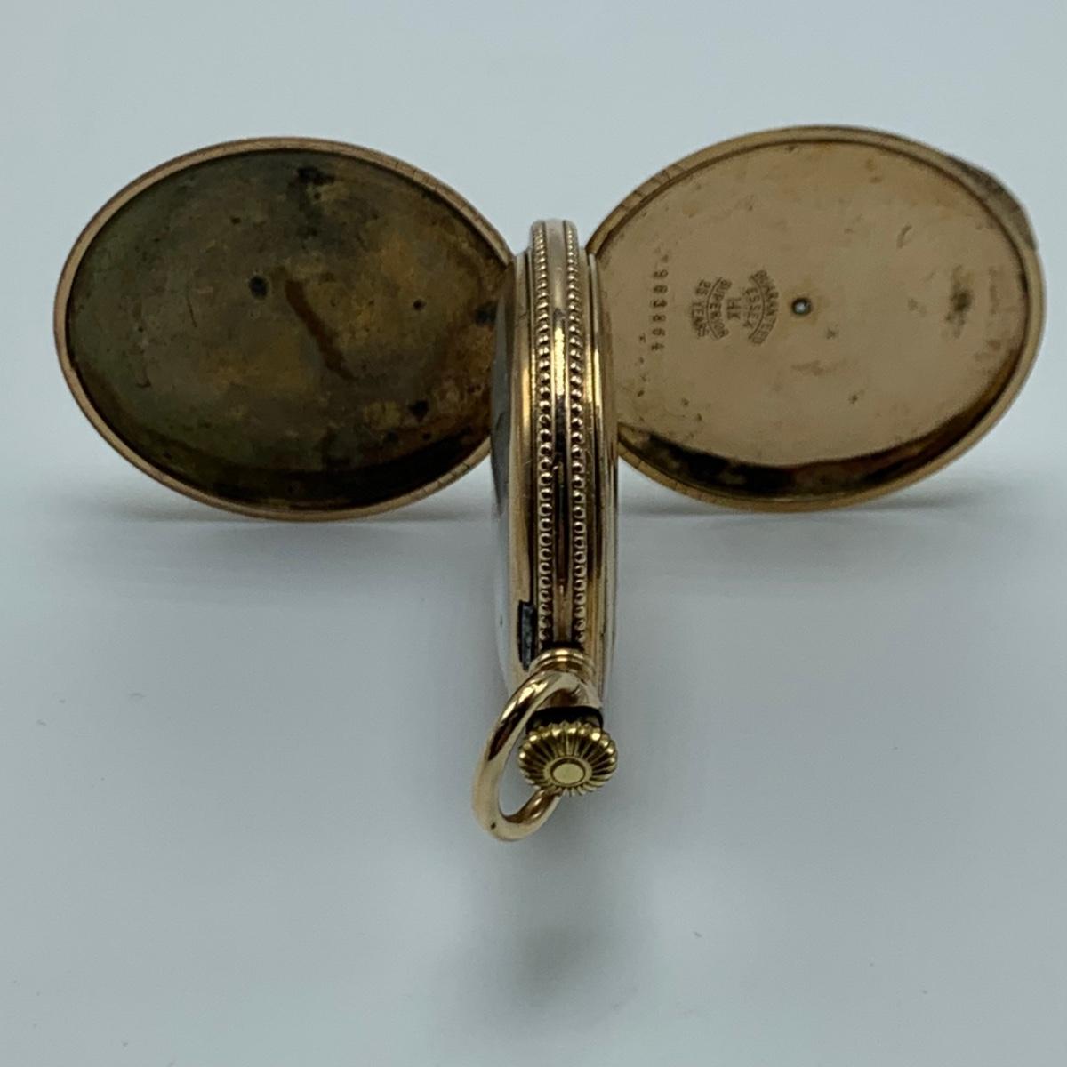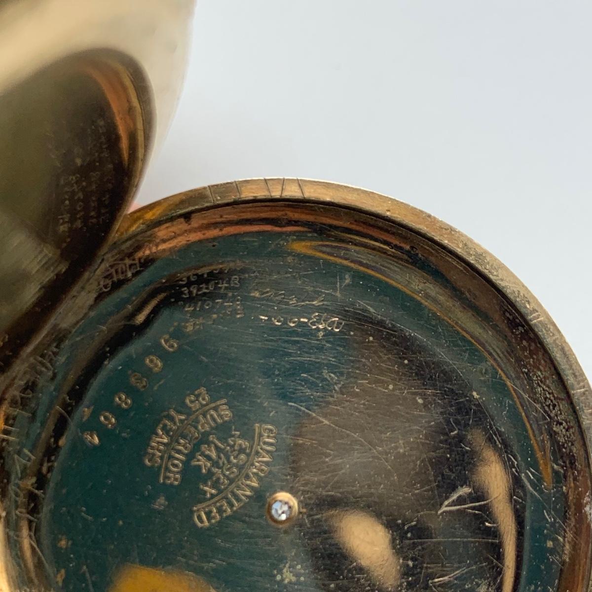 E.B. Woodard & Co. Pocket watch, marked 14K and with a gemstone that our Diamond tester indicated is a Diamond. The outside is monogrammed “˜MMW’ and the inside is inscribed “˜Mabel M. Watson Xmas 1901’. It is not currently functioning. All sales are final. No returns or refunds. Please bid accordingly.