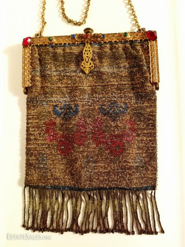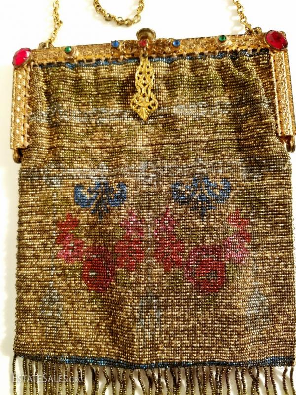The brass gold frame is intricately gilded with antique floral design and filigree. The antique silk lining has frayed so it was removed but the silk antique rimed trim is still left intact.There is a double brass chain attached to a silk covered mirror. The frame is Jeweled . In amazing antique condition. There is only one line of fringe that is missing but hardly noticeable.
