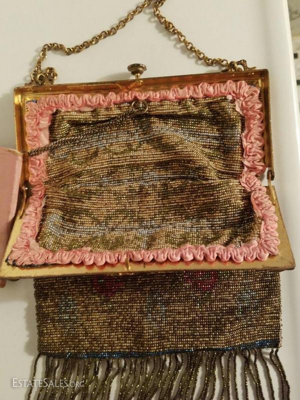 The brass gold frame is intricately gilded with antique floral design and filigree. The antique silk lining has frayed so it was removed but the silk antique rimed trim is still left intact.There is a double brass chain attached to a silk covered mirror. The frame is Jeweled . In amazing antique condition. There is only one line of fringe that is missing but hardly noticeable.