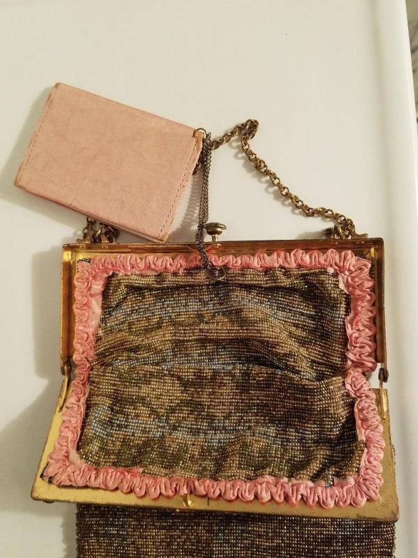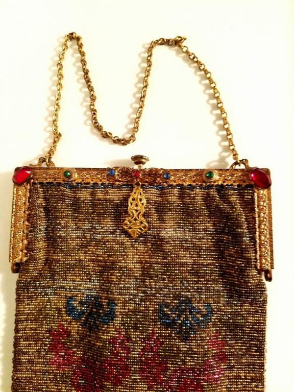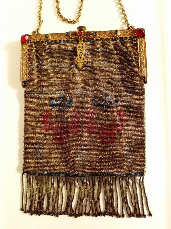 The brass gold frame is intricately gilded with antique floral design and filigree. The antique silk lining has frayed so it was removed but the silk antique rimed trim is still left intact.There is a double brass chain attached to a silk covered mirror. The frame is Jeweled . In amazing antique condition. There is only one line of fringe that is missing but hardly noticeable.