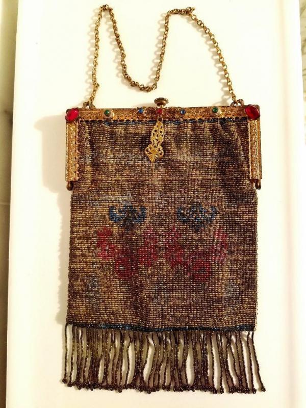 The brass gold frame is intricately gilded with antique floral design and filigree. The antique silk lining has frayed so it was removed but the silk antique rimed trim is still left intact.There is a double brass chain attached to a silk covered mirror. The frame is Jeweled . In amazing antique condition. There is only one line of fringe that is missing but hardly noticeable.