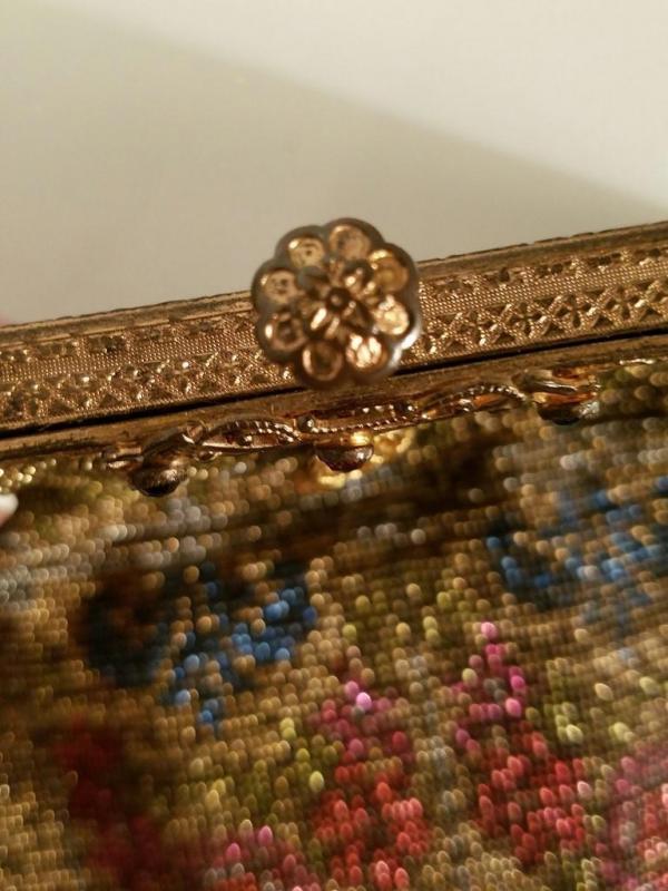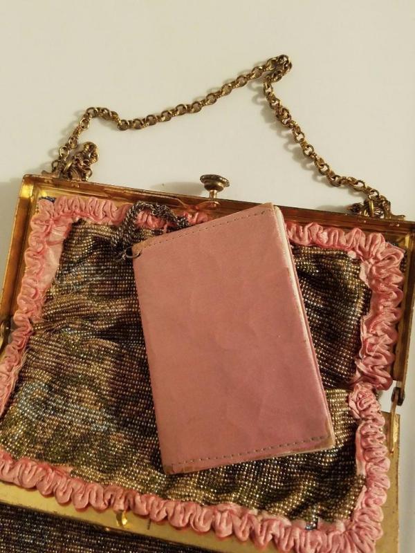 The brass gold frame is intricately gilded with antique floral design and filigree. The antique silk lining has frayed so it was removed but the silk antique rimed trim is still left intact.There is a double brass chain attached to a silk covered mirror. The frame is Jeweled . In amazing antique condition. There is only one line of fringe that is missing but hardly noticeable.