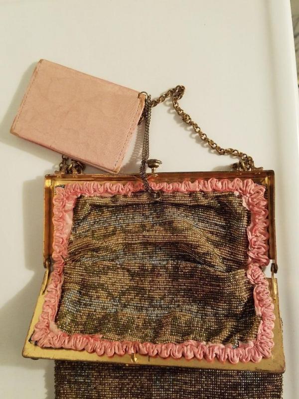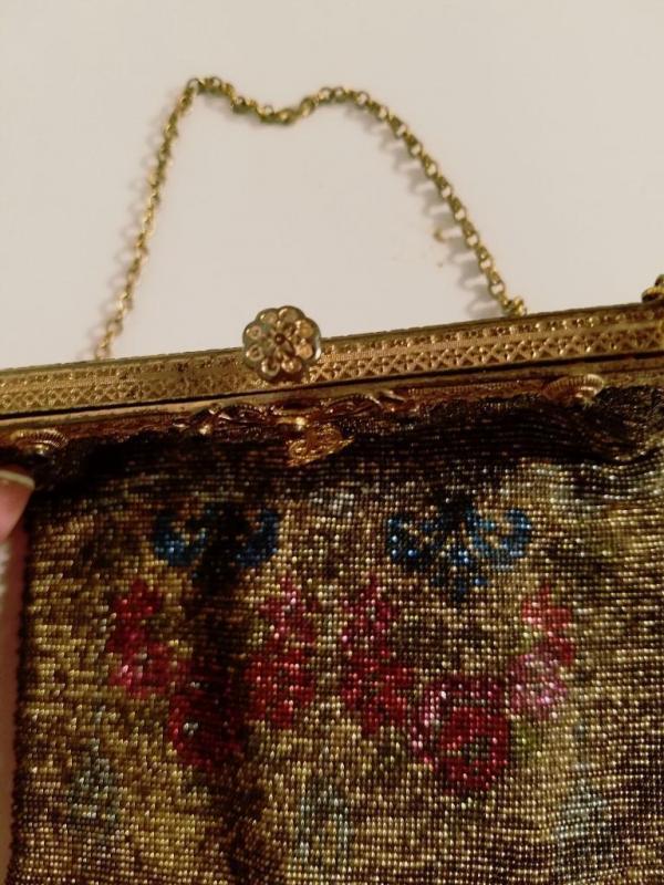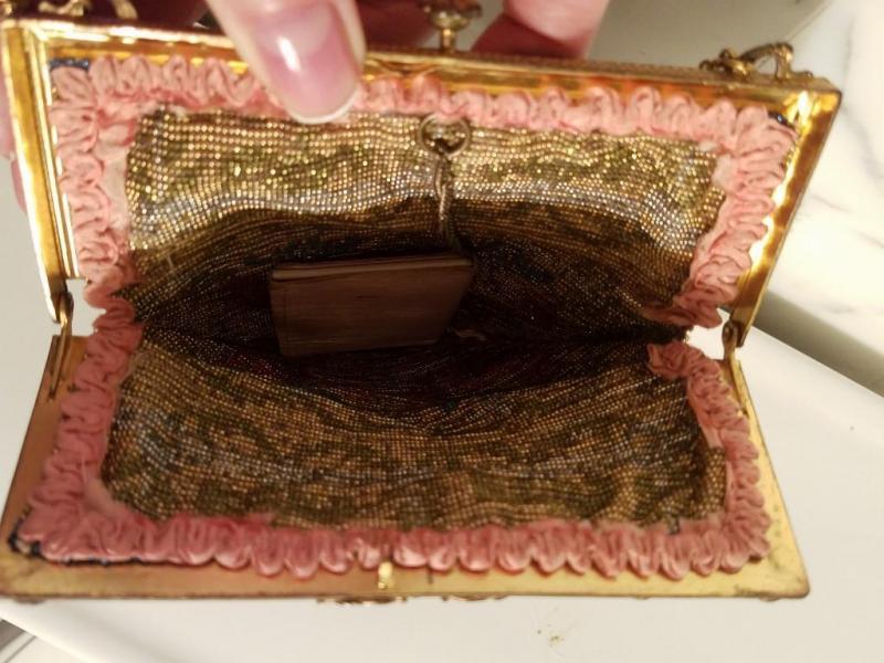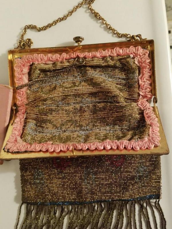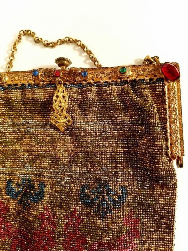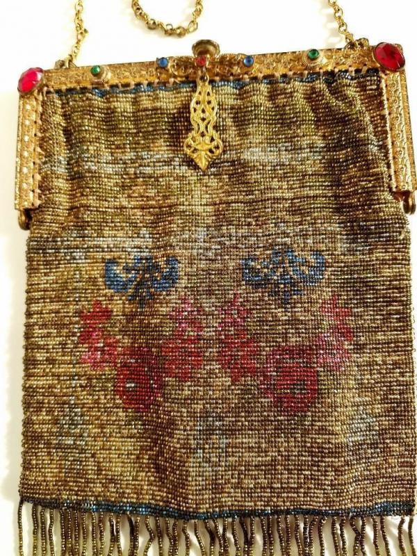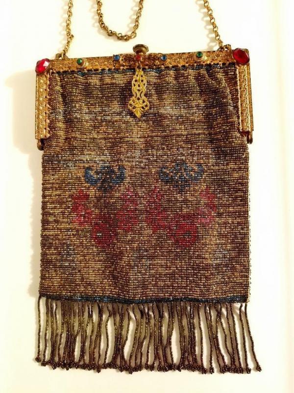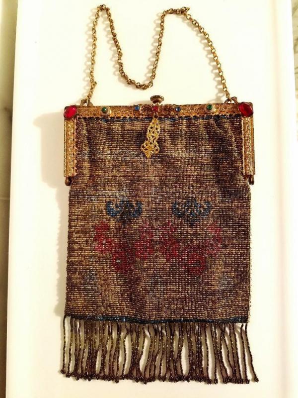 Antique edwardian French Jeweled micro beaded gilded bag w/fringes