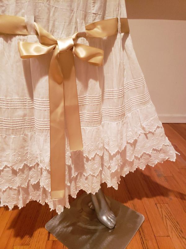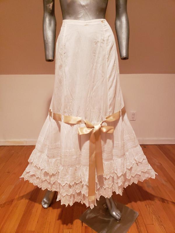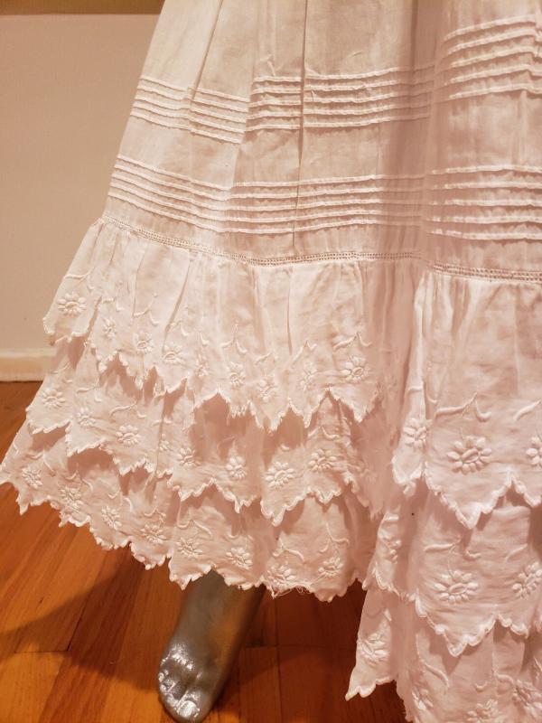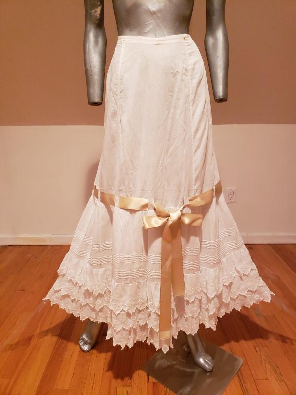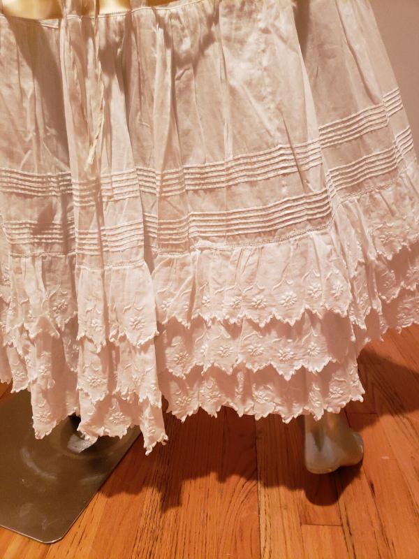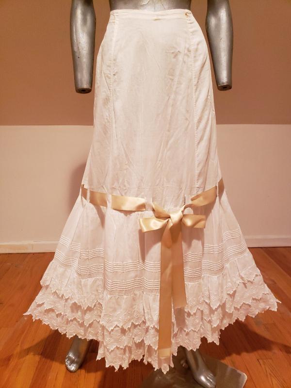 The bottom has three ruffled layers that are all magnifficntly hand embroidered whitework French Laid embroidery. that is out of this world beautigul with all around embroidered bordure. . A light mocca satin ribbon adorne this gorgeous petticoat.. This one is Circa 1900-1910. It is in vry good condition for its age . som light wwar nothing to write home about. STUNNER
