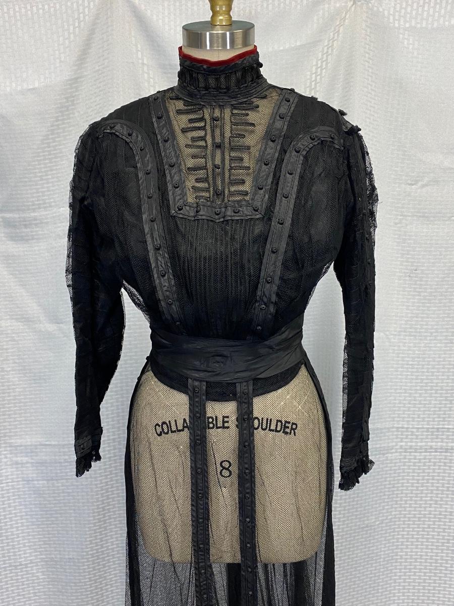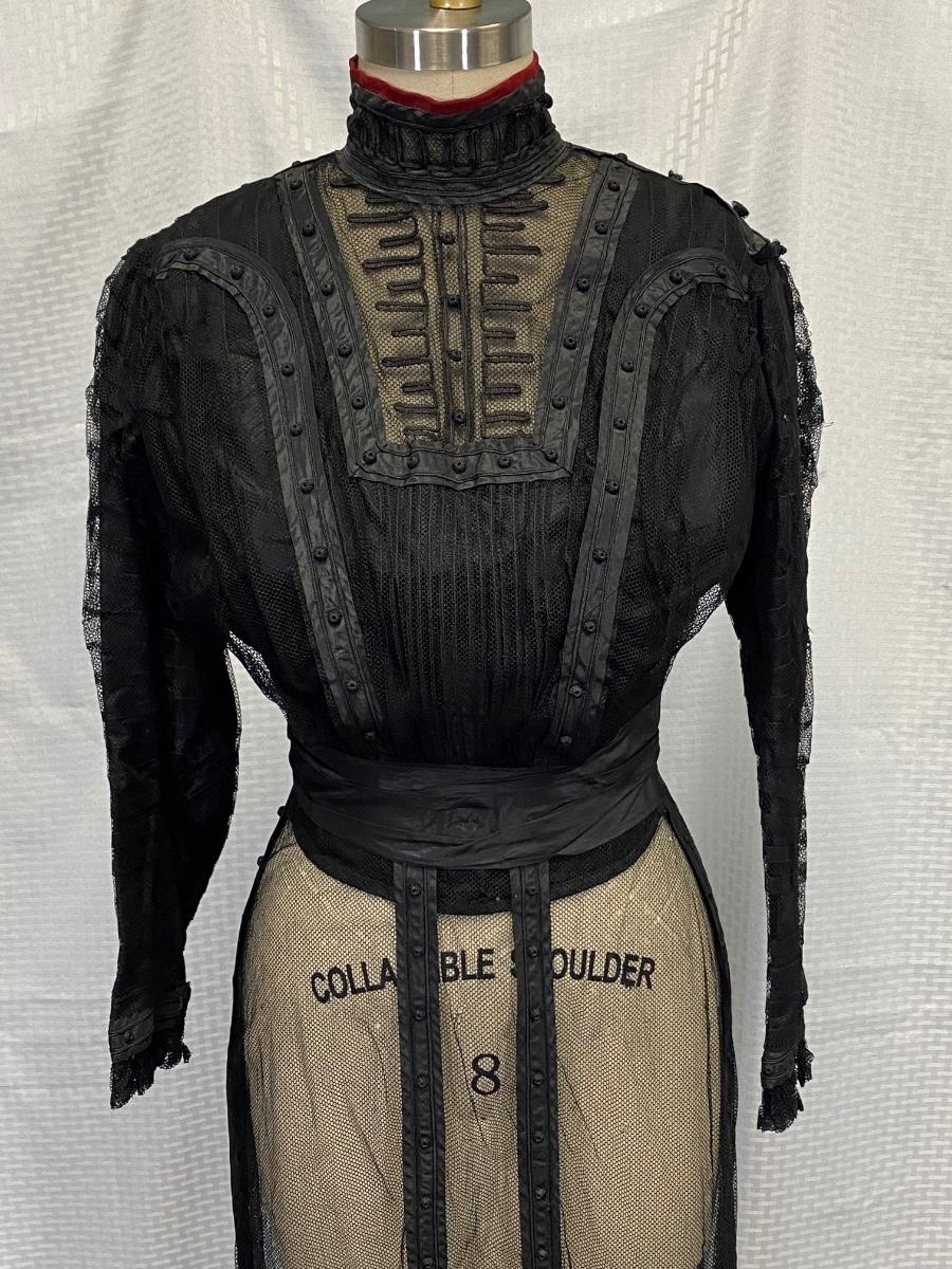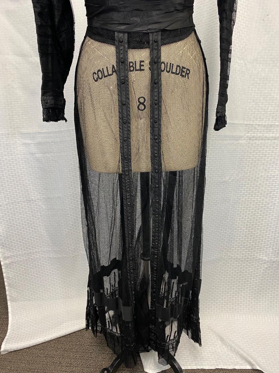Antique Edwardian Victorian Black Lace Mesh Full Length Petticoat Dress Romantic Gothic Boho. In good antique condition. Could be worn over black slip dress or as an under layer. Fully boned and lined bodice. Long sleeves. Great details. Hook and eye closure down the back. Some light tears in the lining layer could probably be repaired by hand. Fit or size 8 mannequin well, measurements are in the photos. Has a slight high low hem line of the skirt.