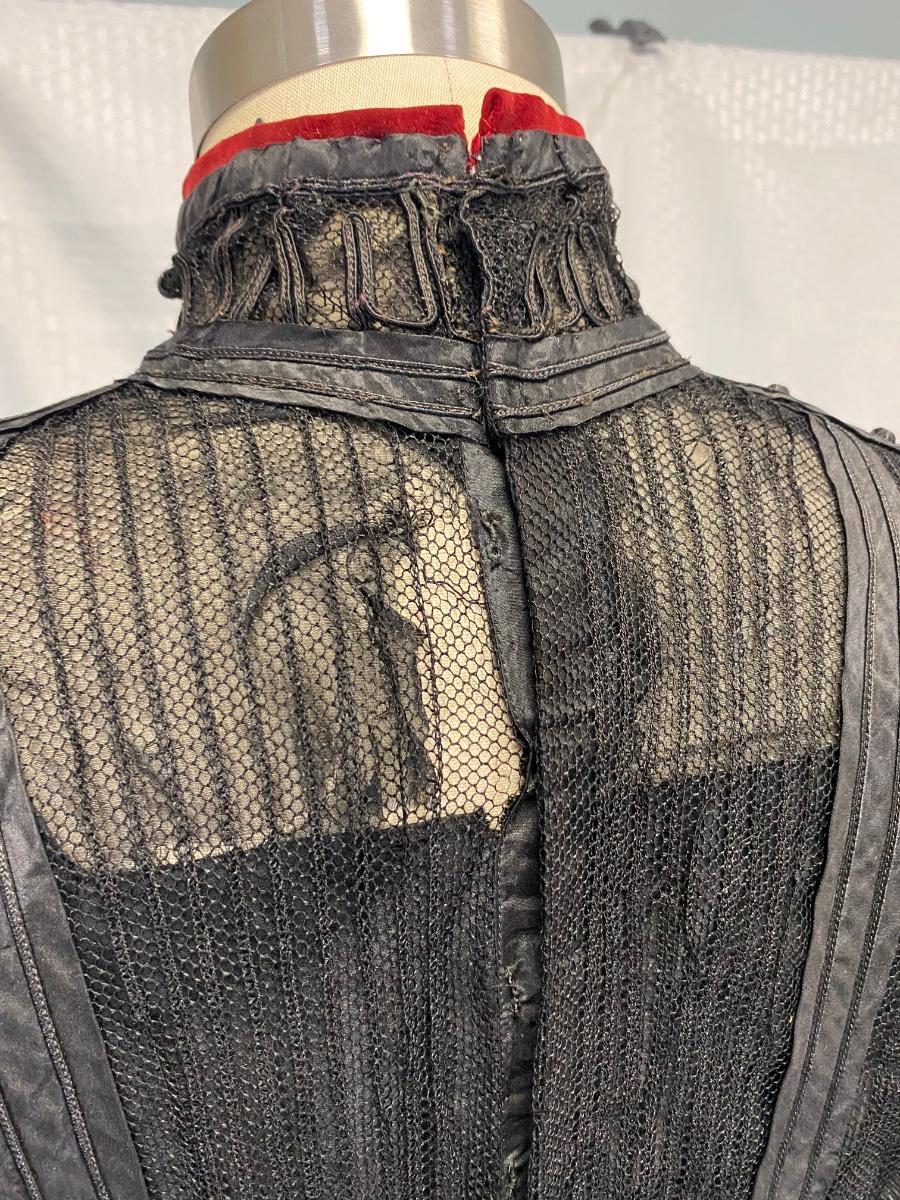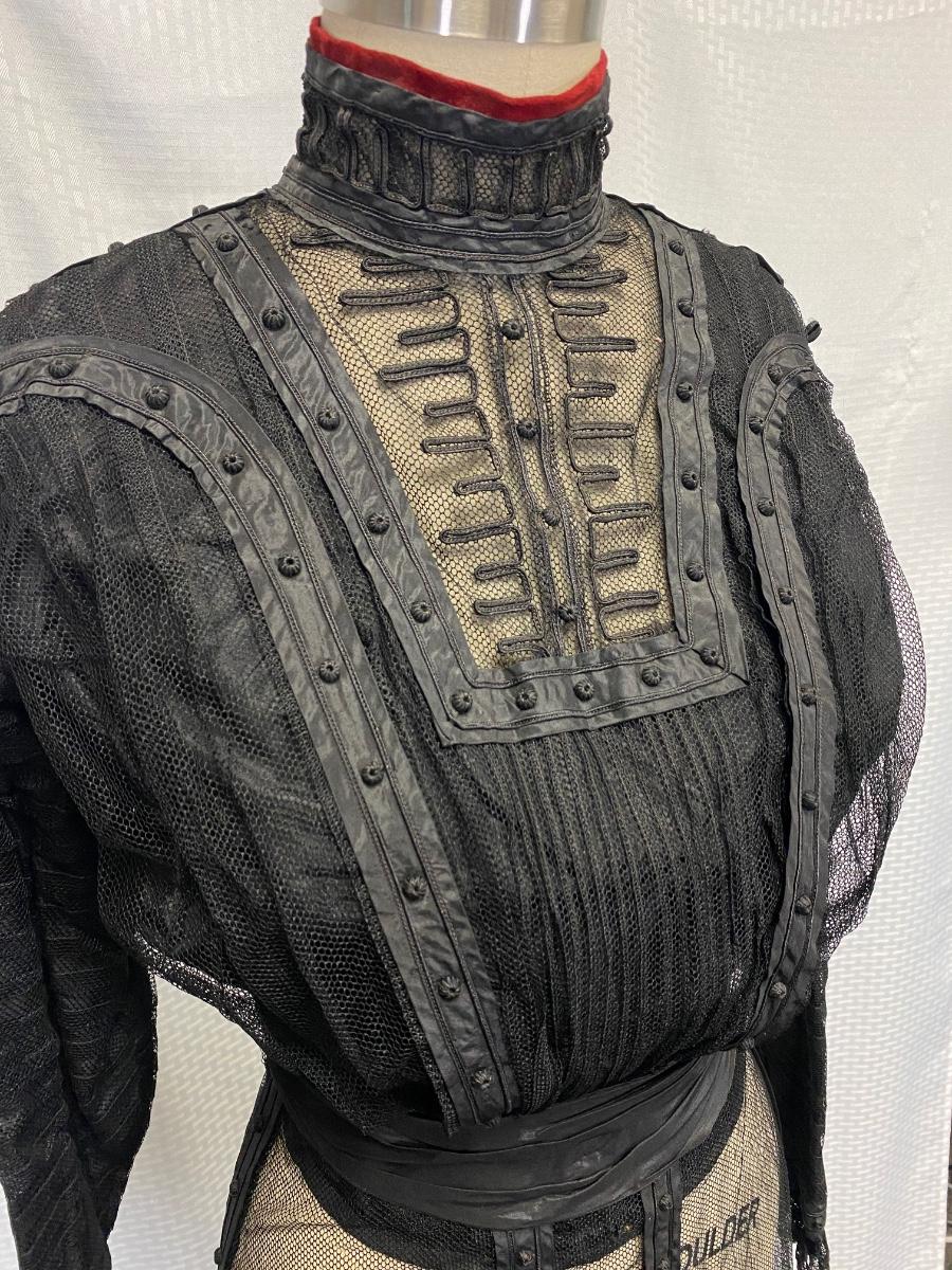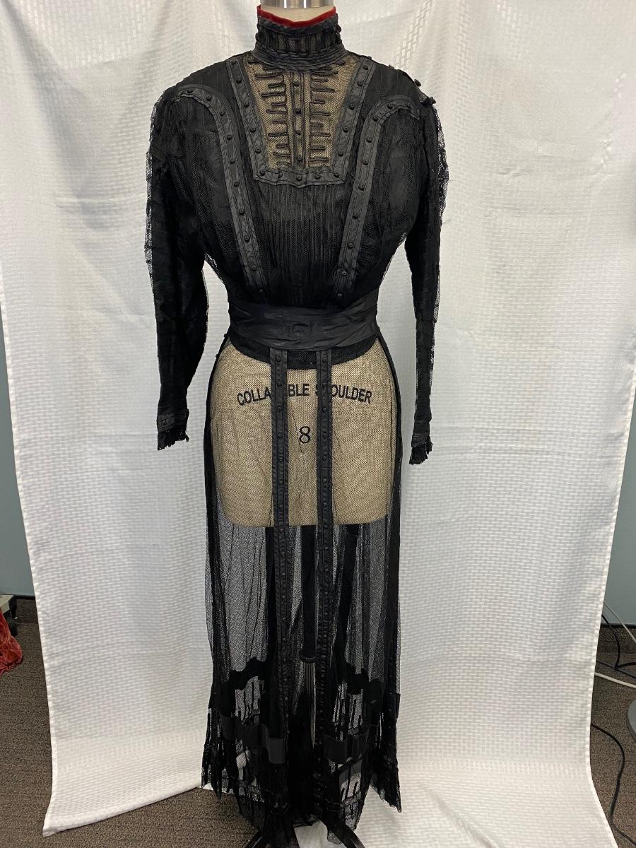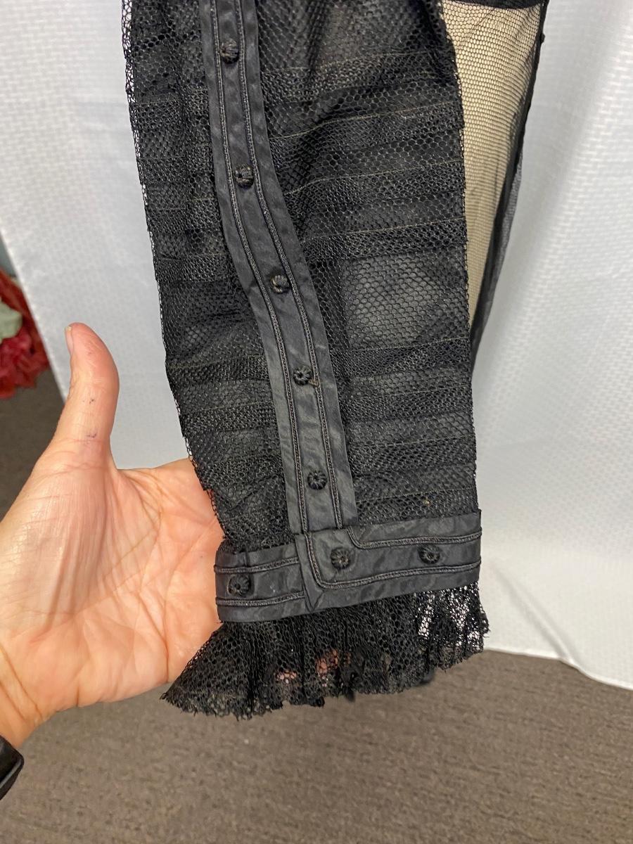 Antique Edwardian Victorian Black Lace Mesh Full Length Petticoat Dress Romantic Gothic Boho. In good antique condition. Could be worn over black slip dress or as an under layer. Fully boned and lined bodice. Long sleeves. Great details. Hook and eye closure down the back. Some light tears in the lining layer could probably be repaired by hand. Fit or size 8 mannequin well, measurements are in the photos. Has a slight high low hem line of the skirt.