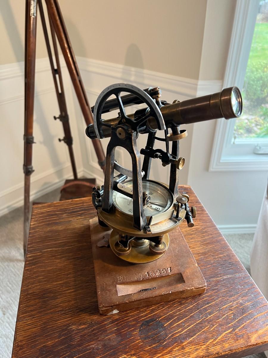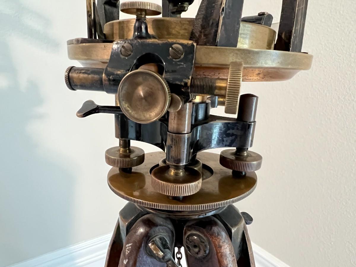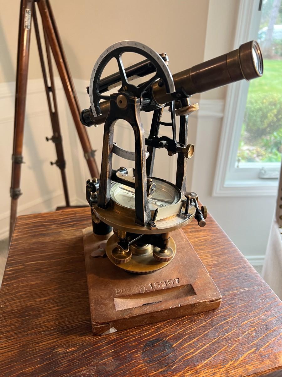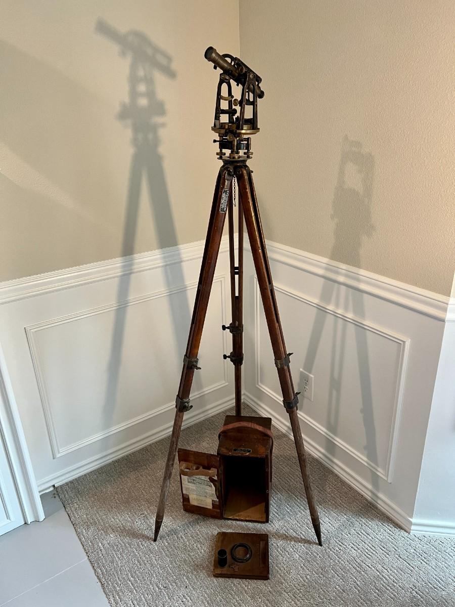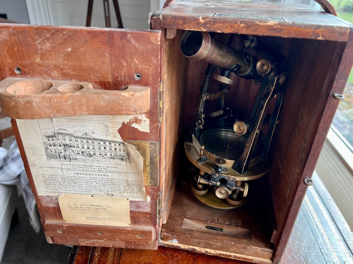 Wonderful and rare antique surveyor's tripod! Designed by EG Soltmann Inc in New York, with components made by Buff & Buff Manufacturing Company in Boston. Engineering level and surveying tripod on original stand with original box. Own a piece of American engineering history!