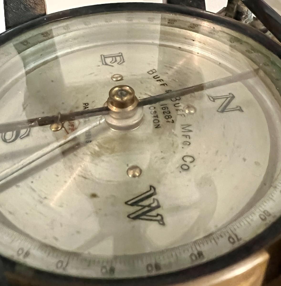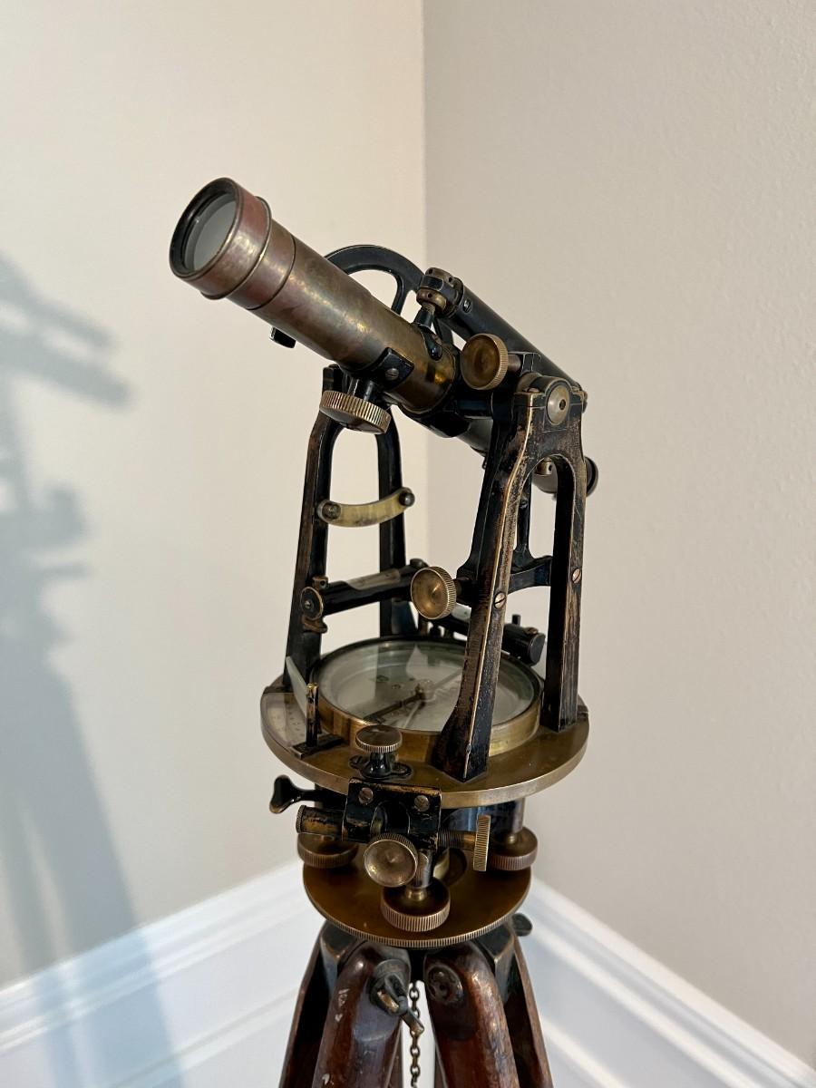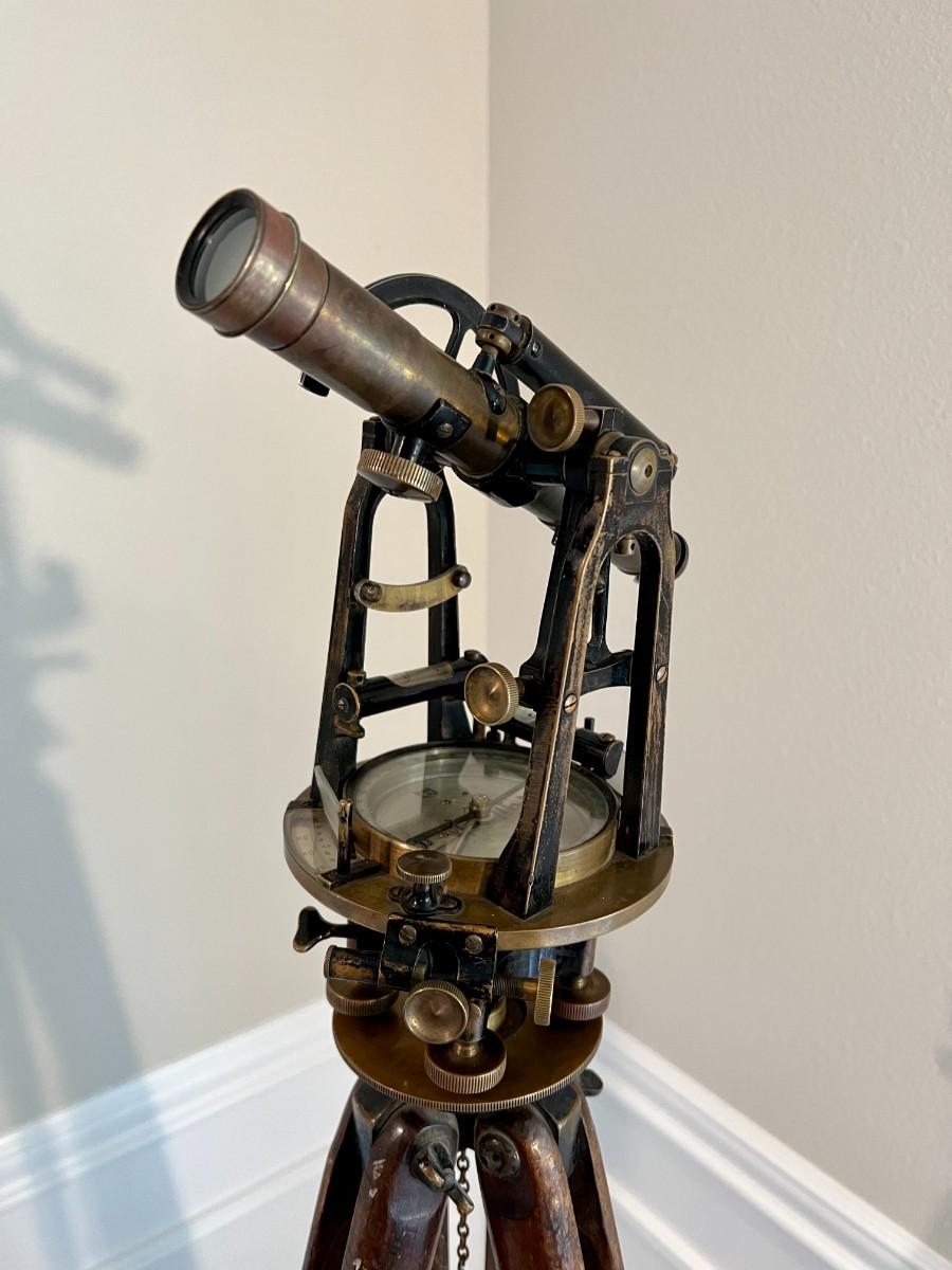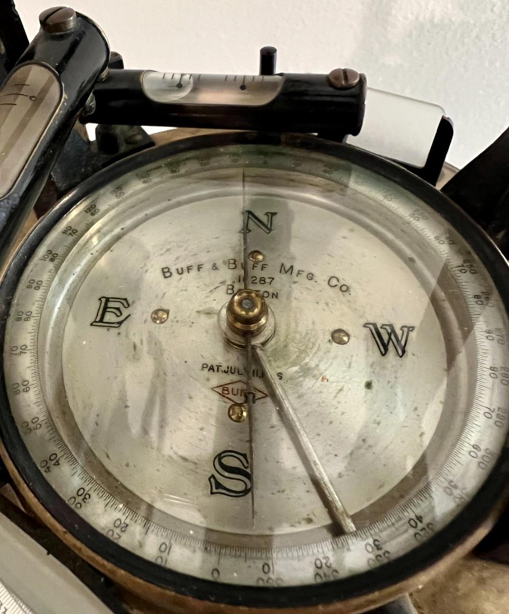 Wonderful and rare antique surveyor's tripod! Designed by EG Soltmann Inc in New York, with components made by Buff & Buff Manufacturing Company in Boston. Engineering level and surveying tripod on original stand with original box. Own a piece of American engineering history!