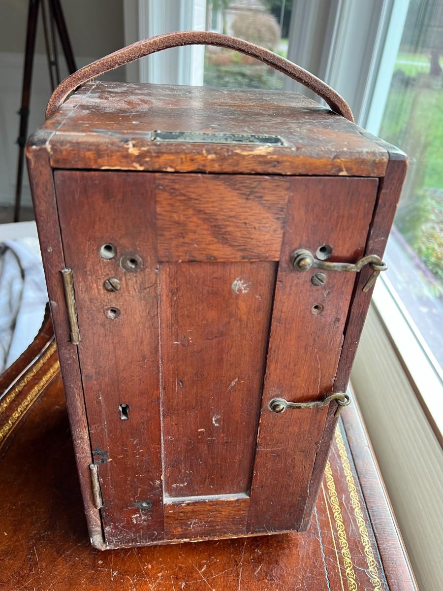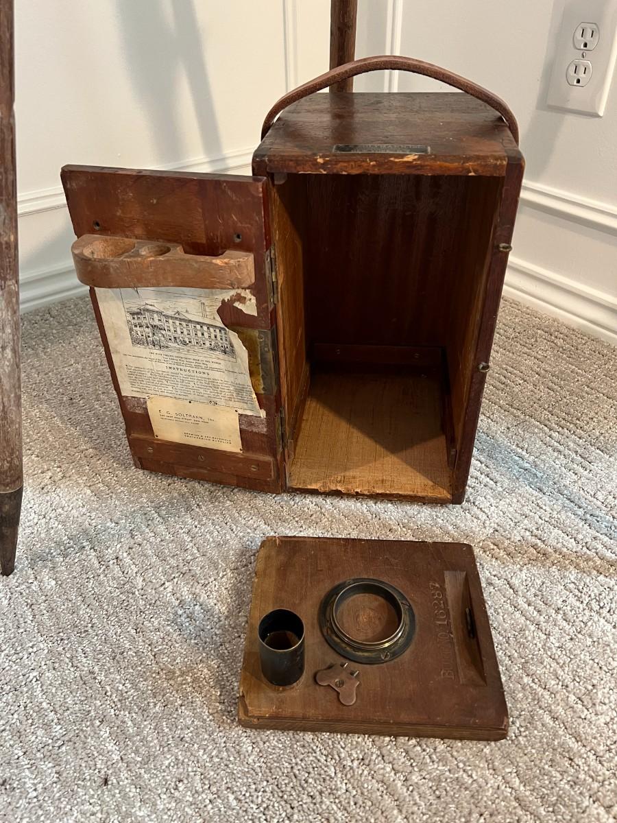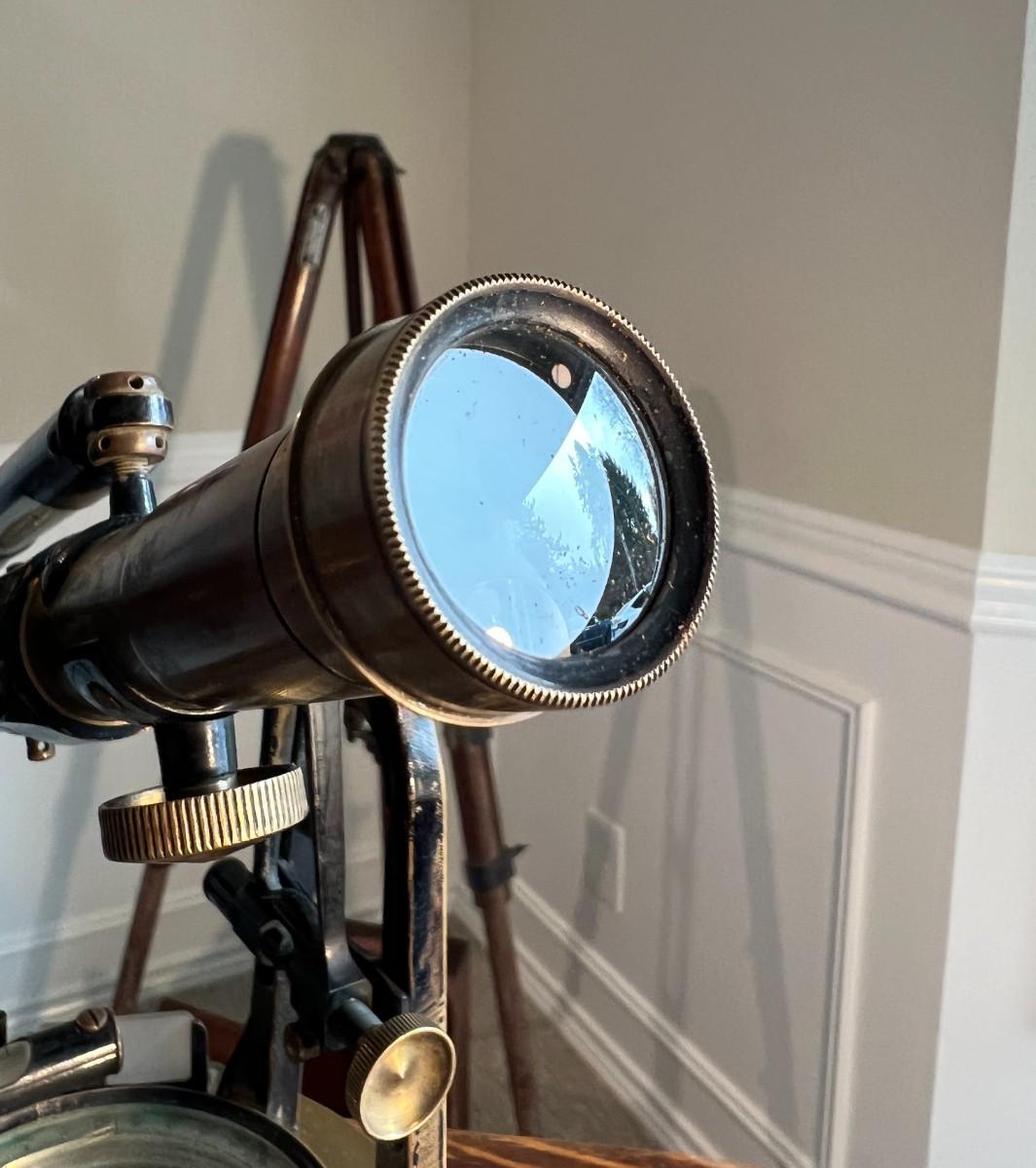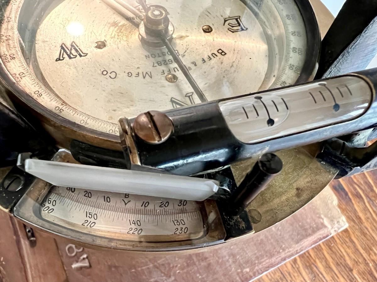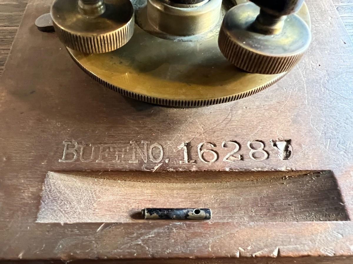 Wonderful and rare antique surveyor's tripod! Designed by EG Soltmann Inc in New York, with components made by Buff & Buff Manufacturing Company in Boston. Engineering level and surveying tripod on original stand with original box. Own a piece of American engineering history!