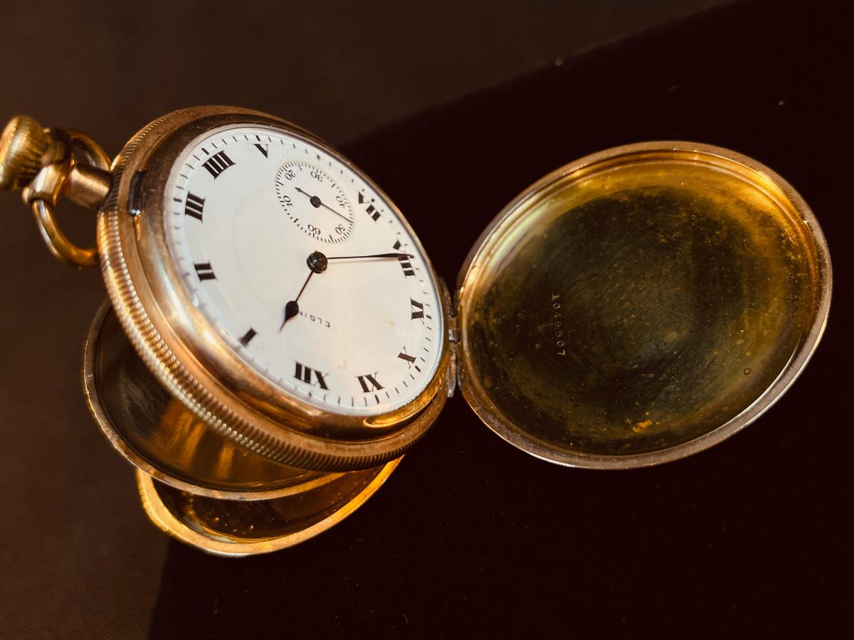 The subject item is an antique Elgin pocket watch housed in a 20 Years yellow gold case. The watch winds, but does not tick.