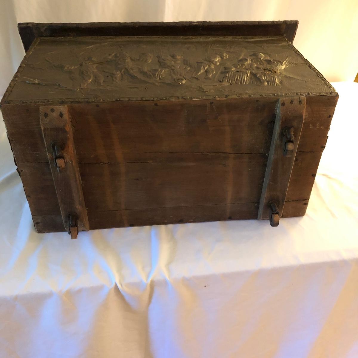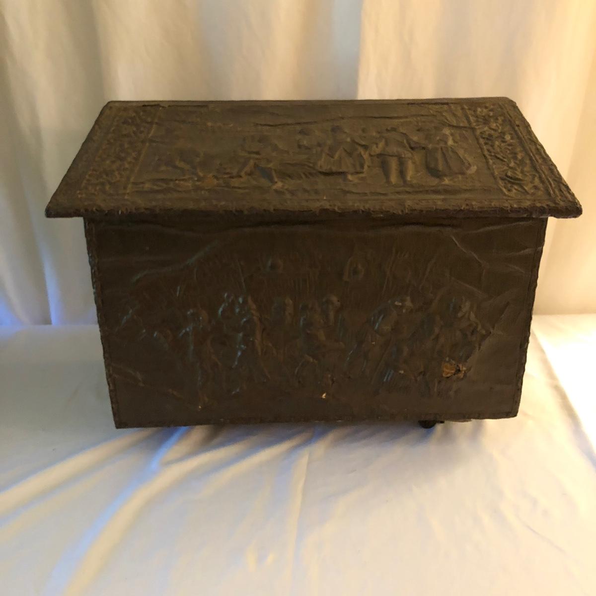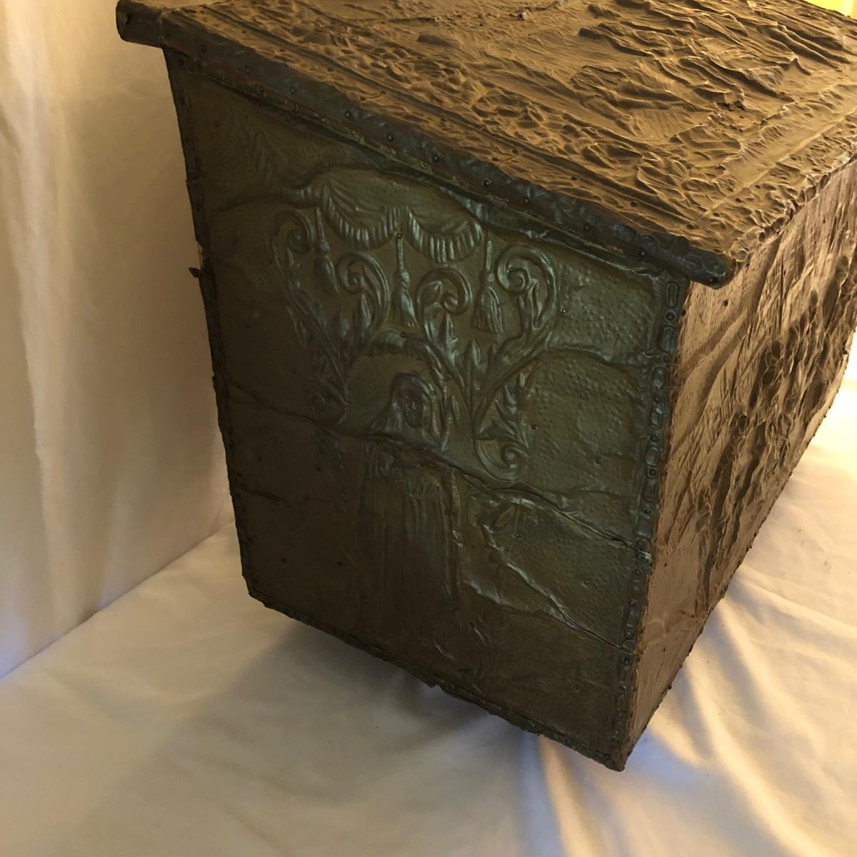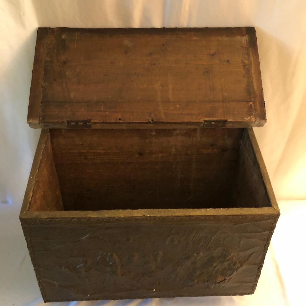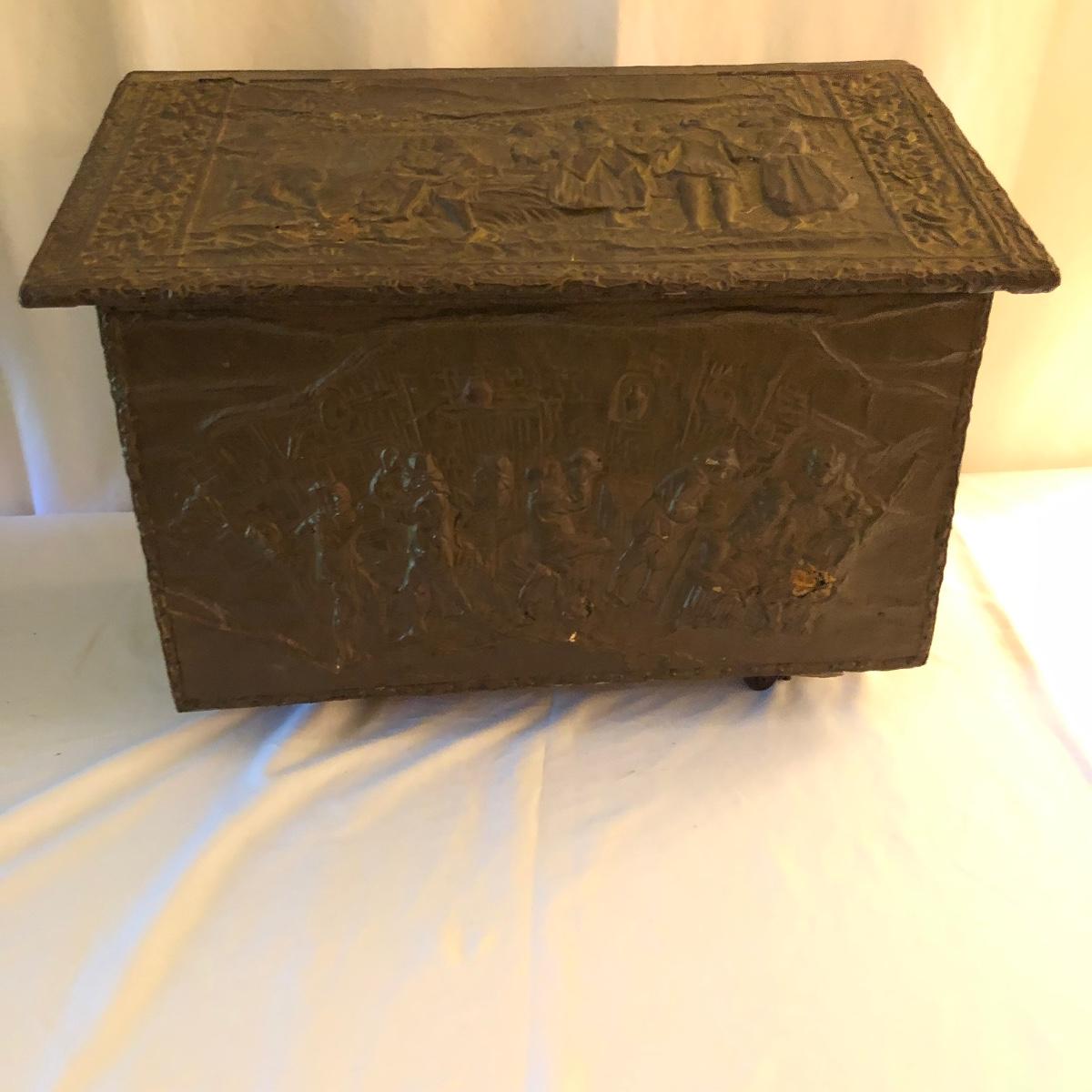Lot includes antique embossed metal (likely tin) over wood chest with casters. Chest has spot on front where metal is missing and various nicks and creases on the metal, see pictures. Chest measures 12.5” x 23.5” x 17”.
