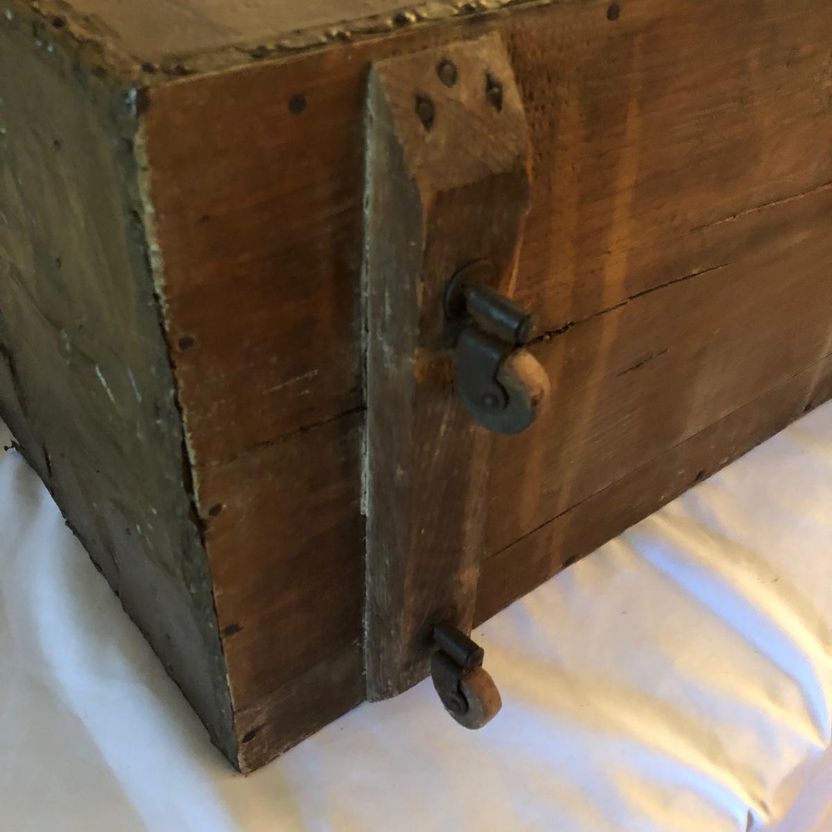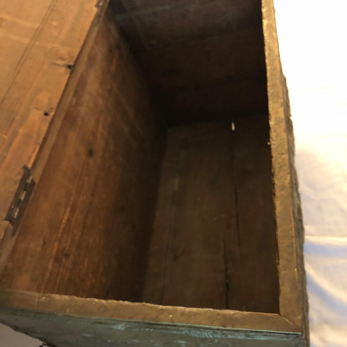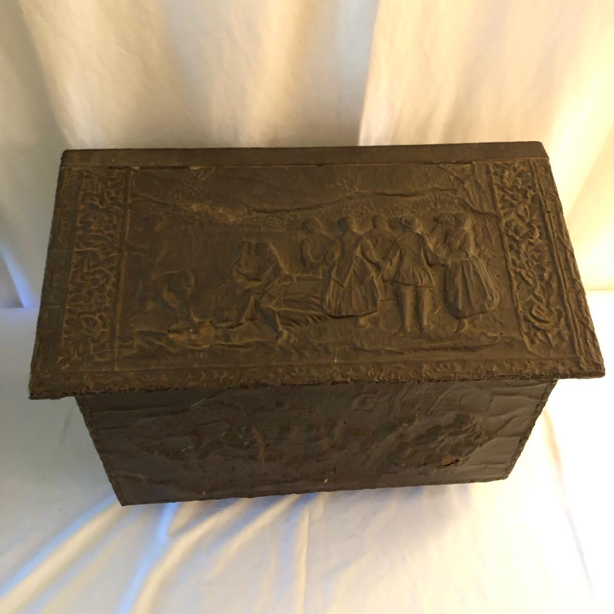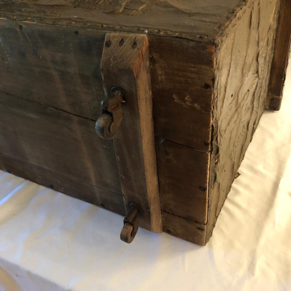 Lot includes antique embossed metal (likely tin) over wood chest with casters. Chest has spot on front where metal is missing and various nicks and creases on the metal, see pictures. Chest measures 12.5” x 23.5” x 17”.