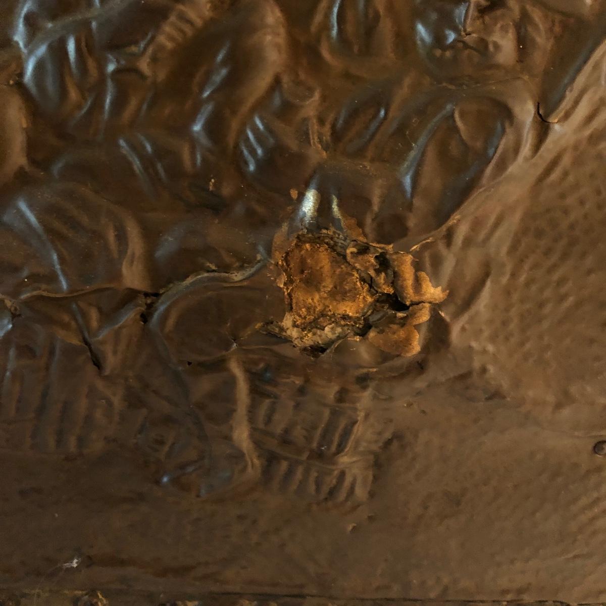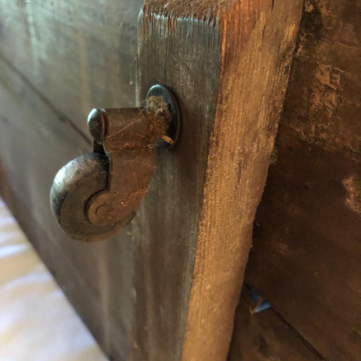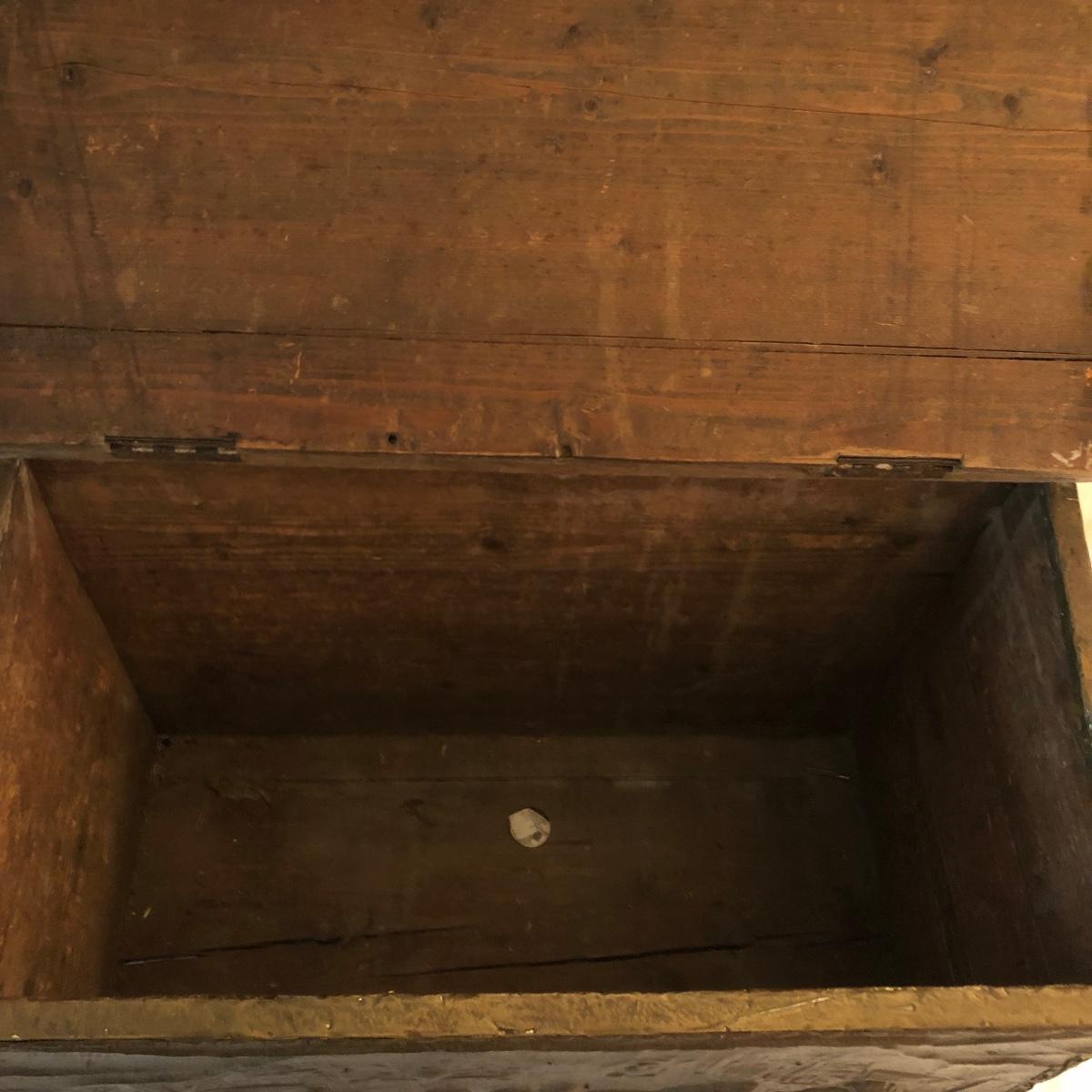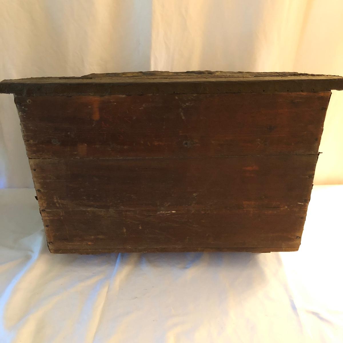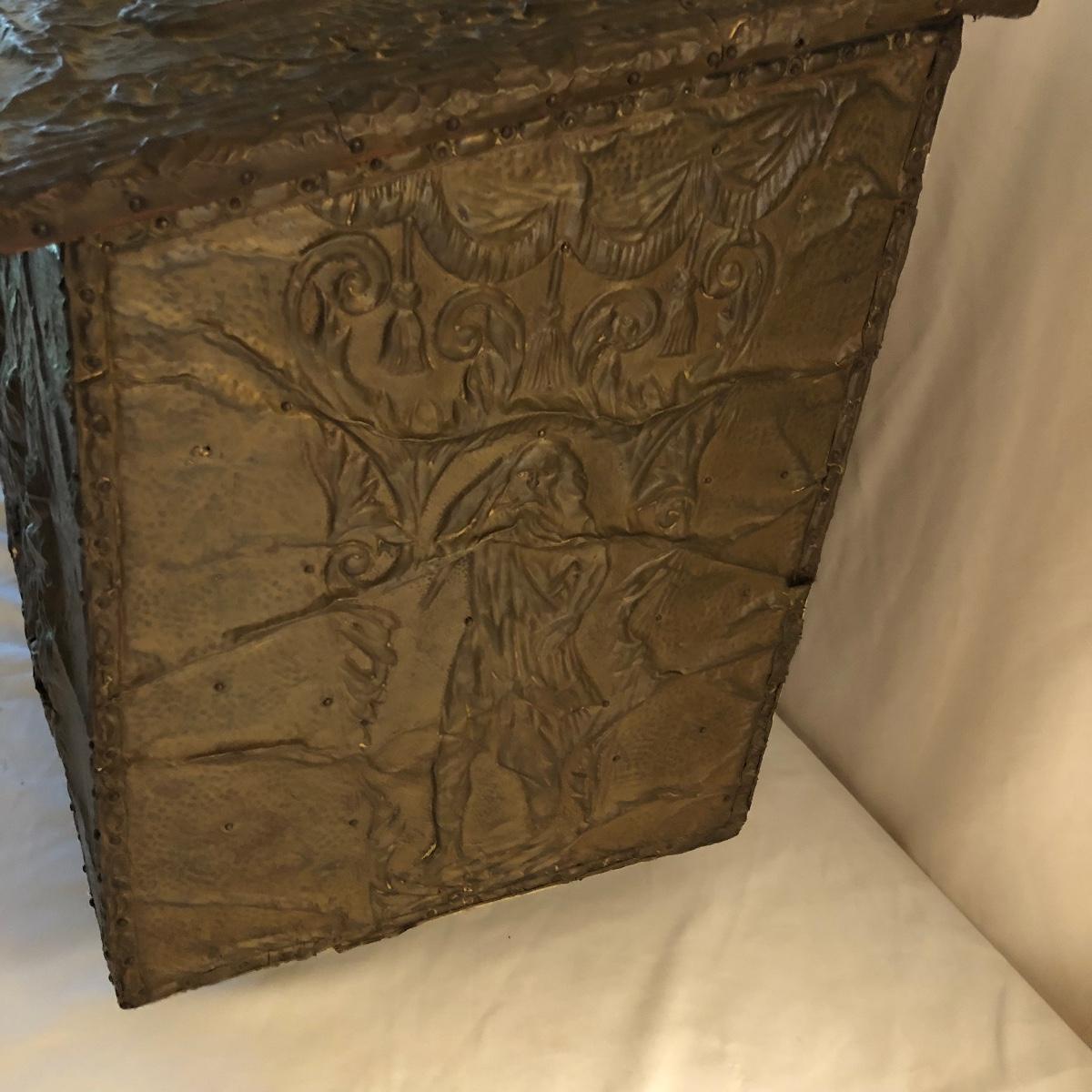 Lot includes antique embossed metal (likely tin) over wood chest with casters. Chest has spot on front where metal is missing and various nicks and creases on the metal, see pictures. Chest measures 12.5” x 23.5” x 17”.