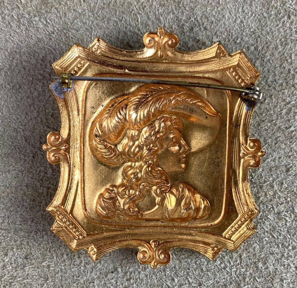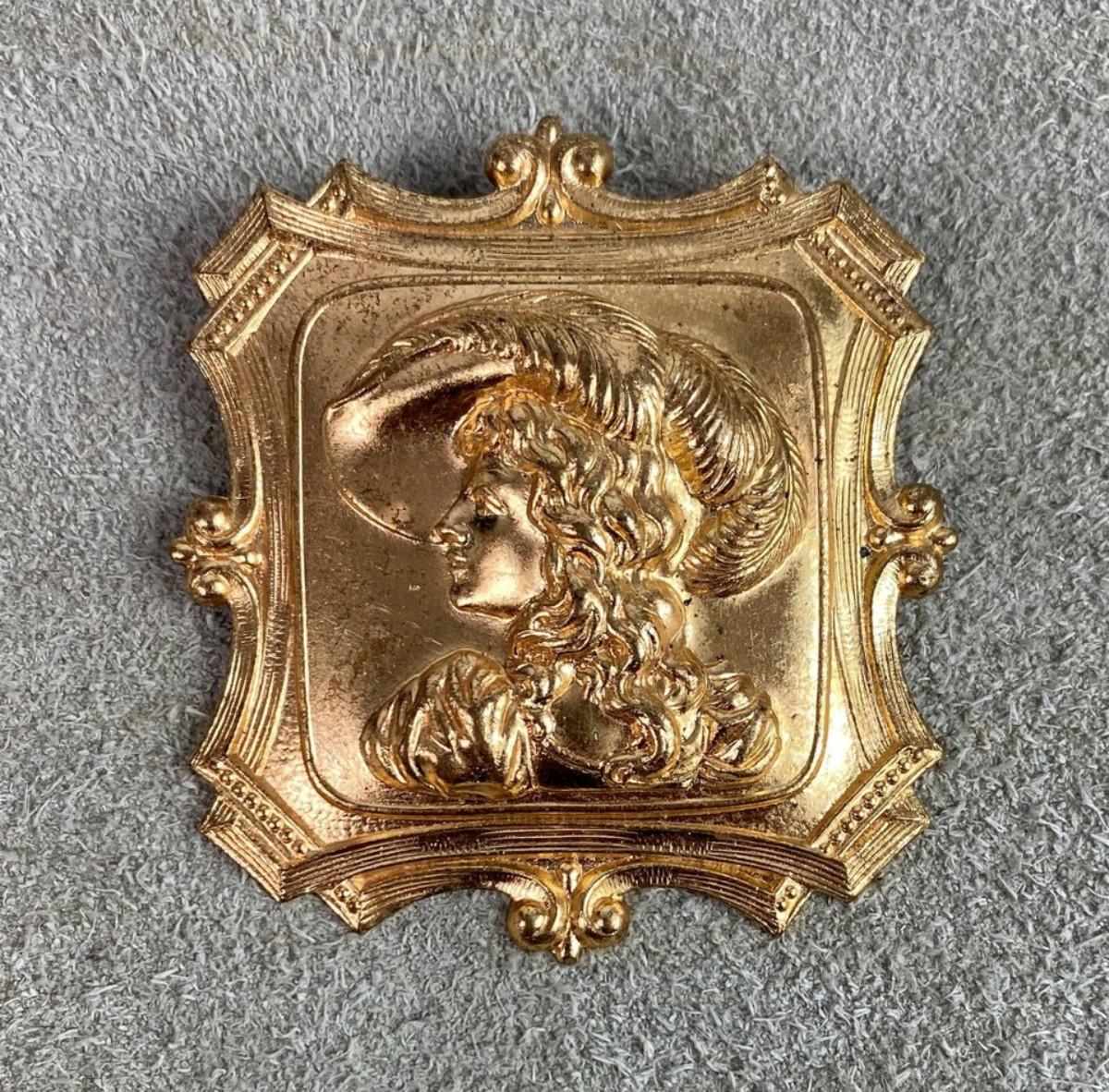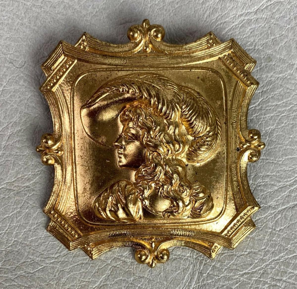 an embossed gold-tone metal pin that is certainly vintage and perhaps antique? Elegant art nouveau style lady with a feathered hat and flowing hair in relief...2"/50mm...Pinback...as shown...Unknown maker or exact age?