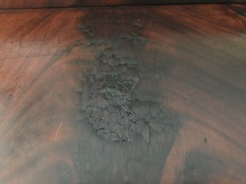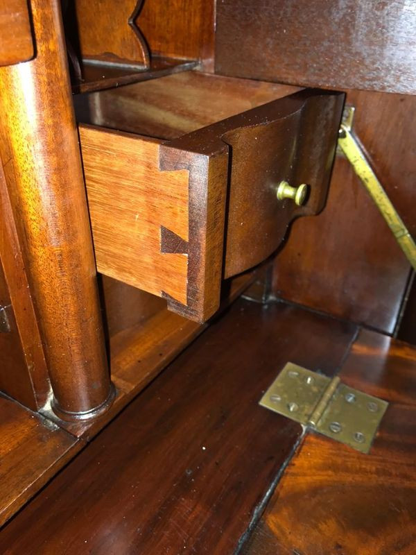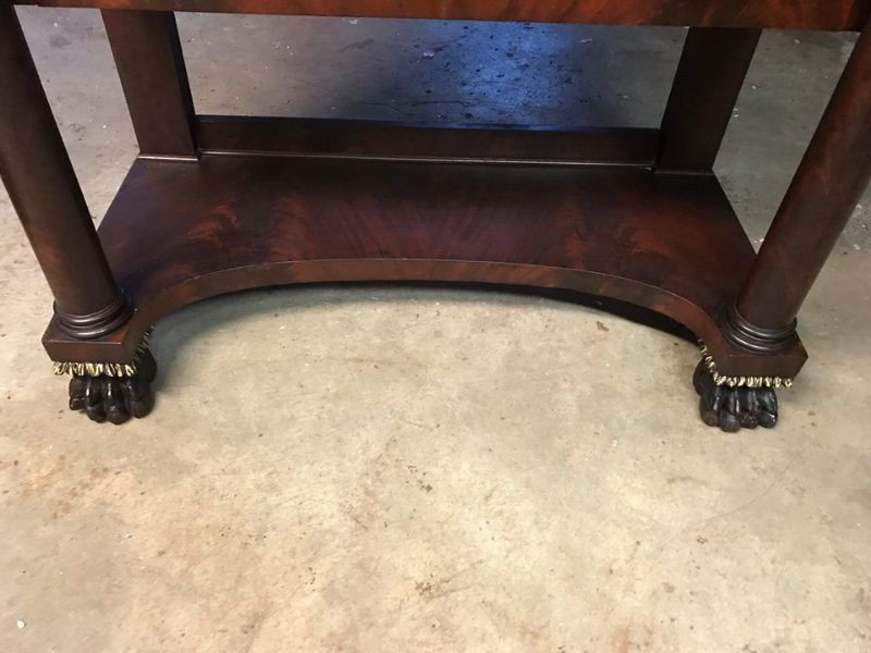 Up for sale is this beautiful Empire Classical mahogany butler's desk. This is a very rare form. The desk is a drop front design. The desktop sits on two flame veneer columns that are attached to a plinth atop of hairy paw feet. It is 19th Century. It is made of mahogany veneers. It has a fully fitted interior. The drawers are hand dovetailed and the bottoms of the drawers are hand chamfered. The entire drawers are made of mahogany. It has a functioning lock and key. It has it’s original ball casters. Overall condition is very good. It does have the normal wear and tear of an antique of this age, such as light surface scratches, shrinkage of veneer and a few missing small chips. There is a blister on the top, but all the veneer is currently stable.(See photo). Overall, it does not deter from the value. The dimensions are: 51 1/4" tall by 43" wide by 21" deep.