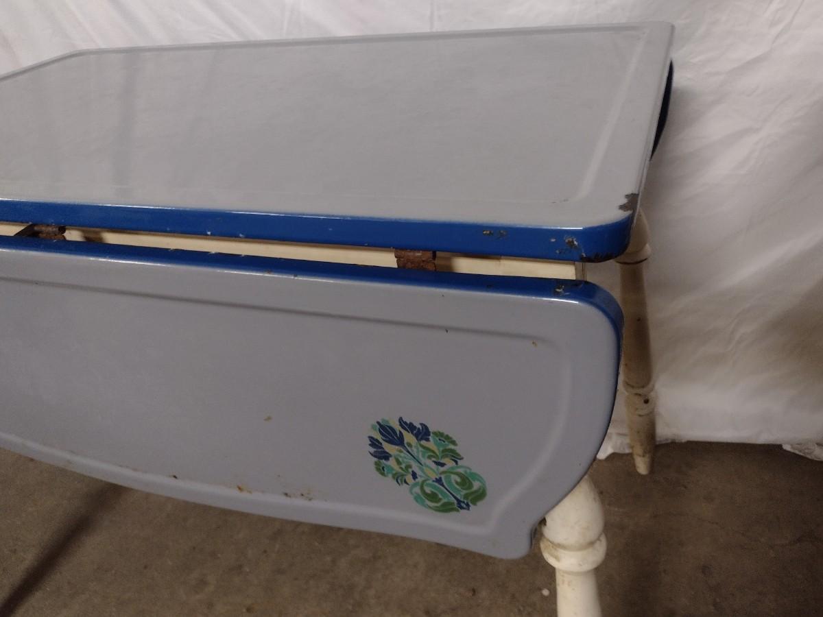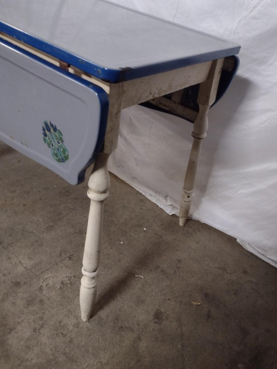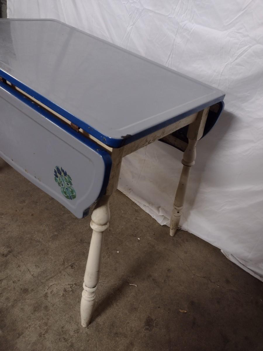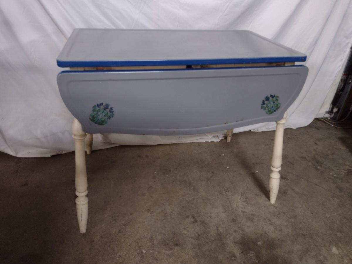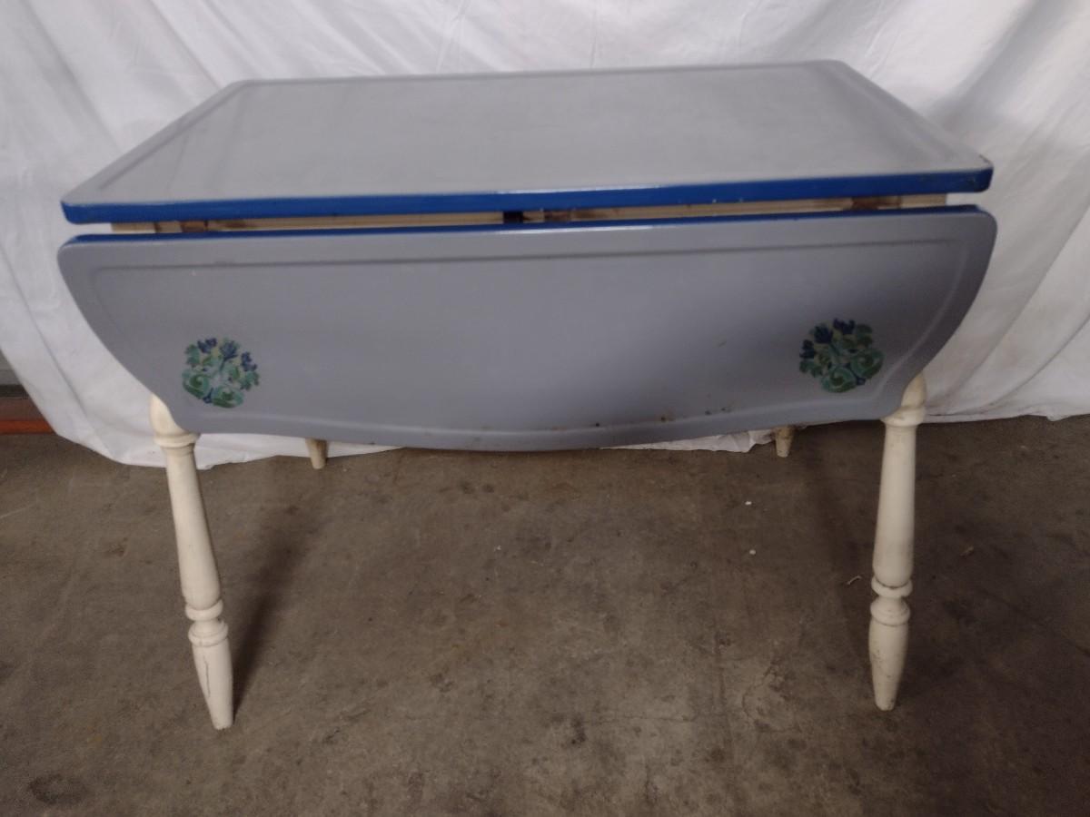 Antique Enamel Drop Leaf Table. Has one spot of missing enamel as shown.