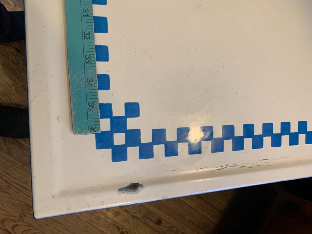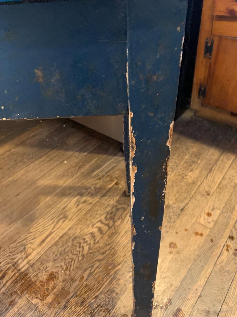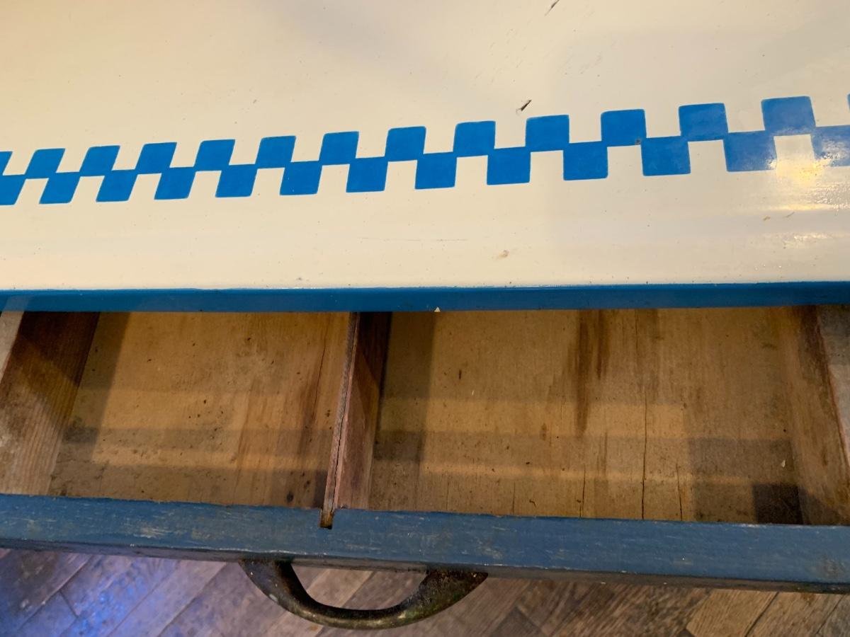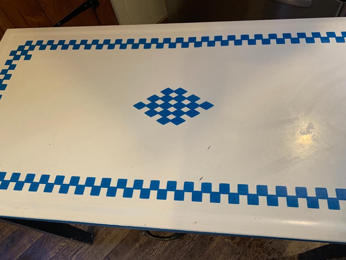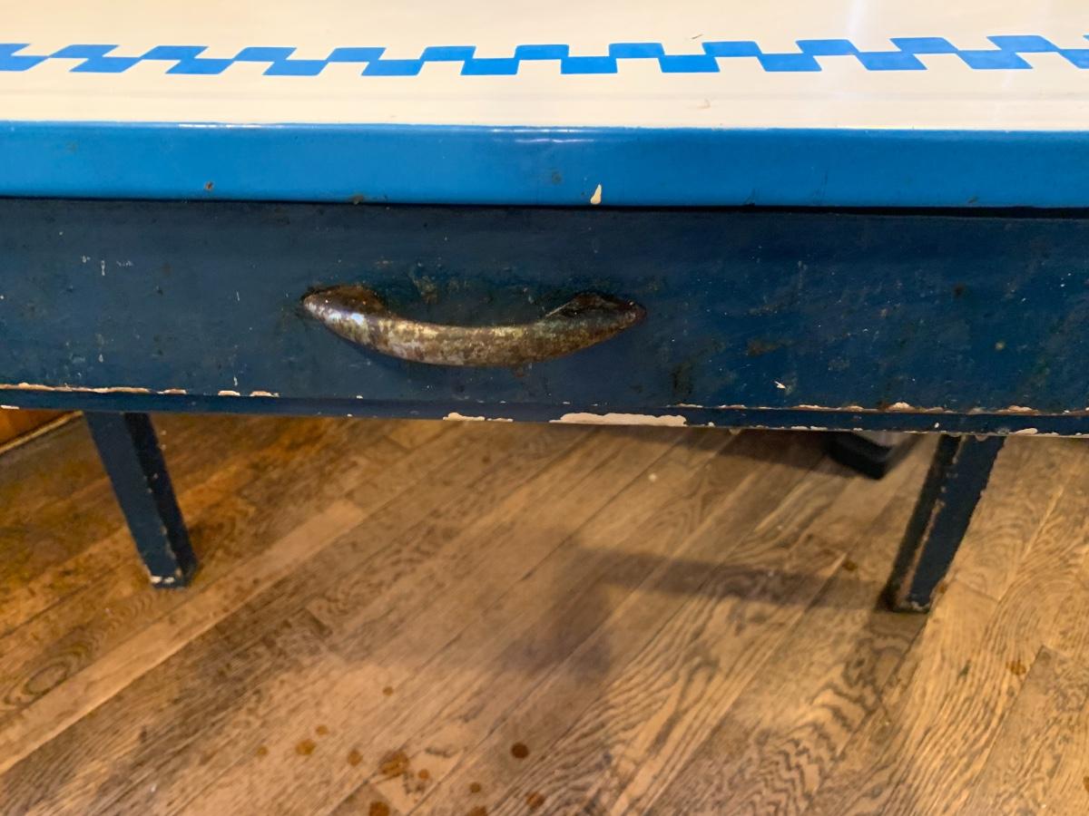 Antique enamel table with one divided drawer. Table meaasures 39" across. Surface in excellent condition except fo rminor chip in enamel and some signs of wear, There is wear on the wood and could use a fresh coat of paint.