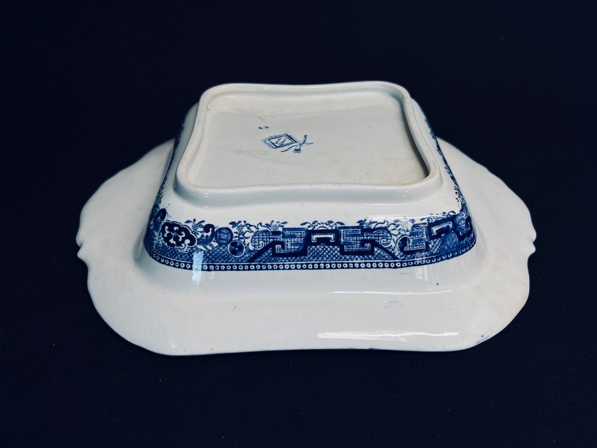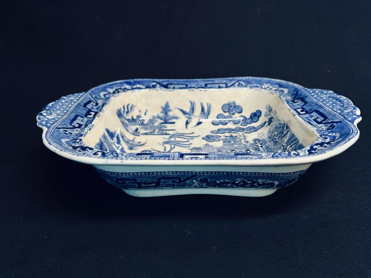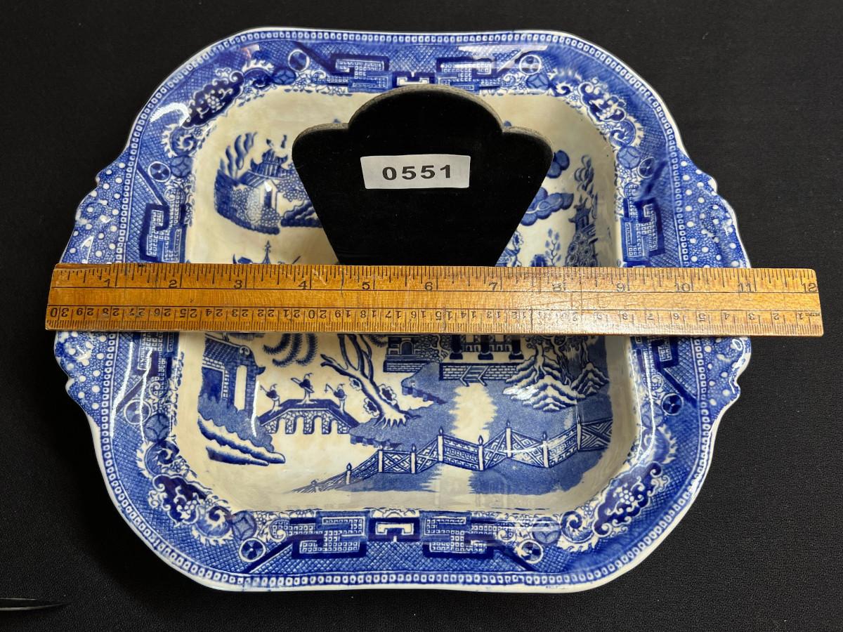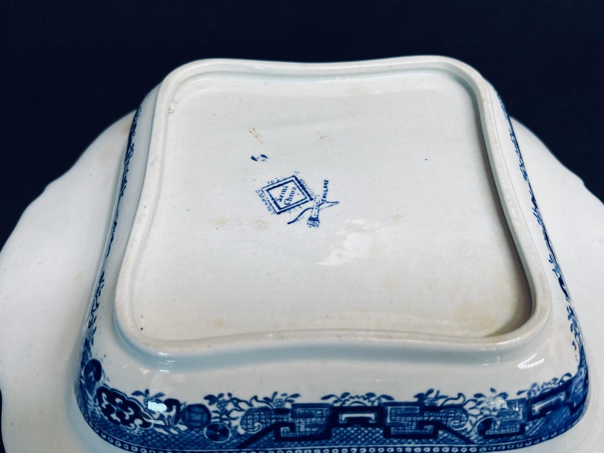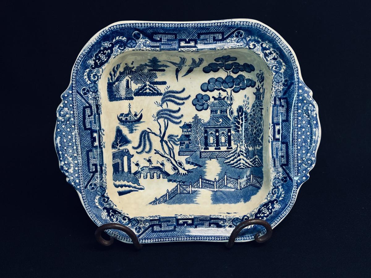 Square Vegetable Dish. Blue transfer Willow pattern marked on bottom "England."