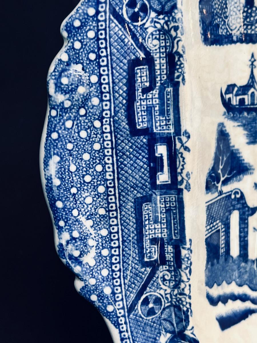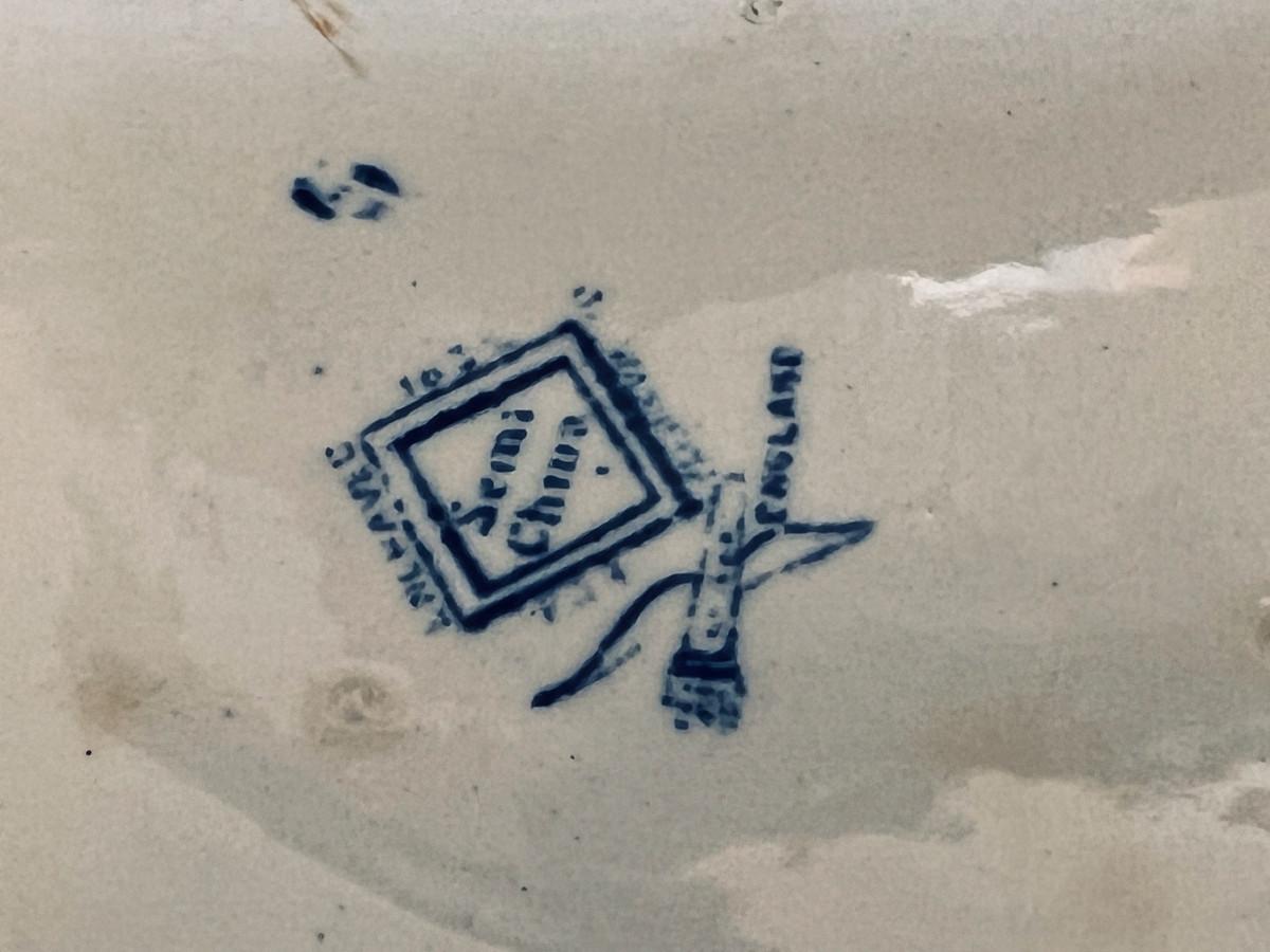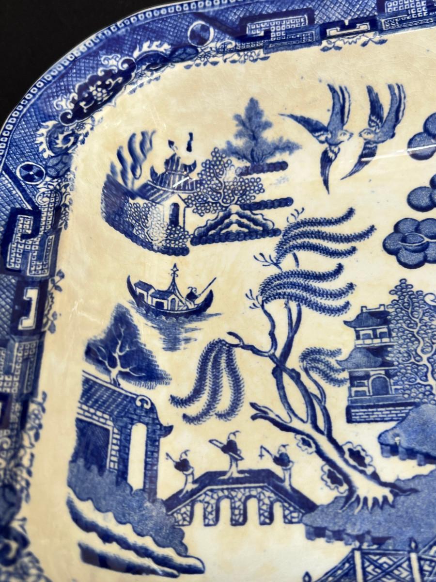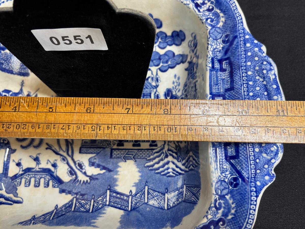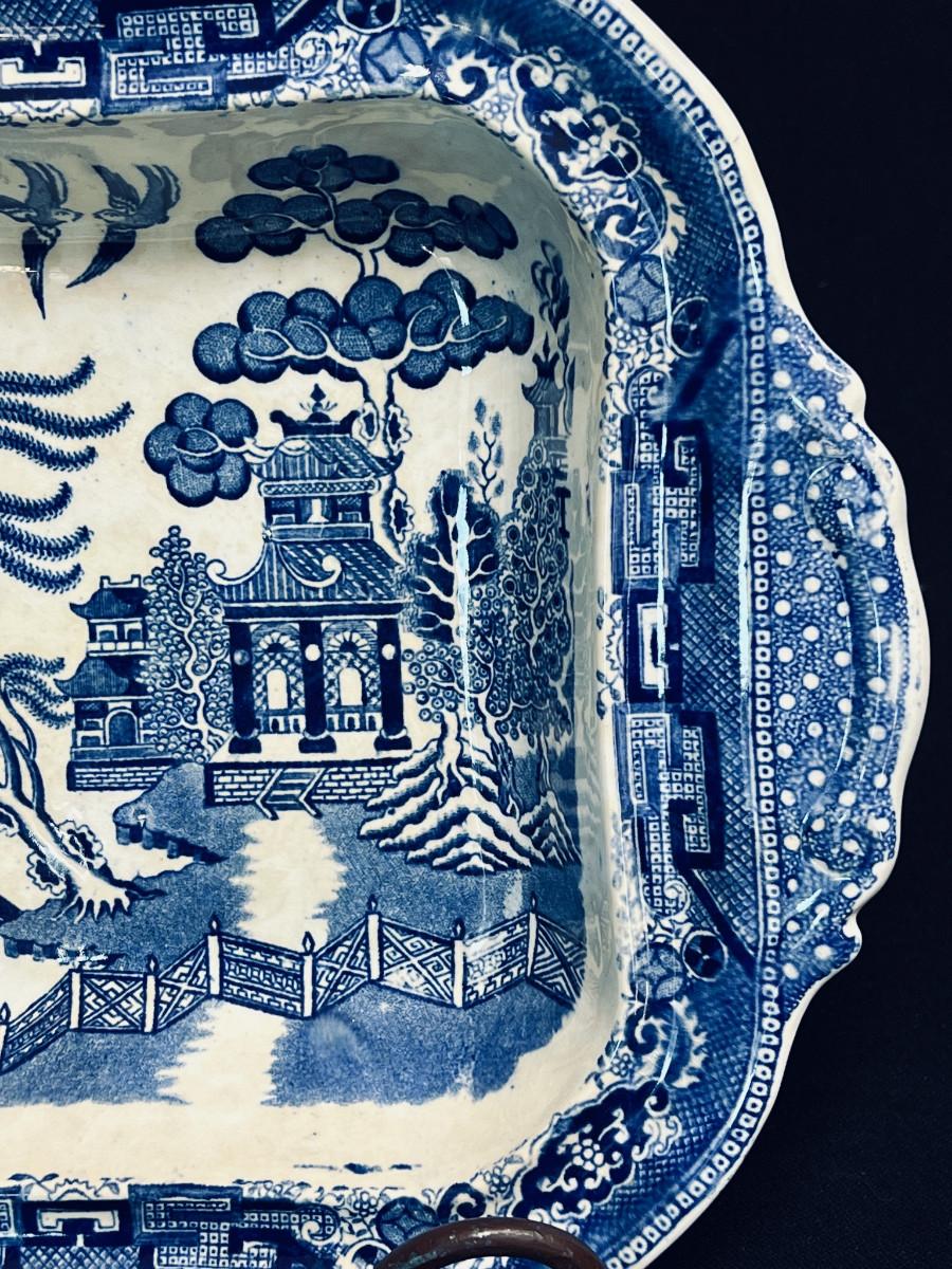 Square Vegetable Dish. Blue transfer Willow pattern marked on bottom "England."
