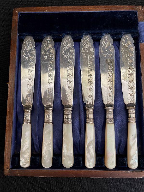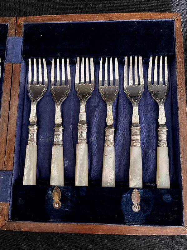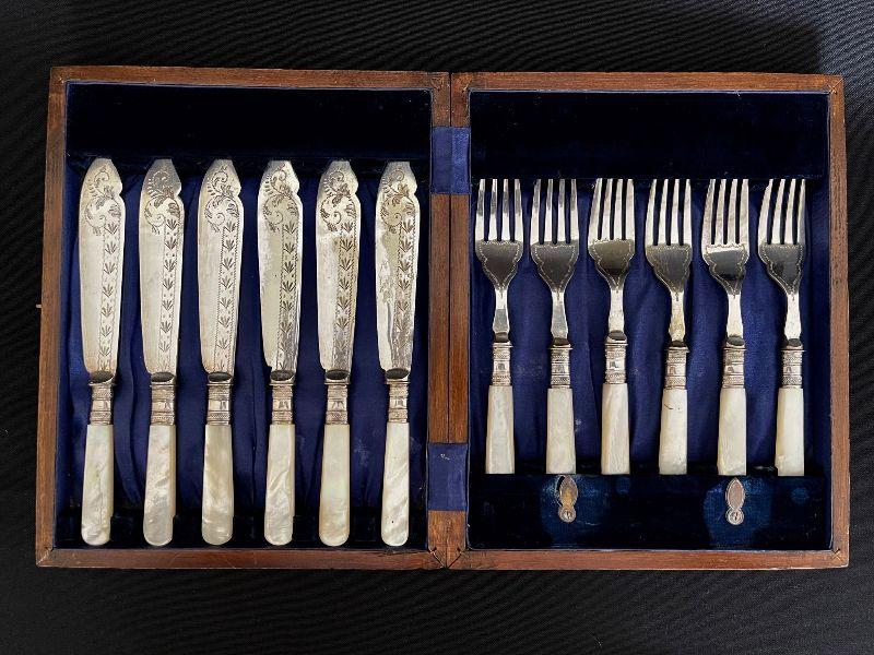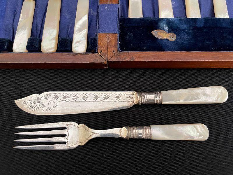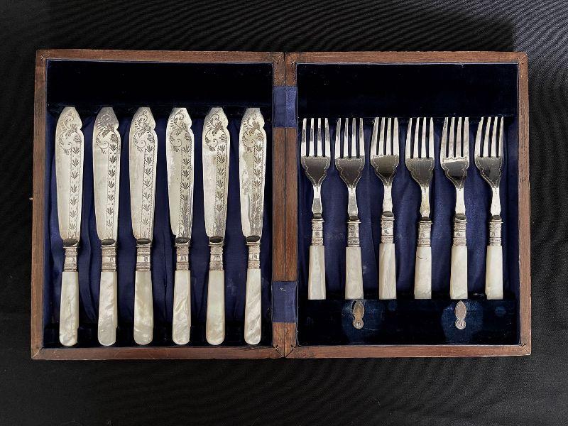 The subject item for auction sale is an antique fish flatware set composed of six knives and six forks set into the original satin lined custom wood case. Each silver plate piece is elegantly hand engraved and fitted with genuine mother-of-pearl handles and hallmarked. This set retains an original certificate from the famous “Dicken's Old Curiosity Shop” in London, England.