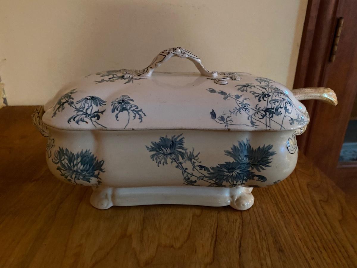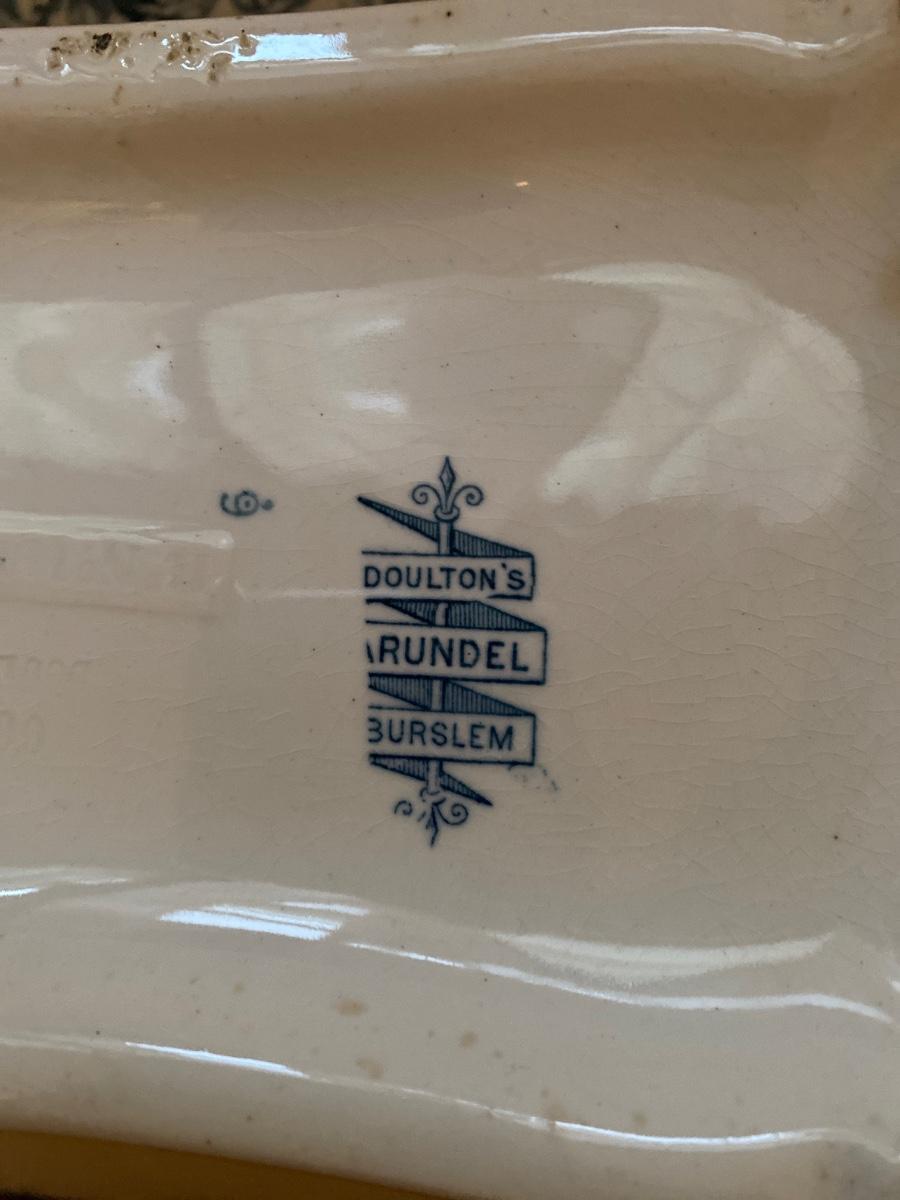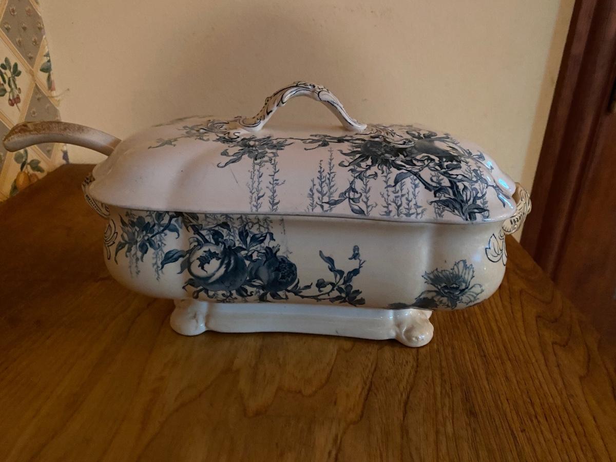 Antique English soup tureen and ladle. Marked Doulton’s Grundell Burslem. I don’t think the ladle matches but it looks good with the tureen. Approx 13-3/4w x 7-1/2d x 7-1/2h to top of handle. Very nice antique condition.