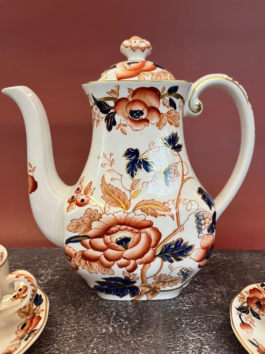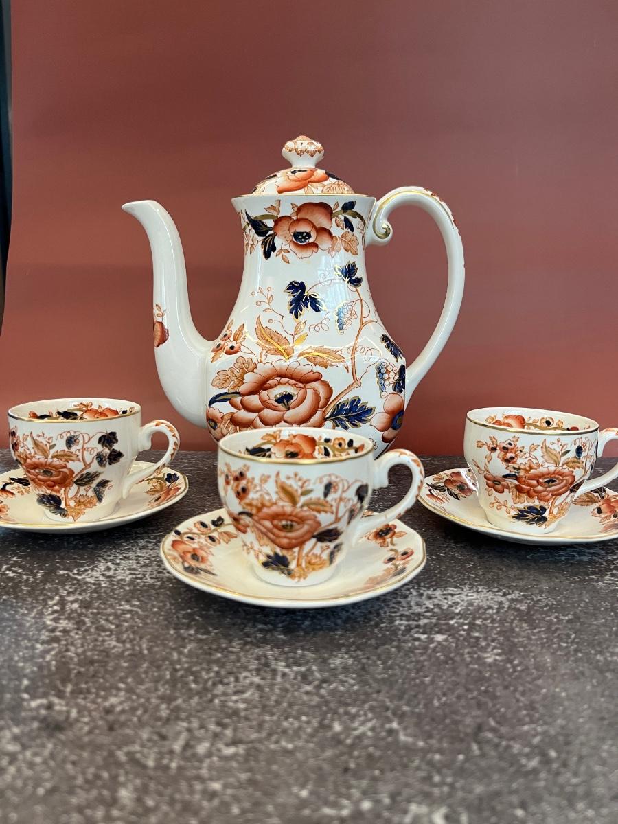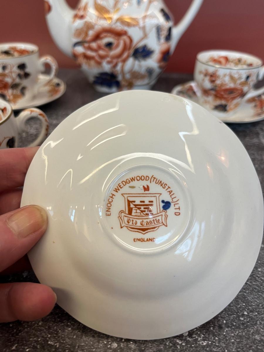 ANTIQUE ENOCH WEDGWOOD OLD CASTLE IMARI COFFEE POT WITH THREE CUPS AND SAUCERS, CIRCA 1900