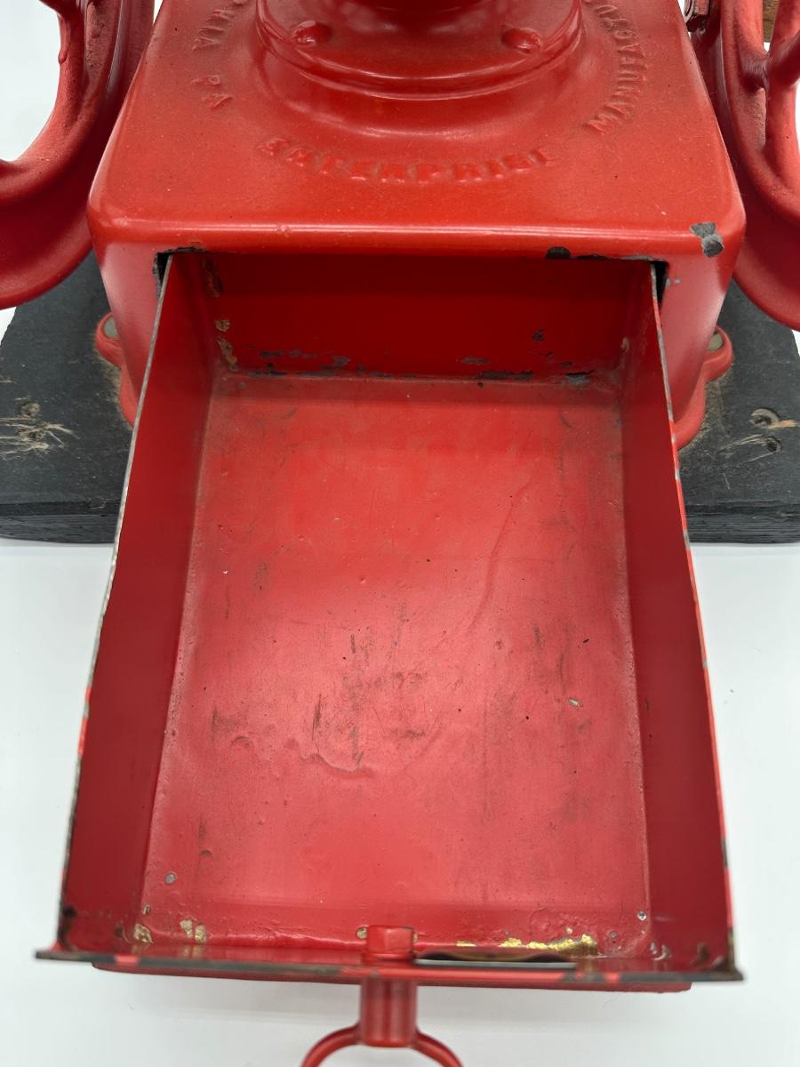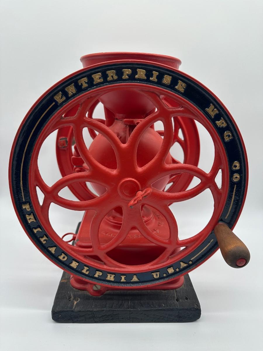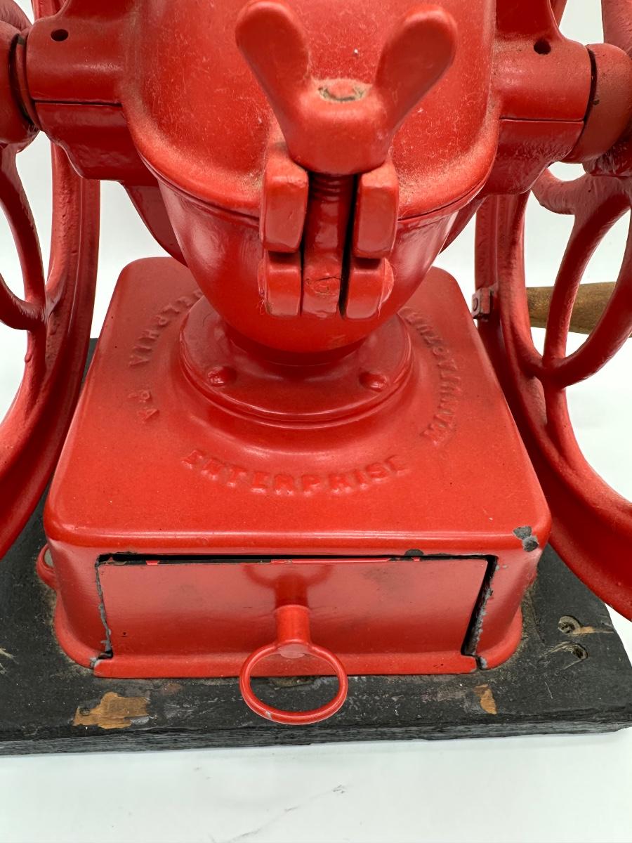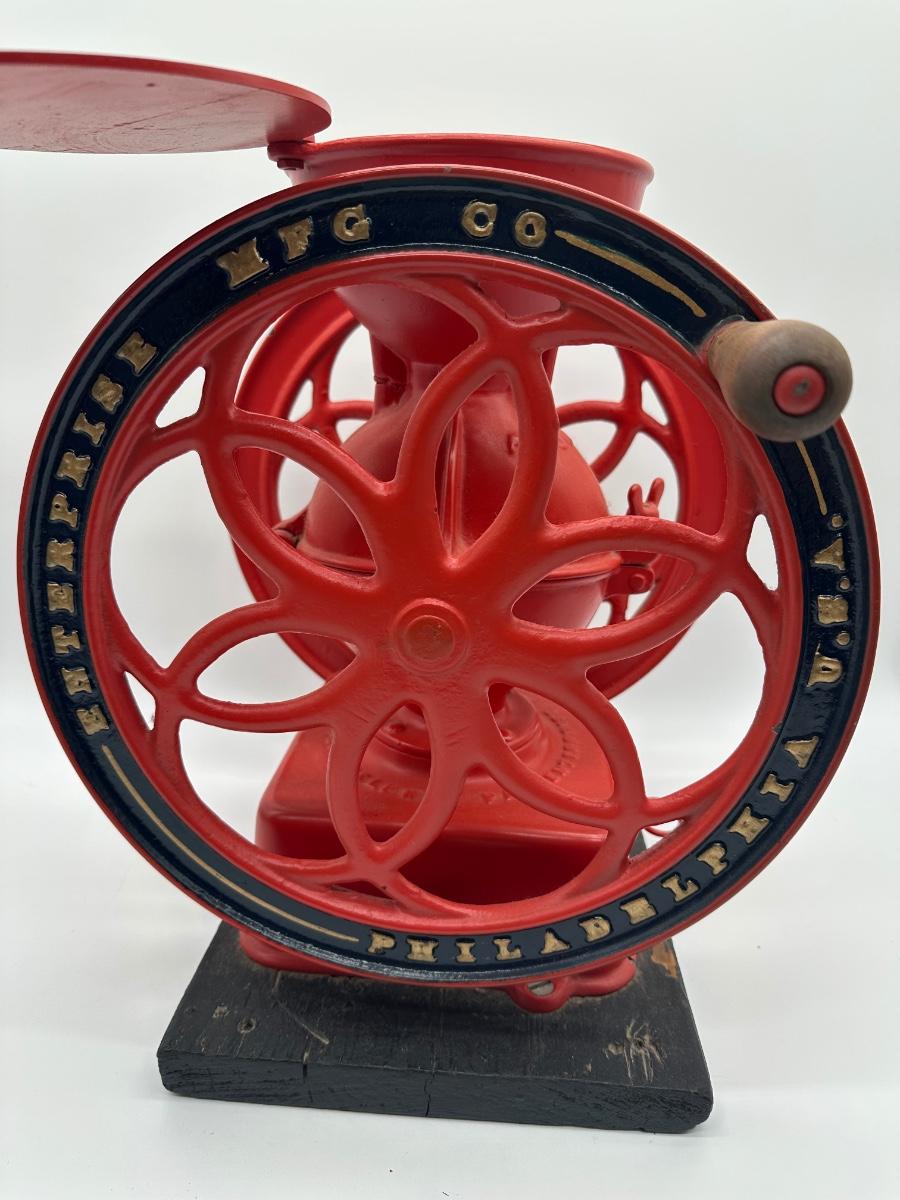 Antique cast iron hand-crank coffee grinder by Enterprise Mfg. Co., Philadelphia. Complete with original wheel, crank handle, hopper lid, and drawer. Repainted red with gold lettering; gears turn freely. Mounted on wood base—excellent farmhouse or industrial décor.