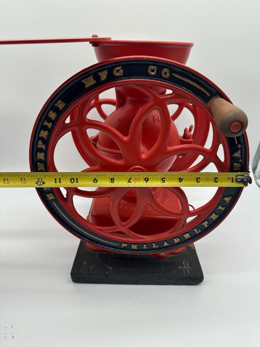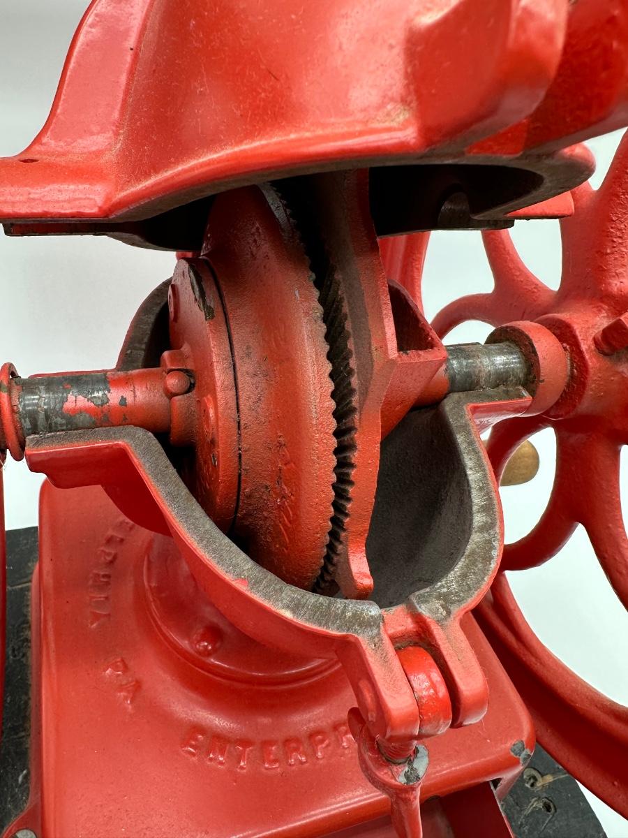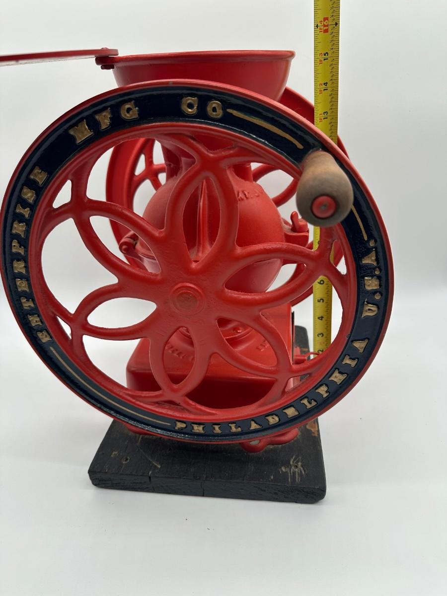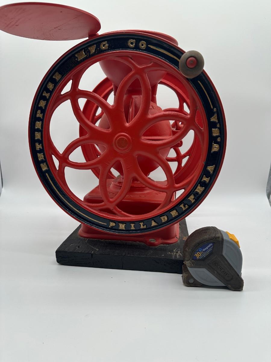 Antique cast iron hand-crank coffee grinder by Enterprise Mfg. Co., Philadelphia. Complete with original wheel, crank handle, hopper lid, and drawer. Repainted red with gold lettering; gears turn freely. Mounted on wood base—excellent farmhouse or industrial décor.
