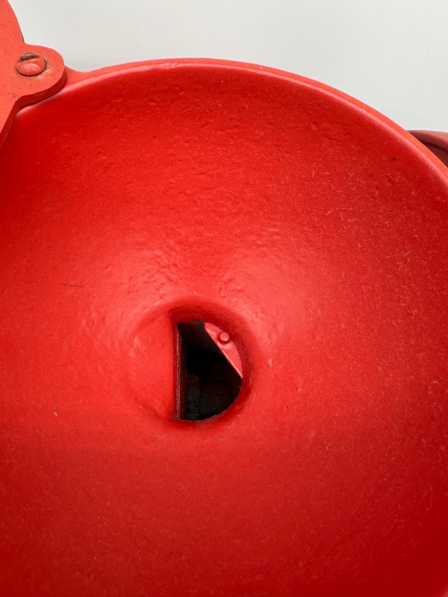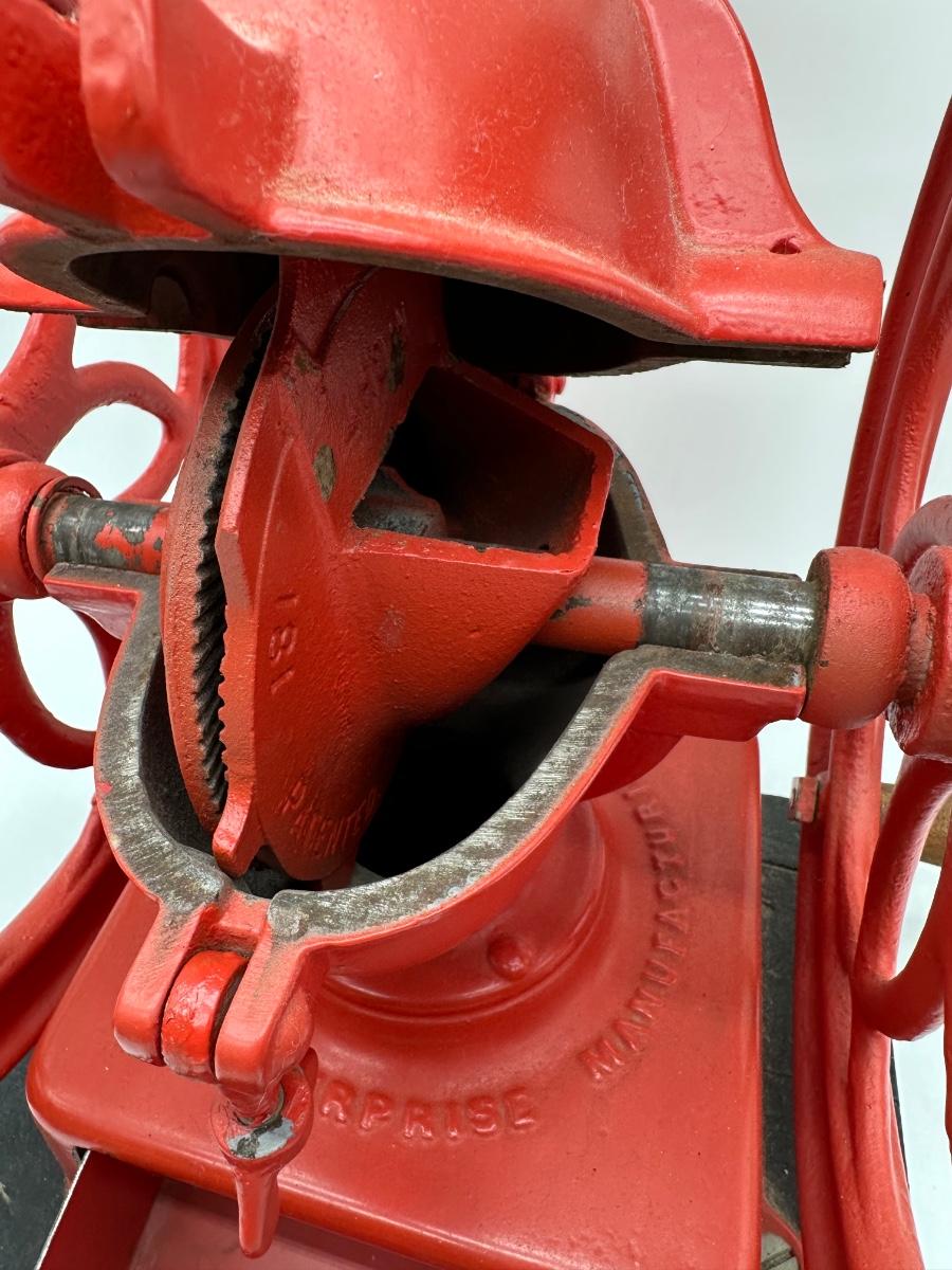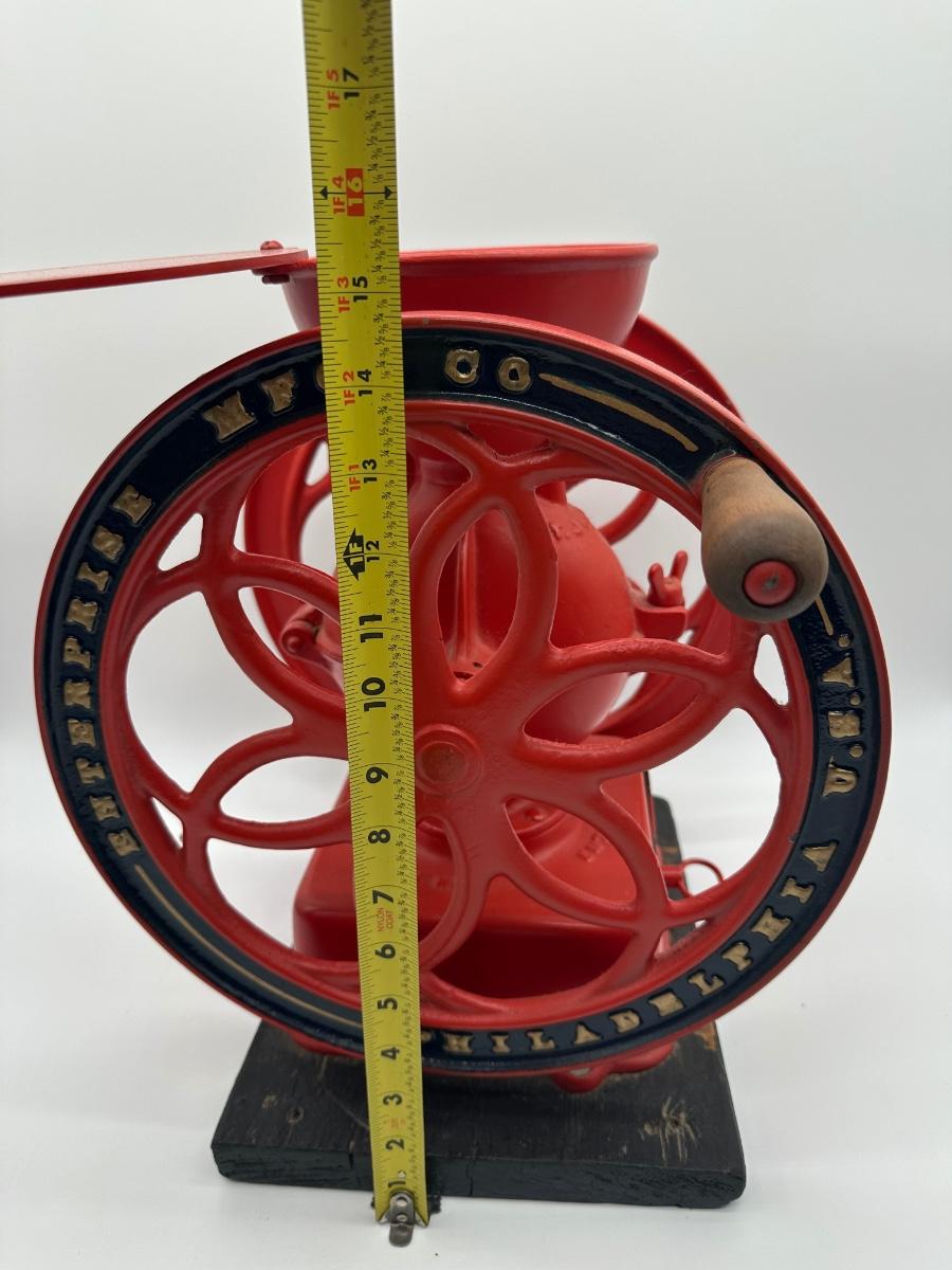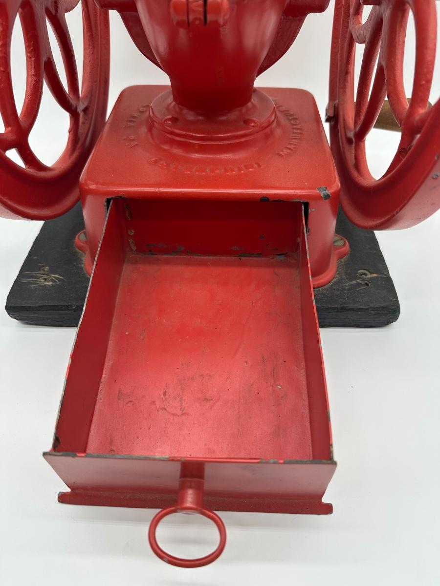 Antique cast iron hand-crank coffee grinder by Enterprise Mfg. Co., Philadelphia. Complete with original wheel, crank handle, hopper lid, and drawer. Repainted red with gold lettering; gears turn freely. Mounted on wood base—excellent farmhouse or industrial décor.