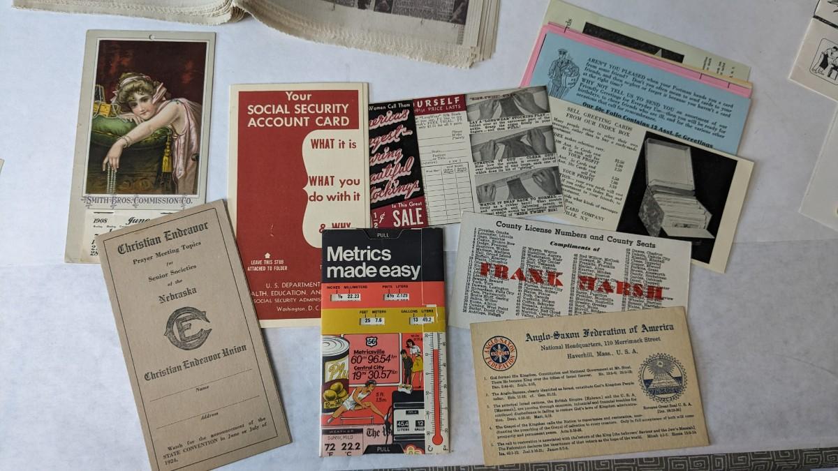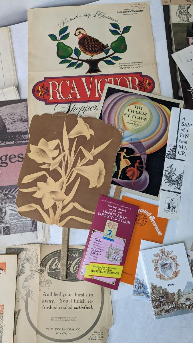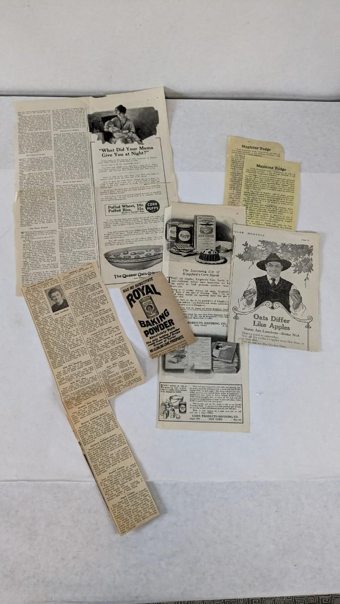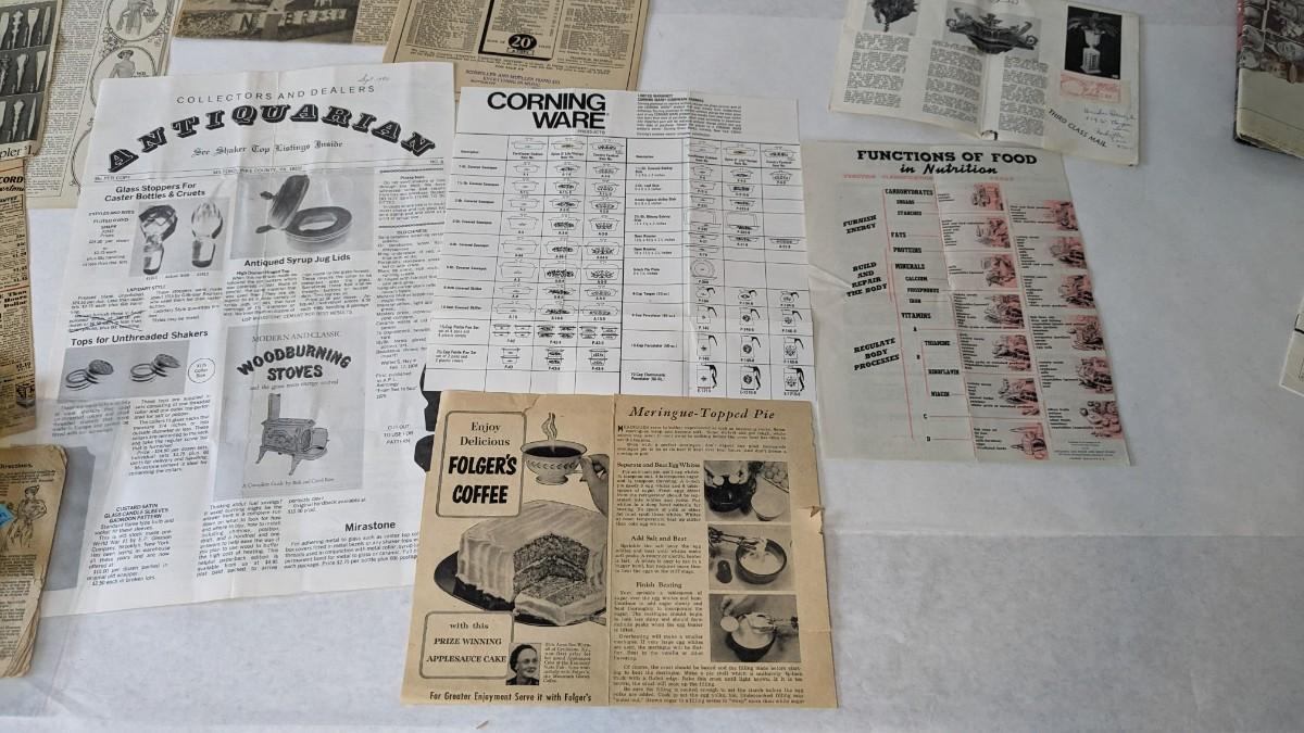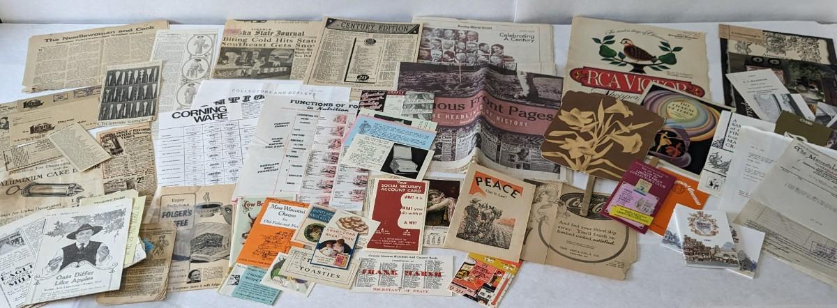 Some truly incredible pieces of varied advertising, informational, and newspaper items in this wonderful ephemera assortment! Includes 1908 calendar, various kitchen guides and ads, paper fans (please note piece with broken handle) informational booklets, and so much more! This is an amazing upcycle or history buff lot!