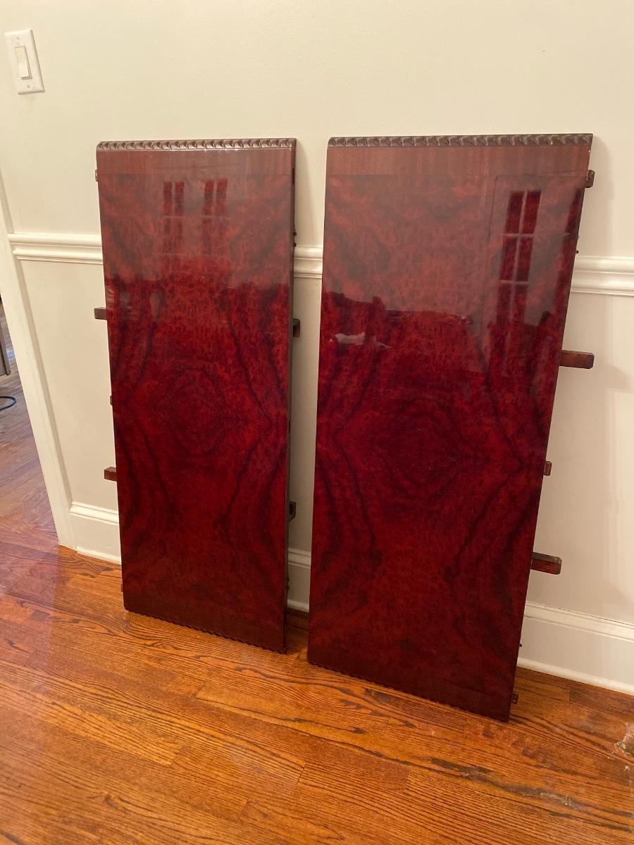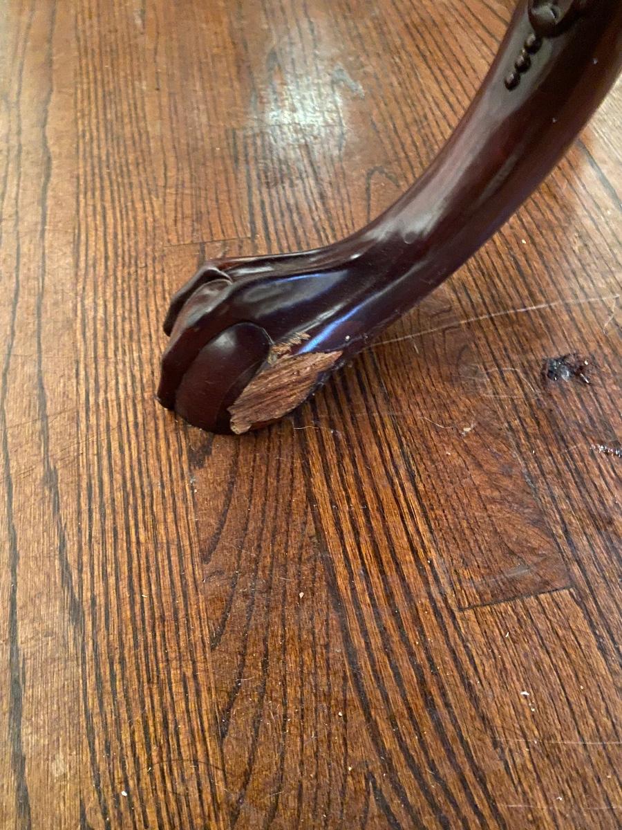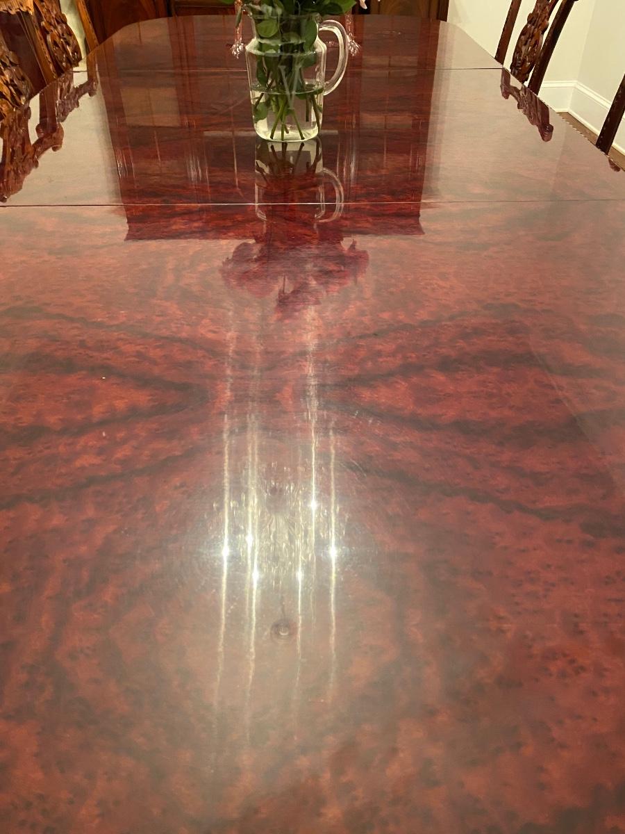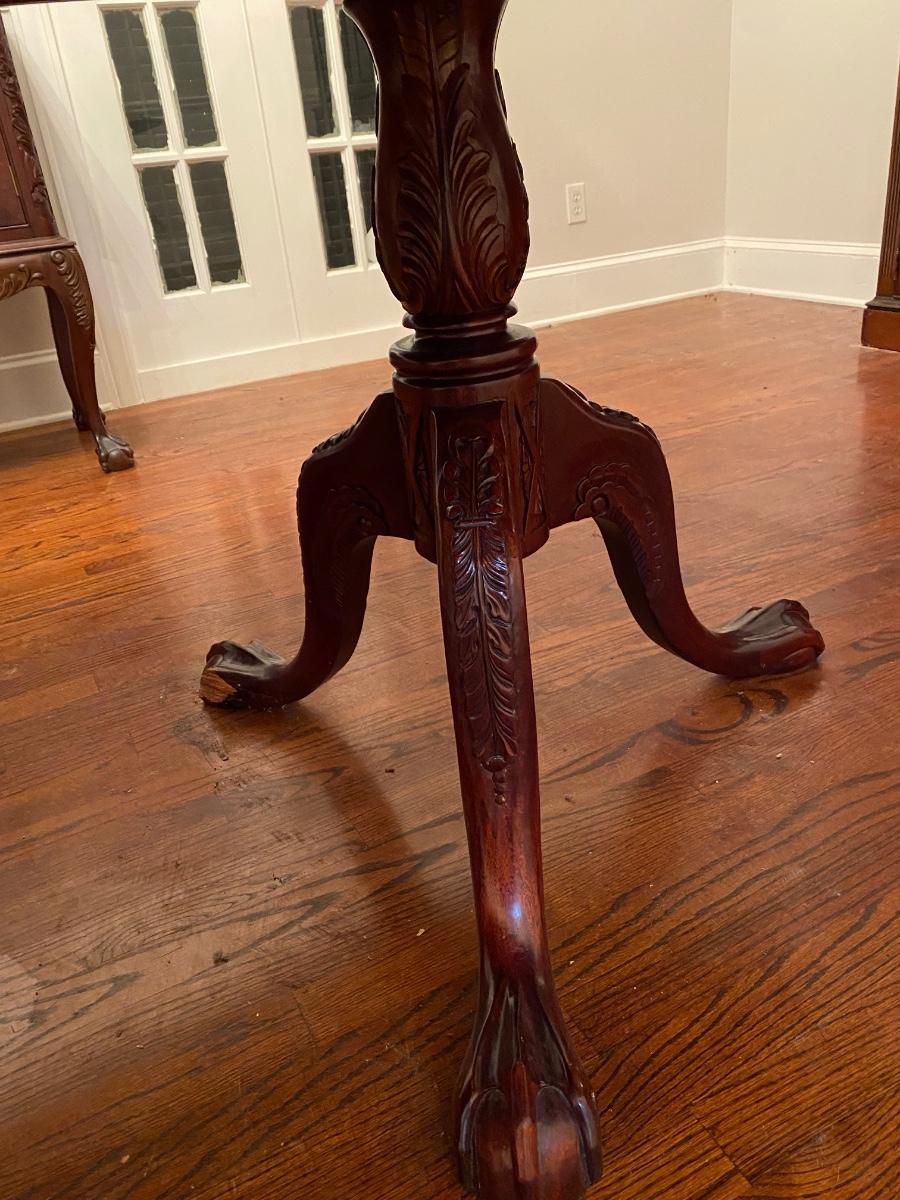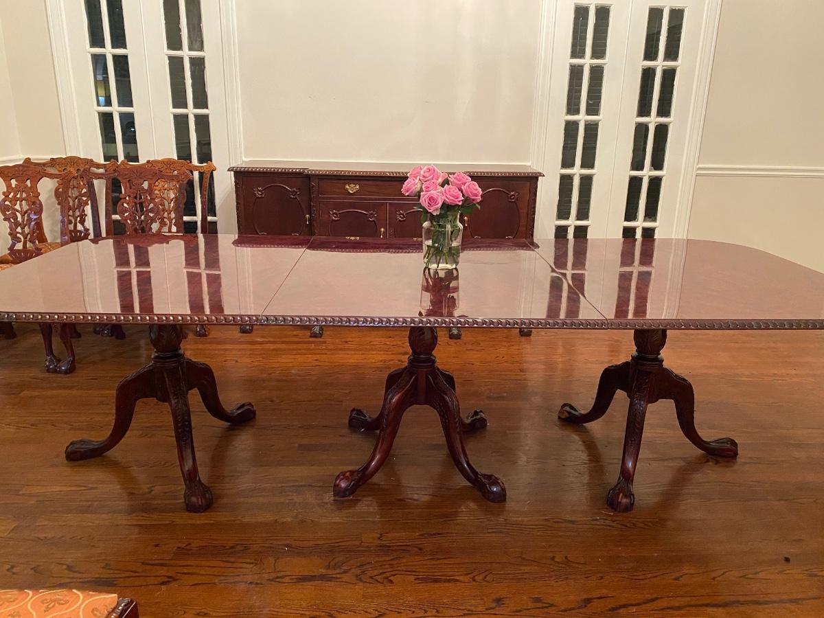 European banquet table, book matched mahogany with 3 leaves. This is an exquisite table. Original price $12,000. Total length with all 3 leaves is approx 12’ x 4’ w. Center leaf is 31-1/2” and additional lealves are 19” ea. The base consists of 3 claw-foot pedestals. One foot has a chip on the inside, not very noticeable. Otherwise in beautiful condition
