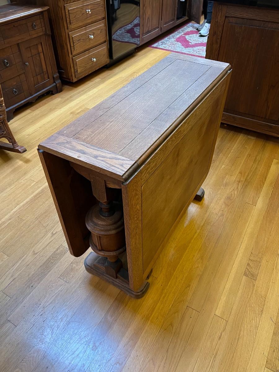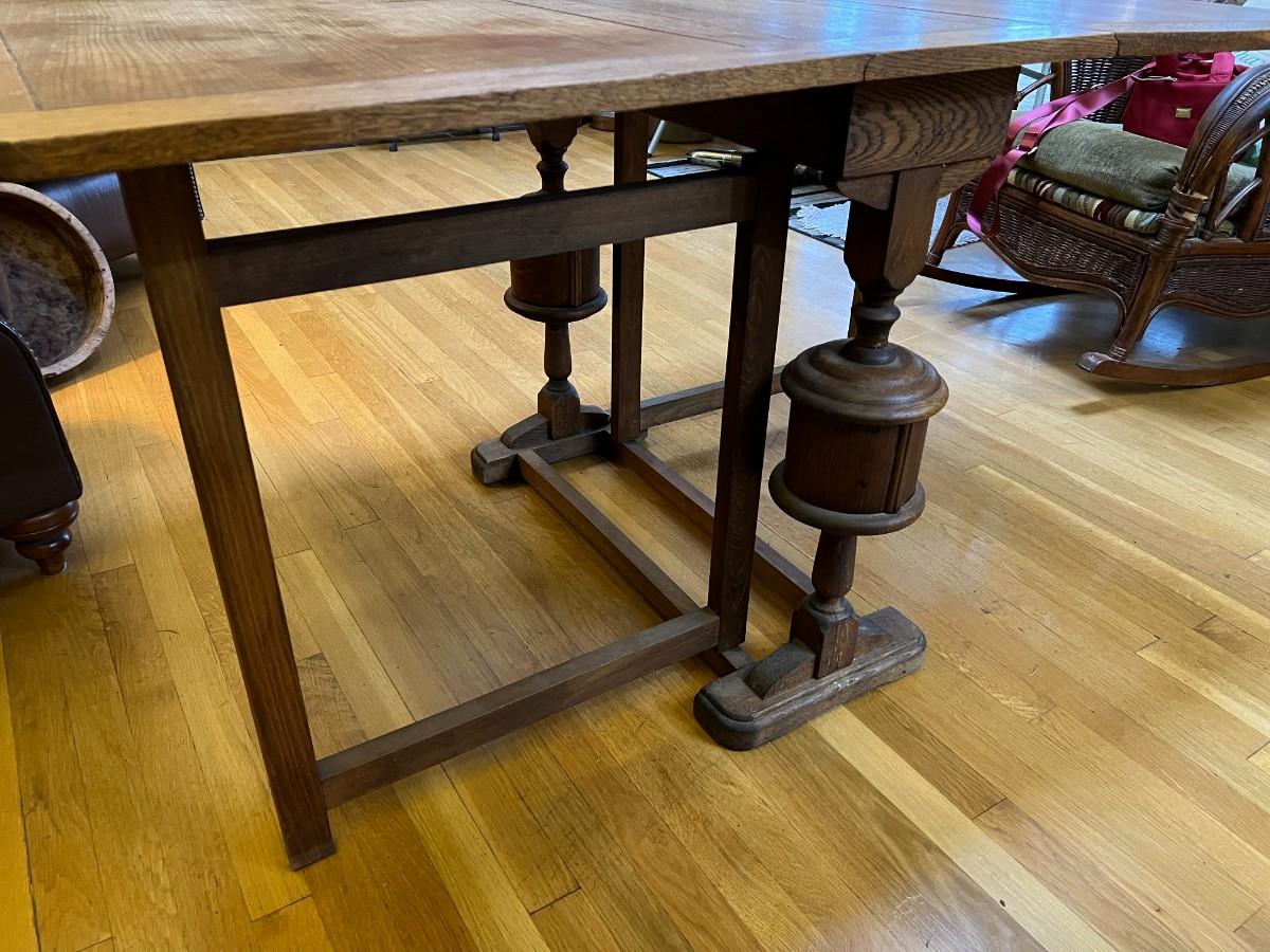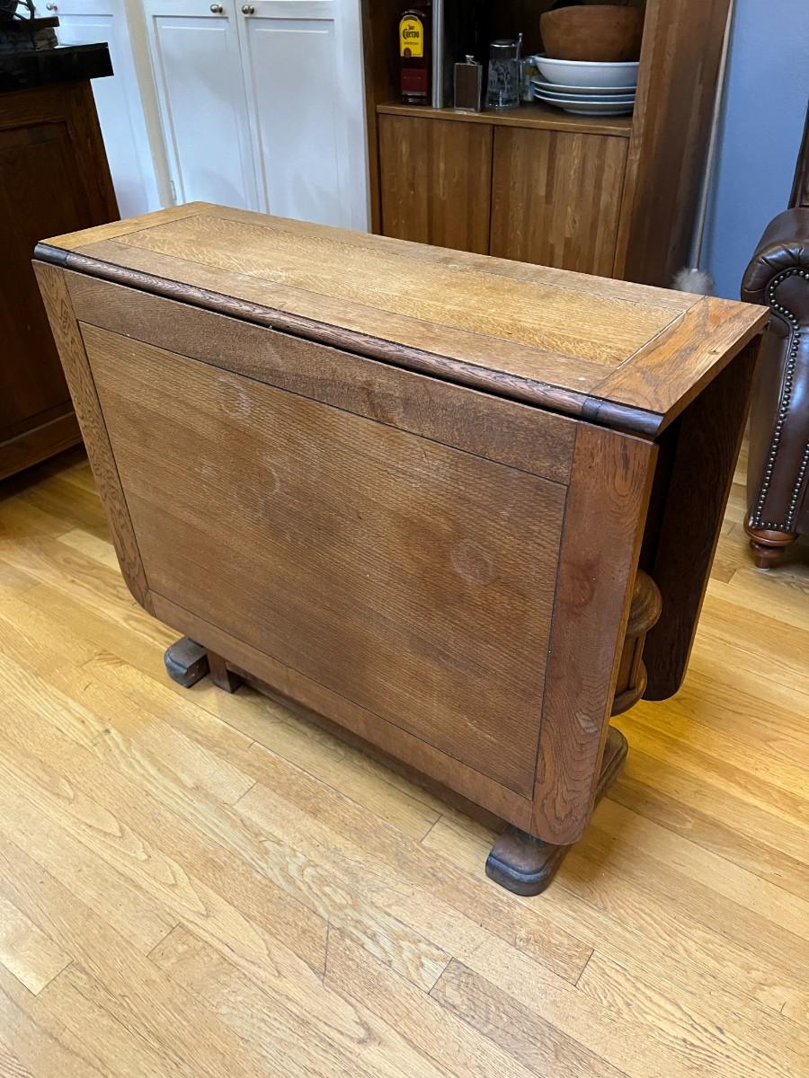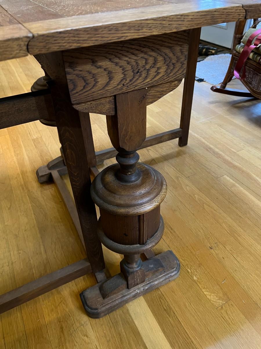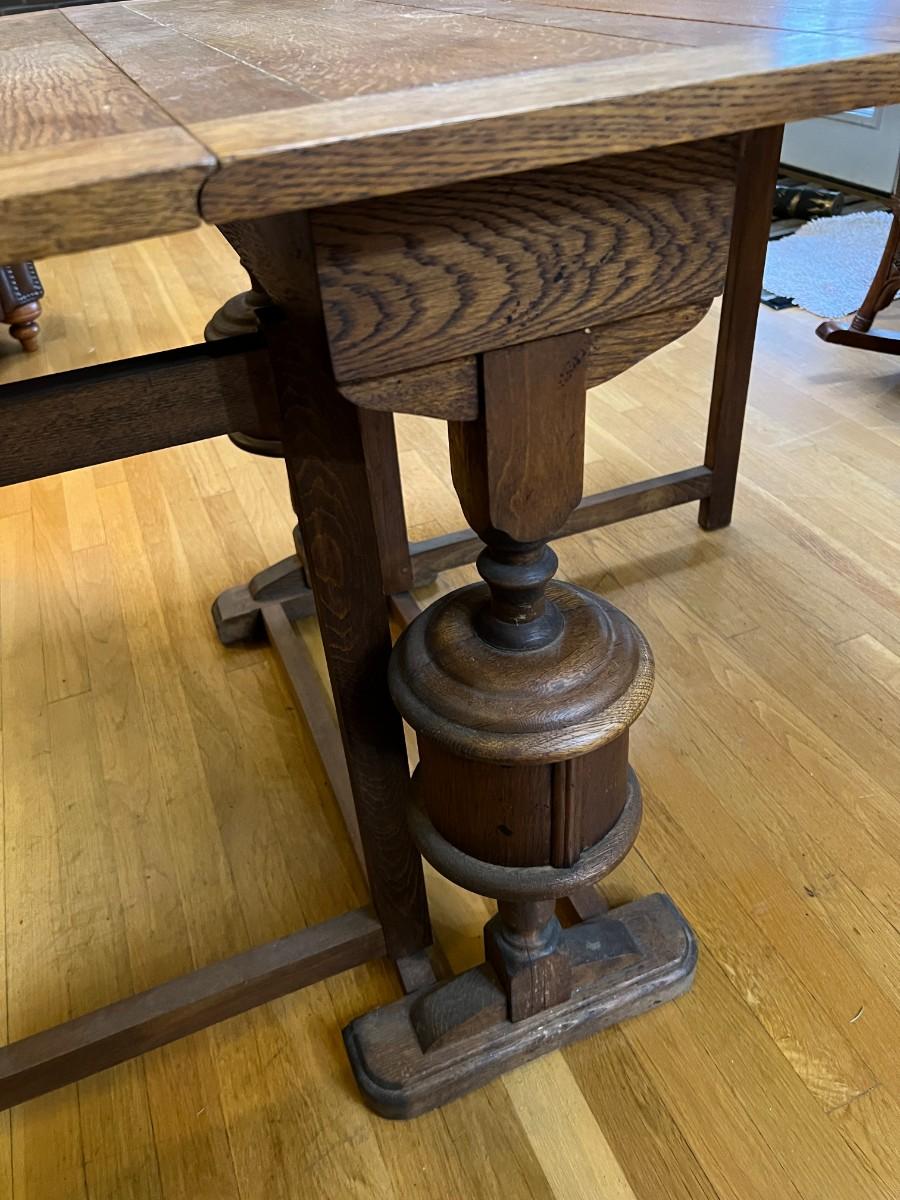 Antique Expandable Wood Dining or Kitchen Table. Beautiful details carved into the center legs. Collapses on both sides, creating a compact table for storage when you don't need it. In good condition, with signs of wear (as shown in images).