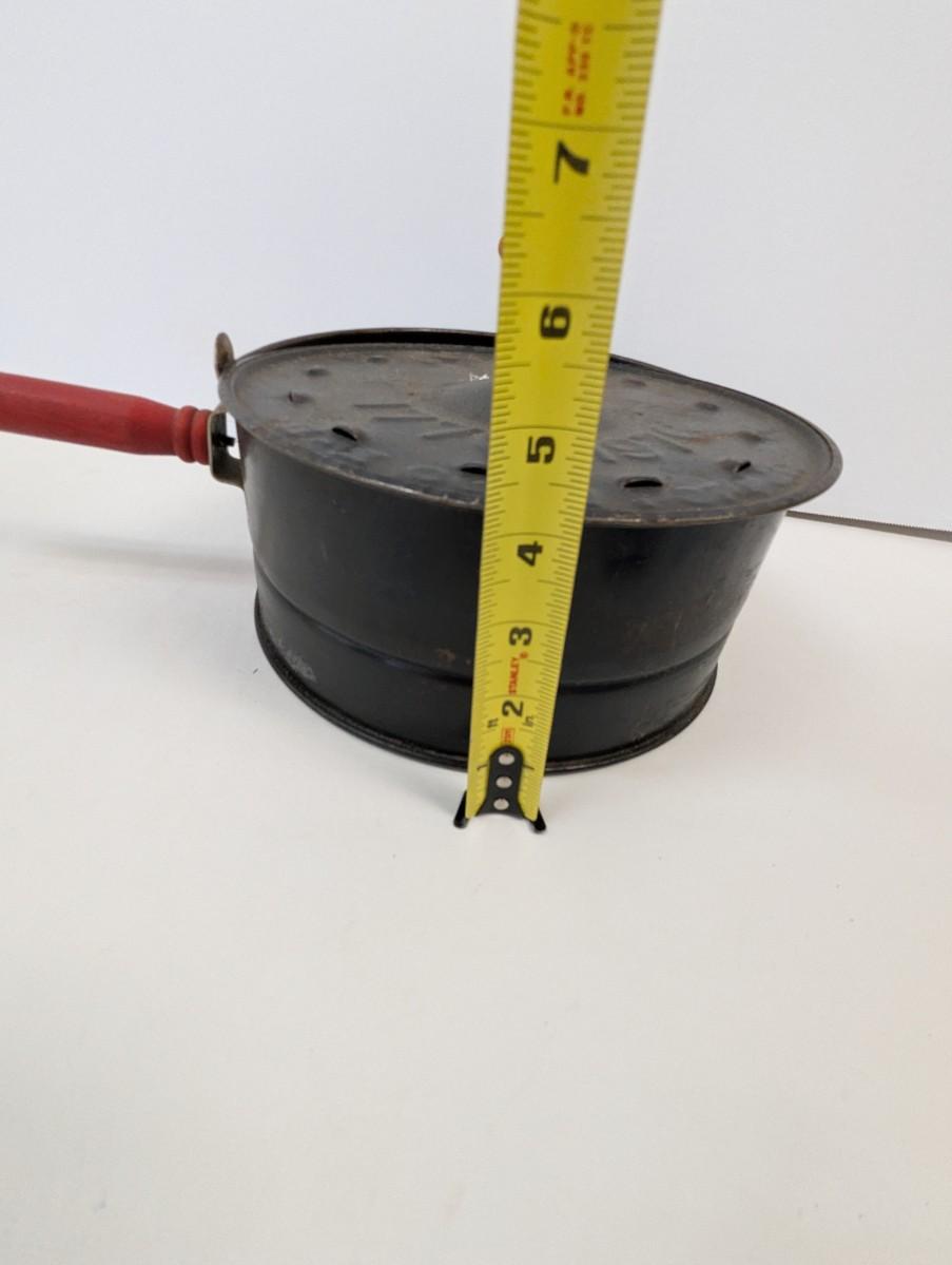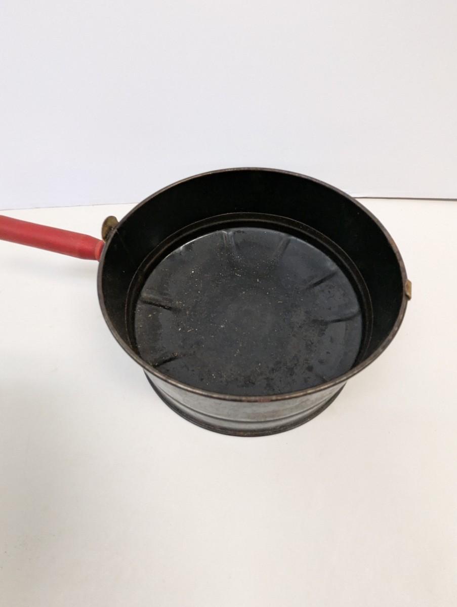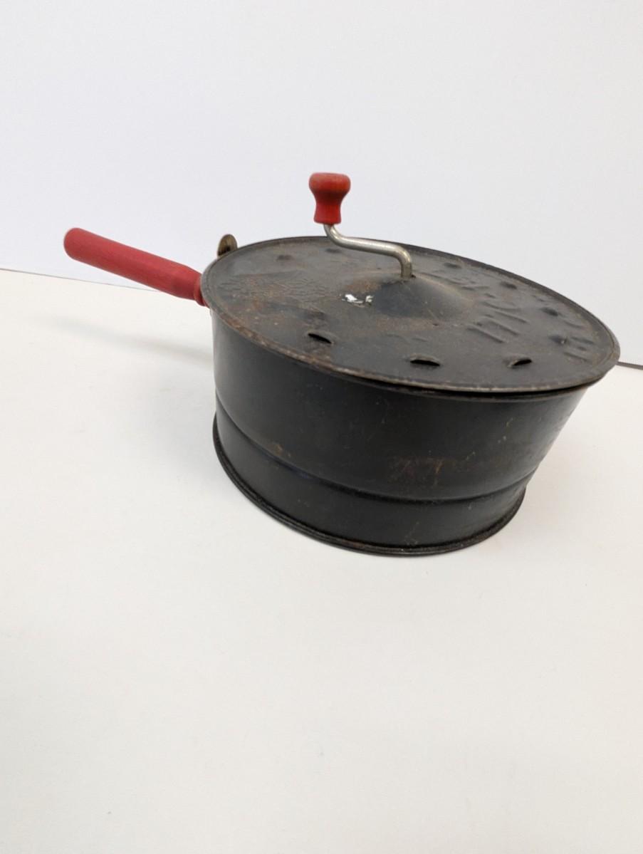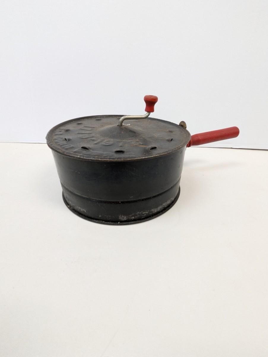 This Antique E-Z Corn Popper is a vintage collectible metalware item from the United States, dating back to the early 20th century. The corn popper features red handles, adding a pop of color to its antique design. This original piece is perfect for camping trips or can be used with a wood stove to pop corn the old-fashioned way, making it both functional and charming for any outdoor setting. This unique and handmade corn popper is a nostalgic addition to any collection of vintage kitchen tools or camping gear.