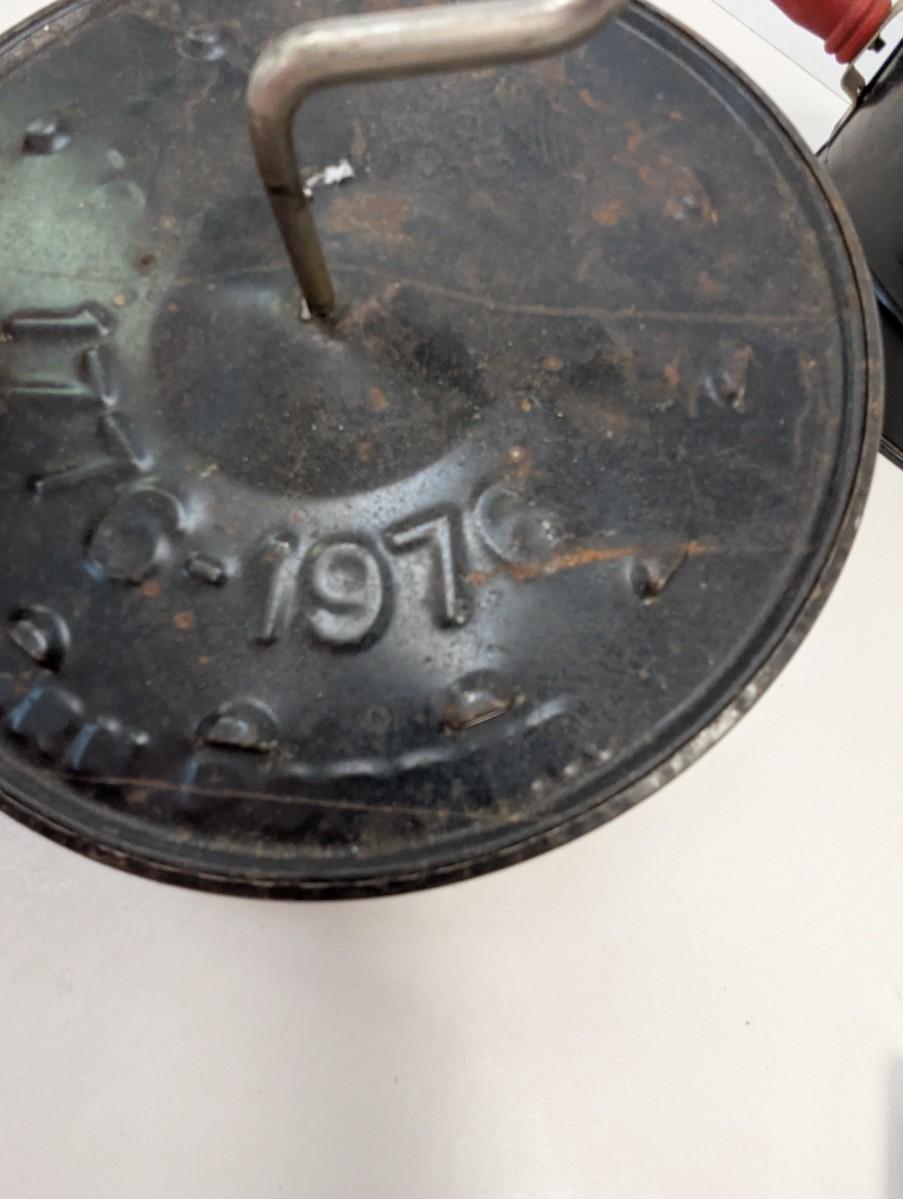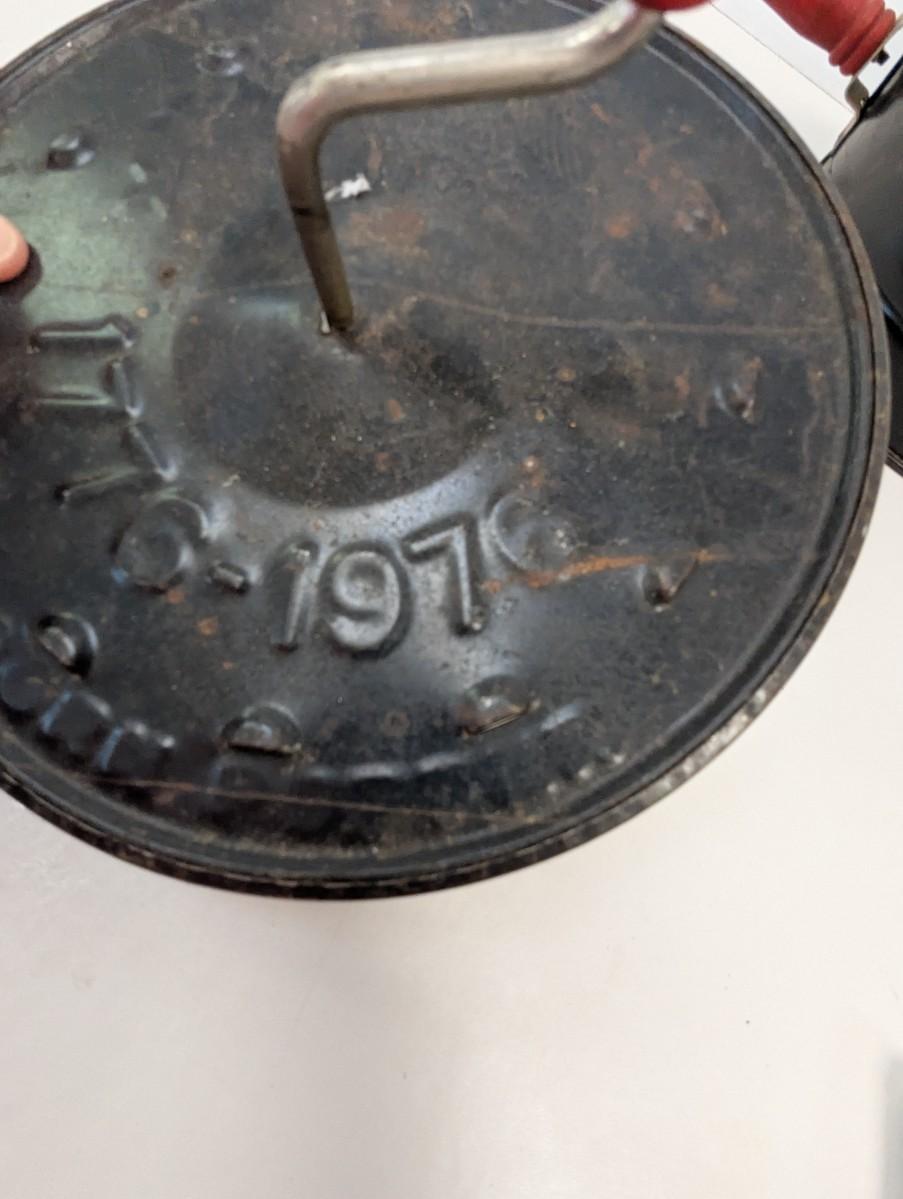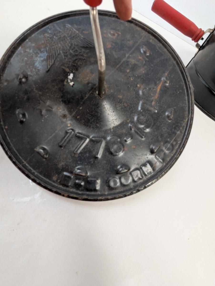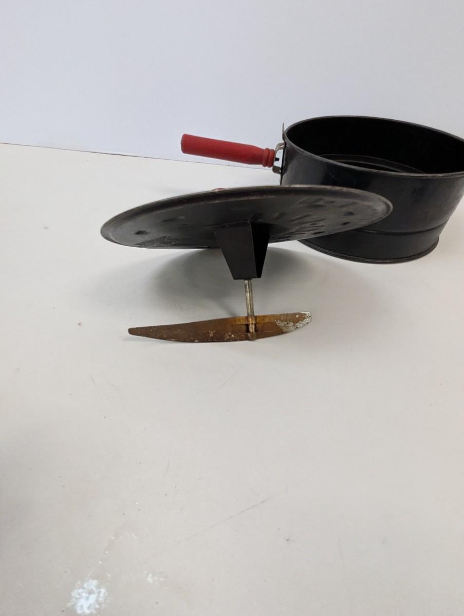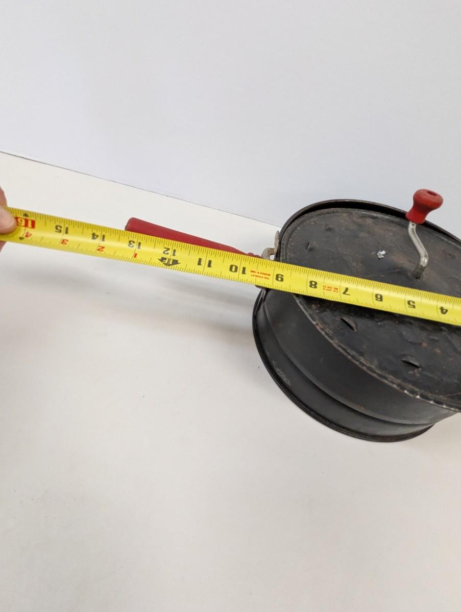 This Antique E-Z Corn Popper is a vintage collectible metalware item from the United States, dating back to the early 20th century. The corn popper features red handles, adding a pop of color to its antique design. This original piece is perfect for camping trips or can be used with a wood stove to pop corn the old-fashioned way, making it both functional and charming for any outdoor setting. This unique and handmade corn popper is a nostalgic addition to any collection of vintage kitchen tools or camping gear.