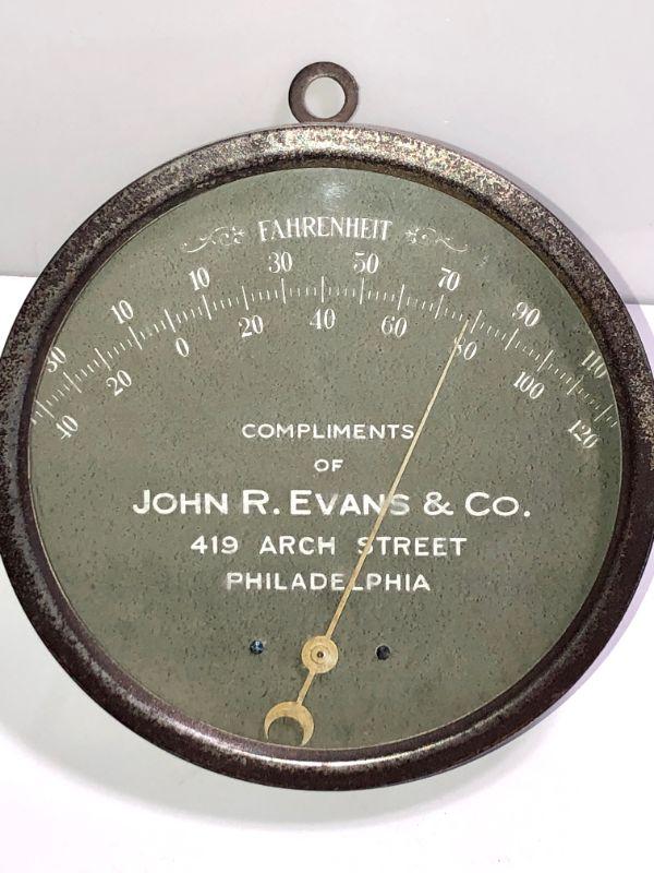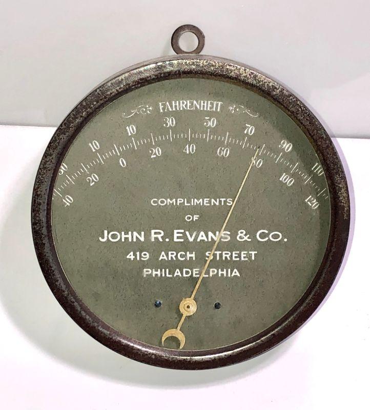 Antique Advertising Round Thermometer. Compliments of John R. Evans & Co, 419 Arch Street Philadelphia. 6" Diameter. Flat Rate Shipping/Handling for this lot is $20.00 which includes insurance.