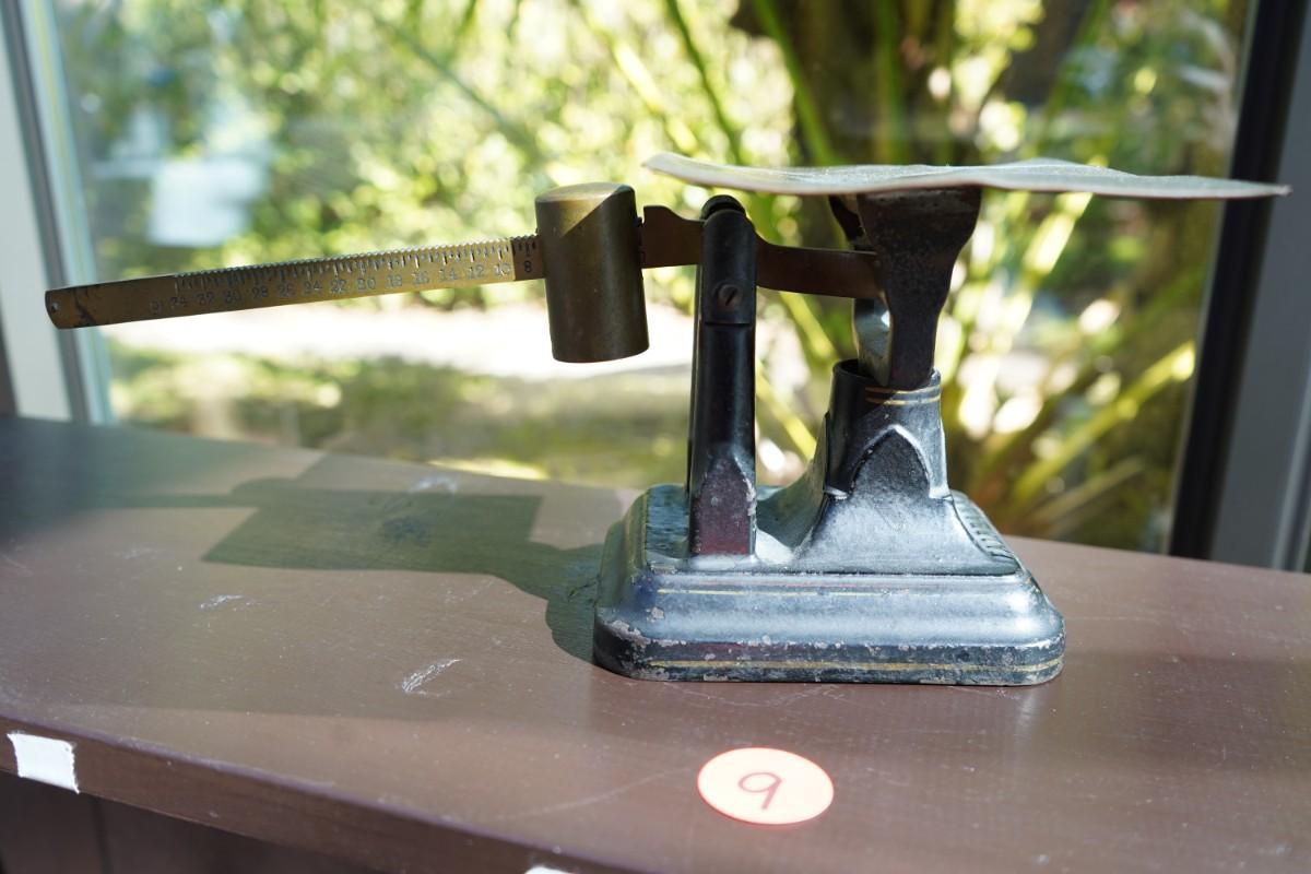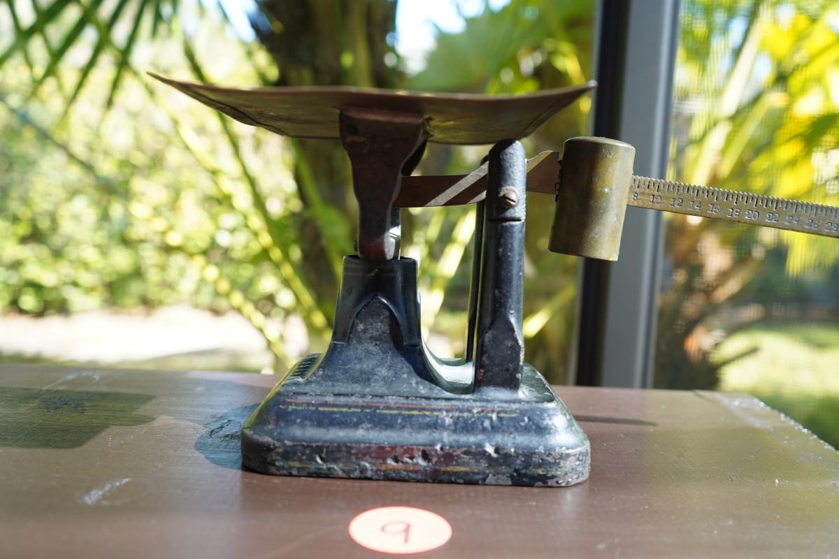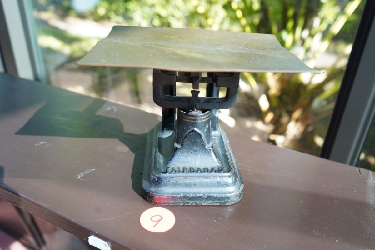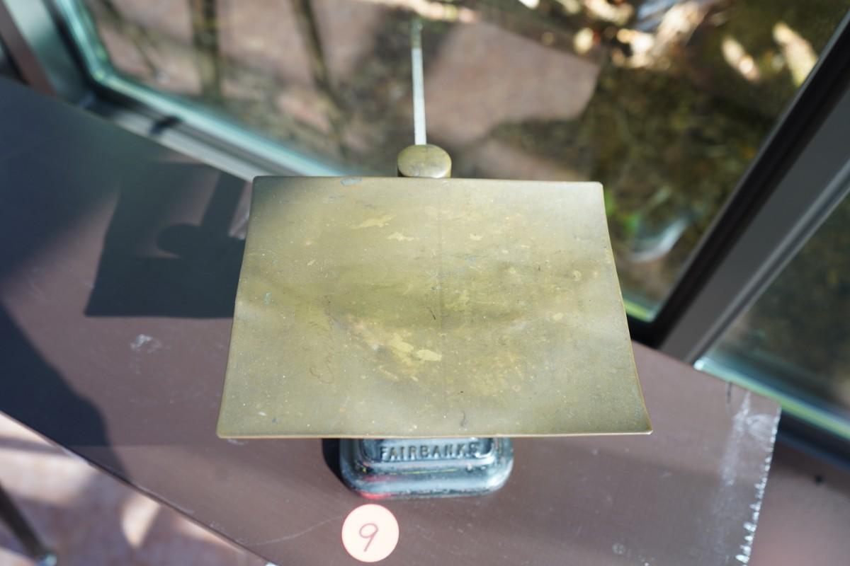 With brass try, arm and counterbalance weight. Marked Fairbanks on arm and body. Measures 14 W x 7.25 D x 5.75 H.