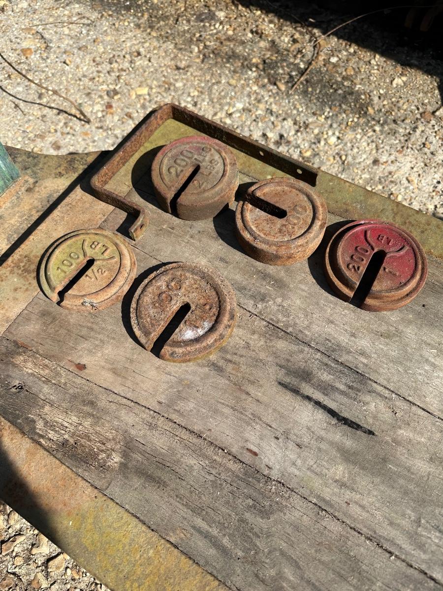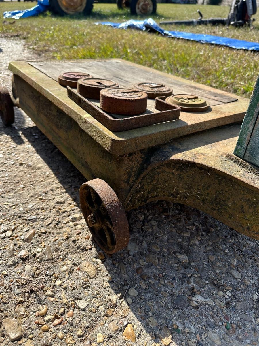 Original antique Fairbanks Standard platform scale, made in the USA. Heavy cast iron base with wood deck, green painted wood column, and original beam/arm hardware. Includes a set of cast iron weights (mixed denominations shown). This is a classic general store / feed store / agricultural scale, mounted on iron wheels for easy positioning. Beautiful aged patina throughout. This has been covered with a tarp and out of the weather.