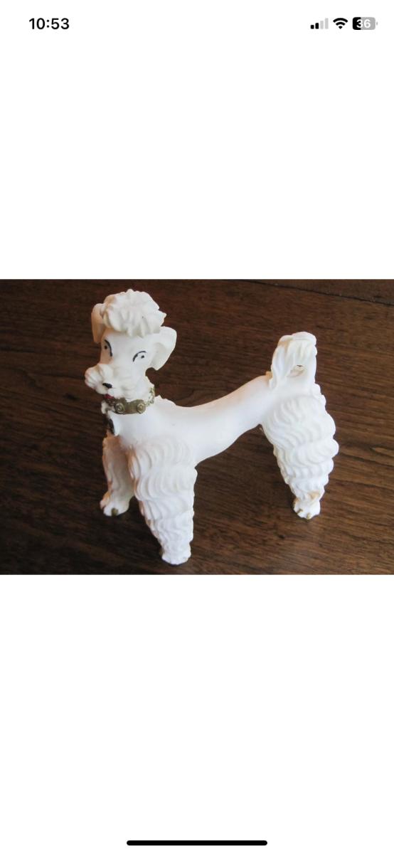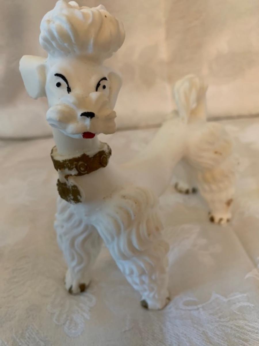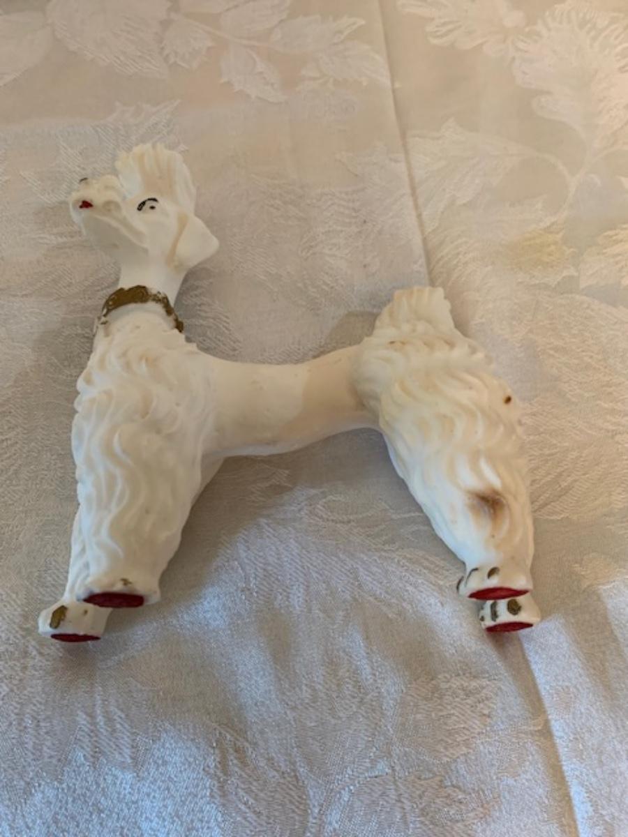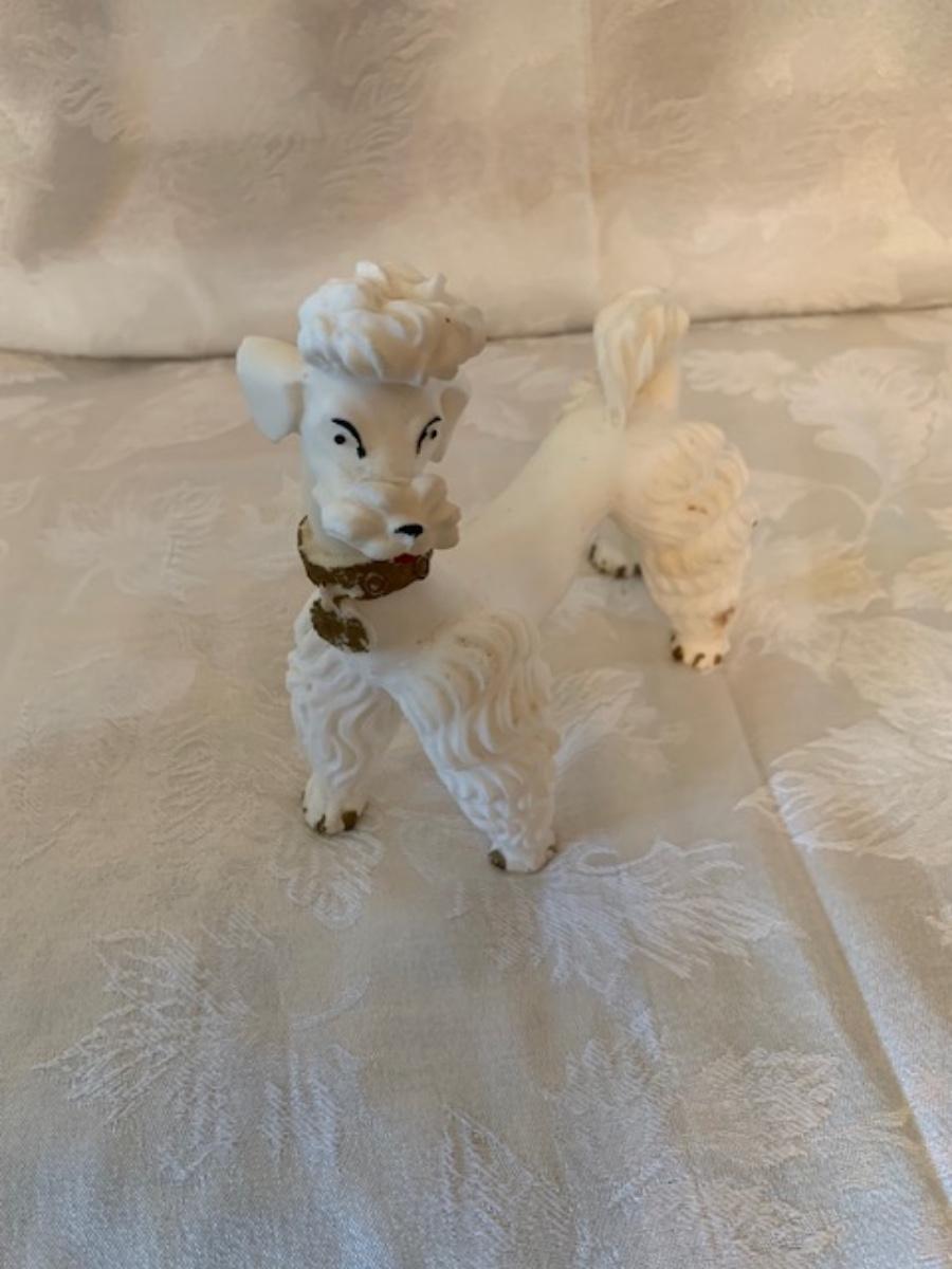 Antique fancy show porcelain poodle figurine. 6-1/2"L x 7-1/4"H, 3"